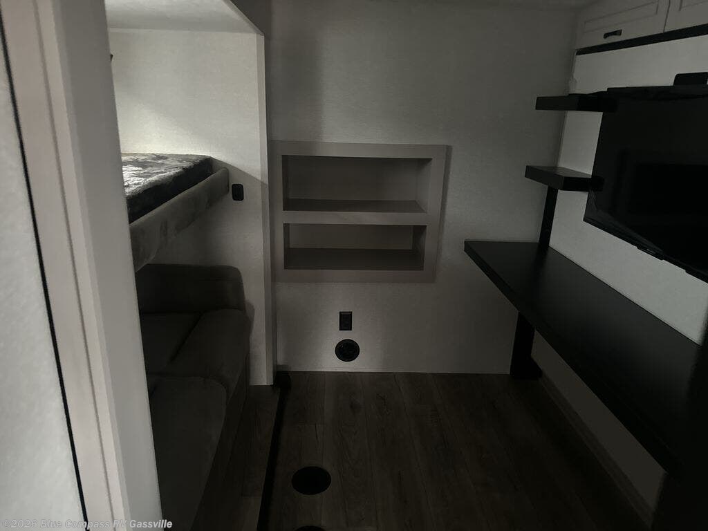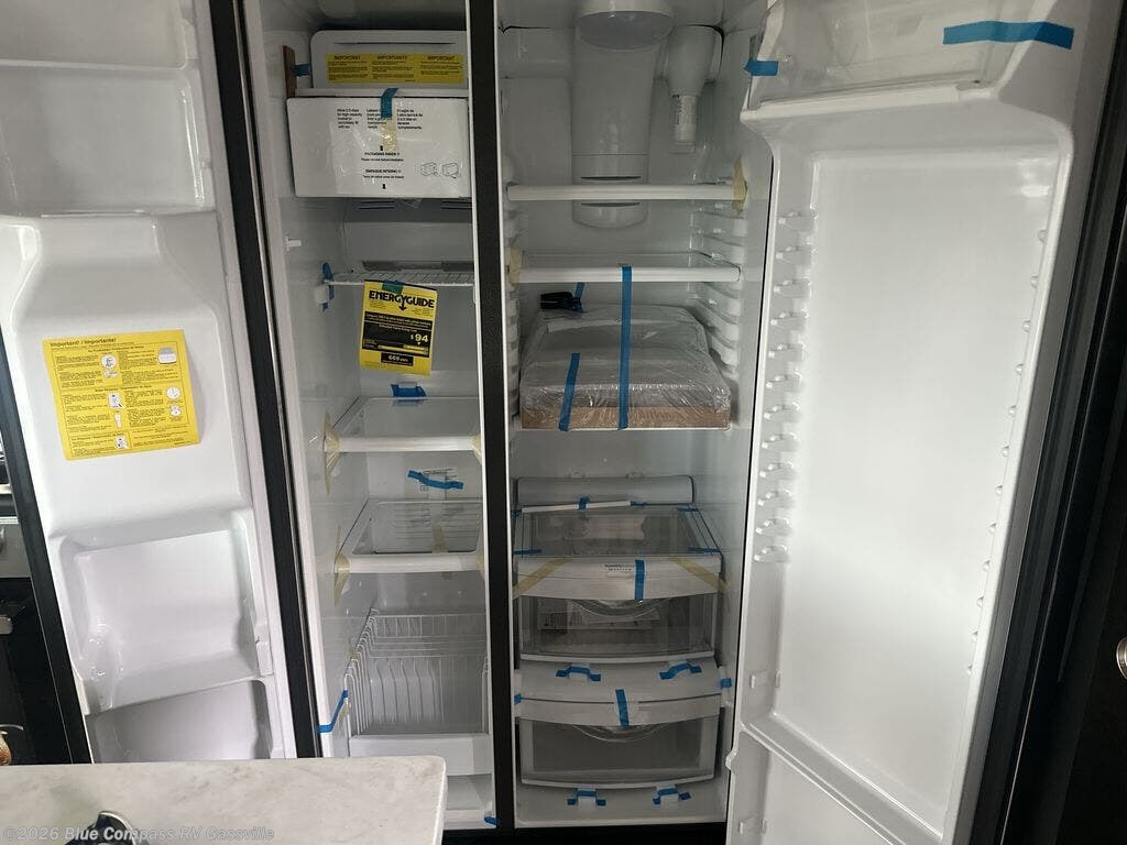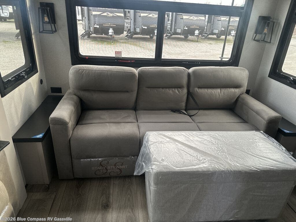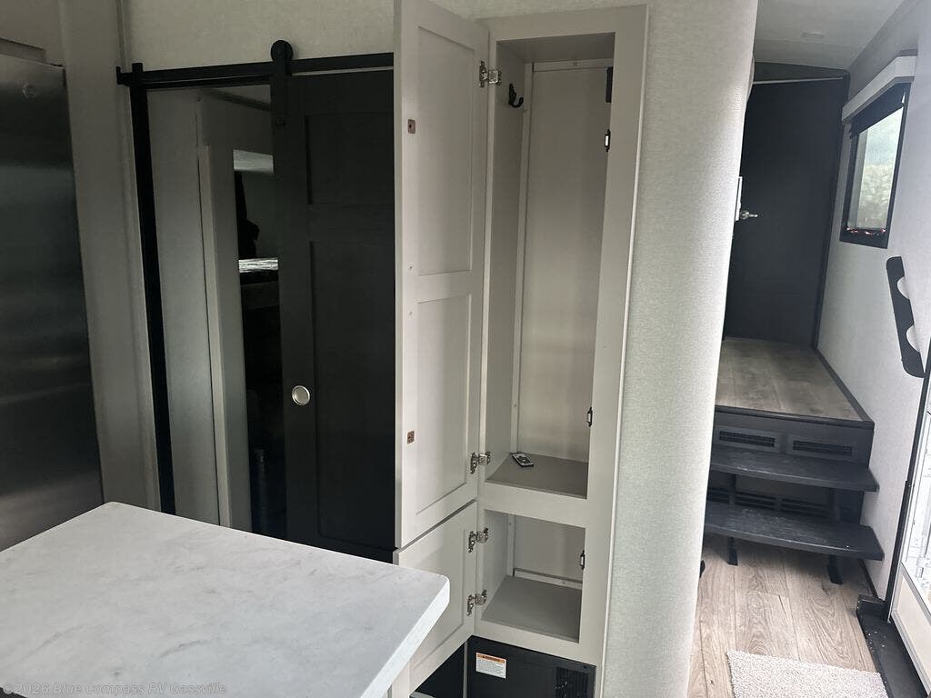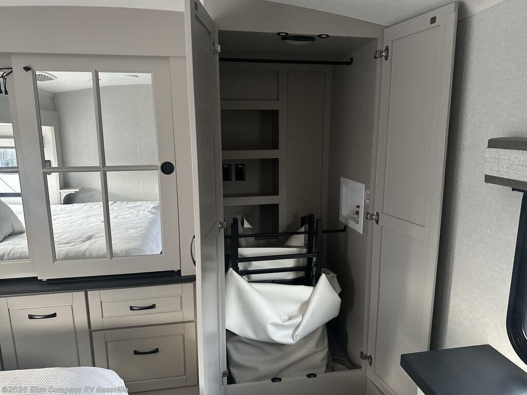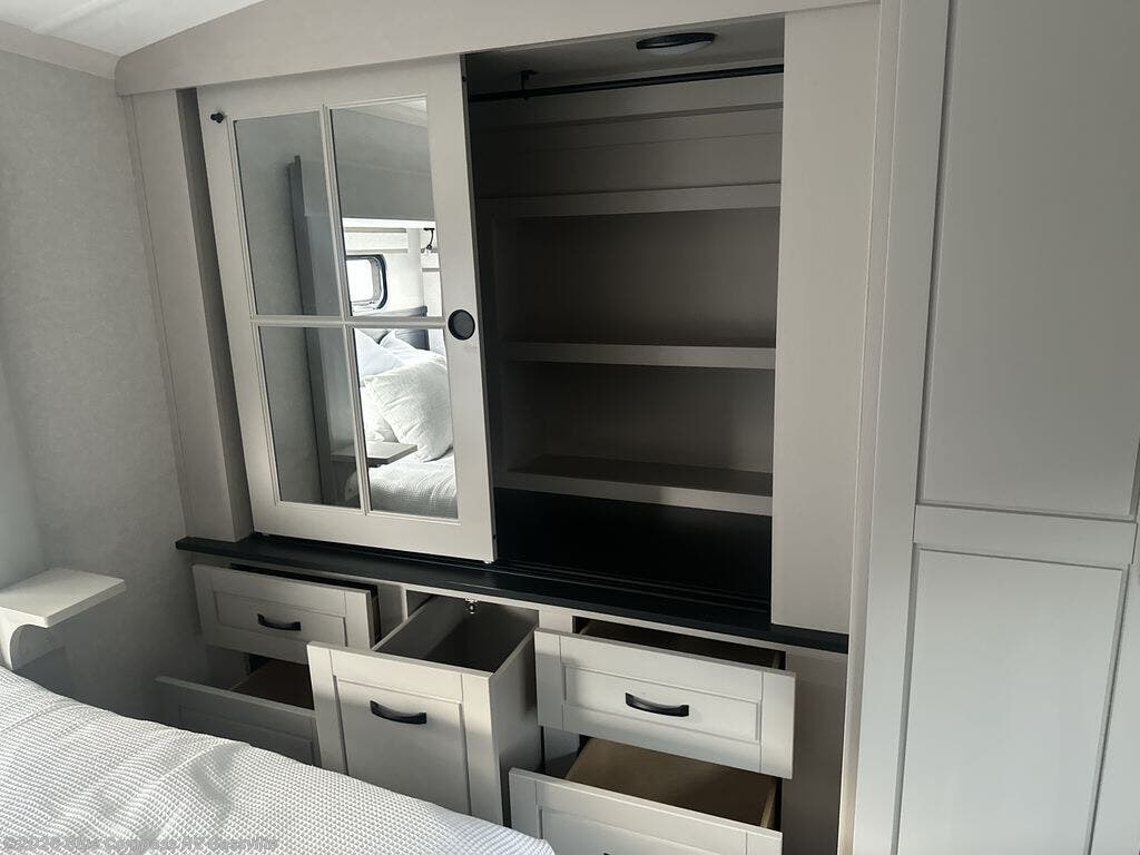 You can work from anywhere with this fifth wheel thanks to the middle bonus room that offers a desk with TV above, a tri-fold sofa with removable table, a flip-up bunk and a murphy bed. This multi-use room works for just about anything including an extra living area and bunkhouse. The linen cabinet in the full bathroom, the drawers / hamper in the bedroom, and the overhead cabinets plus multiple shelves throughout the floorplan allows you to bring whatever you want. Enjoy cooking in the kitchen that provides an island with a flip-up butcher block, a residential refrigerator, a pantry, and everything you need to keep everyone fed. The theater seats and the tri-fold sofa are great places to sit while watching the 4K Smart LED HDTV with fully digital HDMI output and home entertainment system with subwoofer.