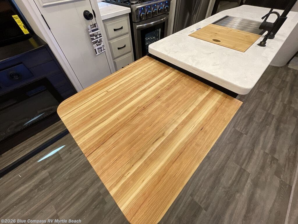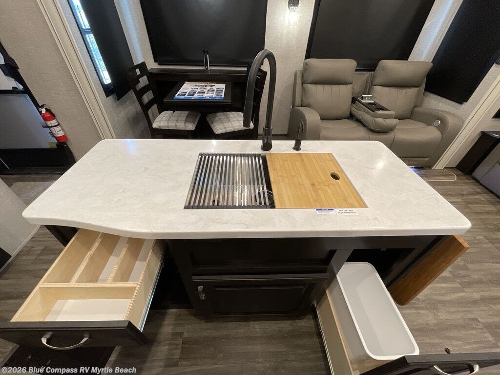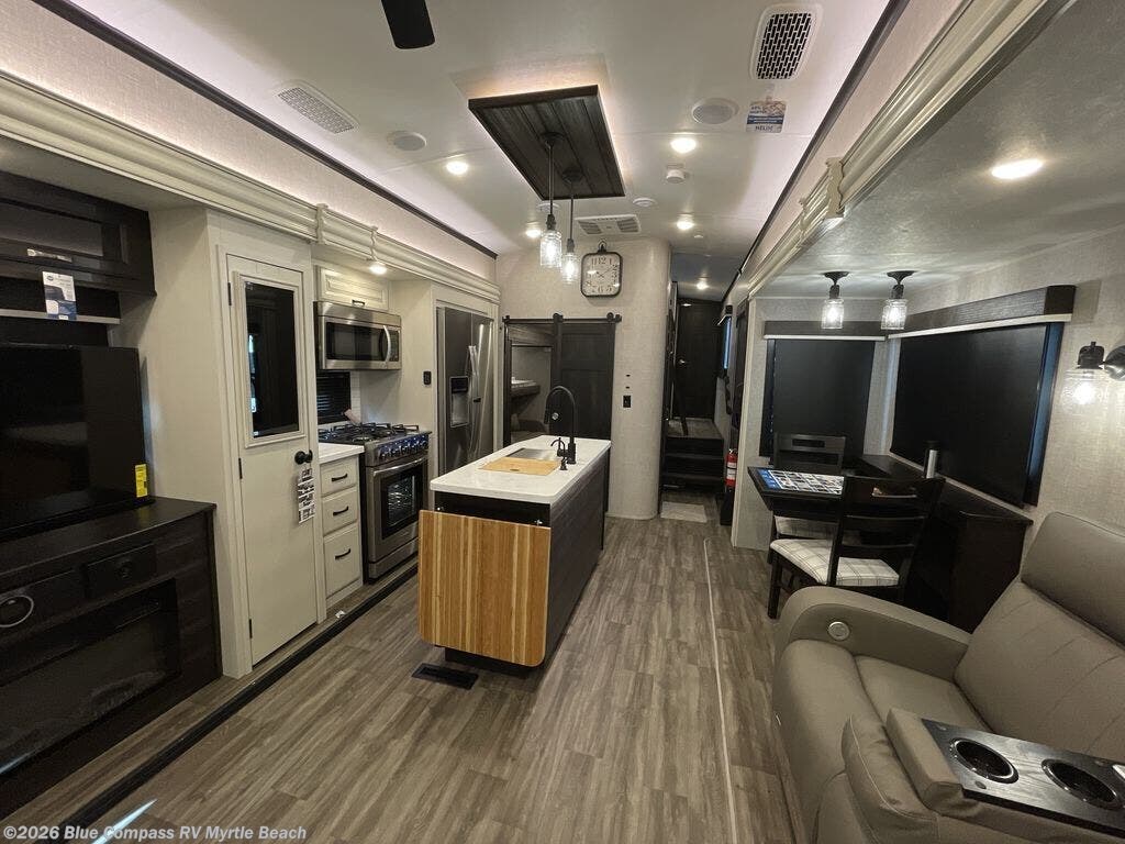 You can work from anywhere with this fifth wheel thanks to the middle bonus room that offers a desk with TV above, a tri-fold sofa with removable table, a flip-up bunk and a murphy bed. This multi-use room works for just about anything including an extra living area and bunkhouse. The linen cabinet in the full bathroom, the drawers / hamper in the bedroom, and the overhead cabinets plus multiple shelves throughout the floorplan allows you to bring whatever you want. Enjoy cooking in the kitchen that provides an island with a flip-up butcher block, a residential refrigerator, a pantry, and everything you need to keep everyone fed. The theater seats and the tri-fold sofa are great places to sit while watching the 4K Smart LED HDTV with fully digital HDMI output and home entertainment system with subwoofer.