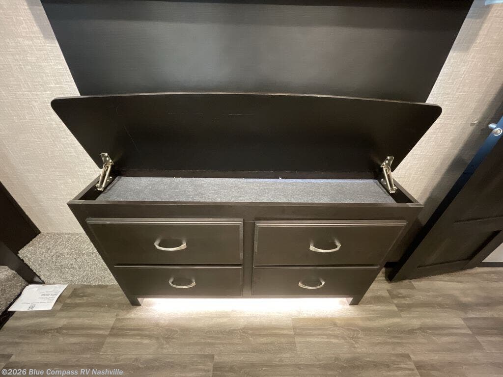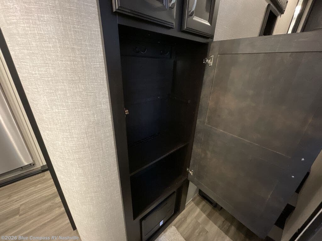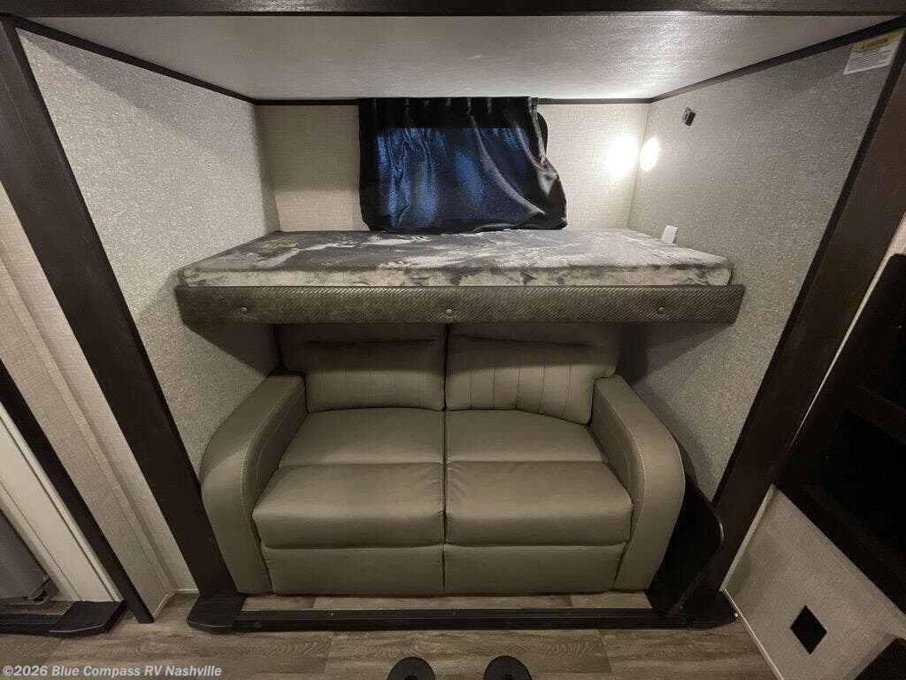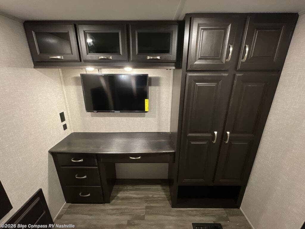 You can work from anywhere with this fifth wheel thanks to the middle bonus room that offers a desk with TV above, a tri-fold sofa with removable table, a flip-up bunk and a murphy bed. This multi-use room works for just about anything including an extra living area and bunkhouse. The linen cabinet in the full bathroom, the drawers / hamper in the bedroom, and the overhead cabinets plus multiple shelves throughout the floorplan allows you to bring whatever you want. Enjoy cooking in the kitchen that provides an island with a flip-up butcher block, a residential refrigerator, a pantry, and everything you need to keep everyone fed. The theater seats and the tri-fold sofa are great places to sit while watching the 4K Smart LED HDTV with fully digital HDMI output and home entertainment system with subwoofer.