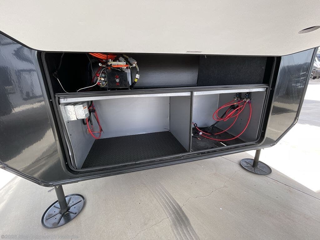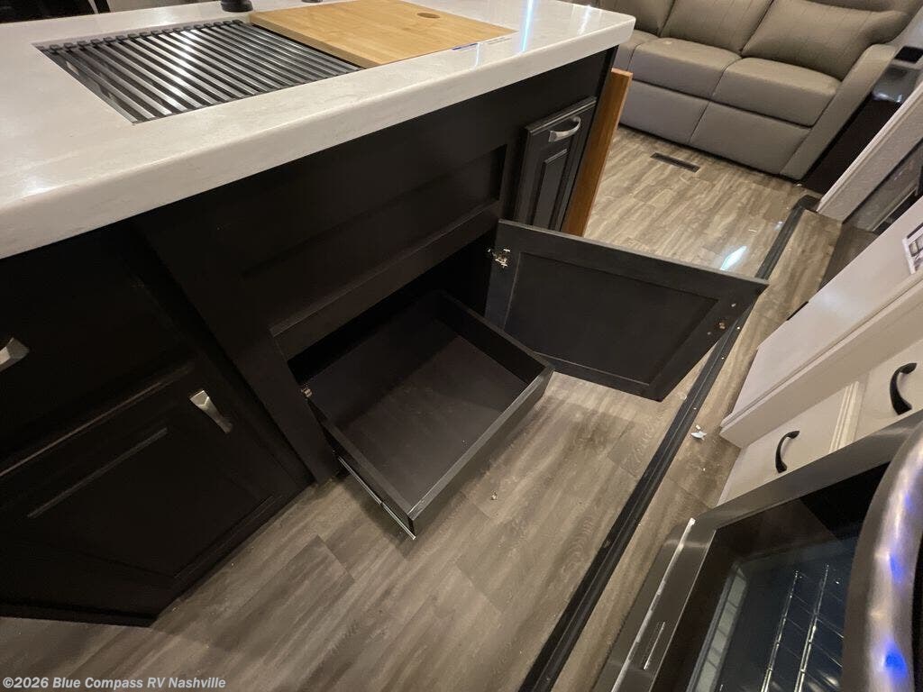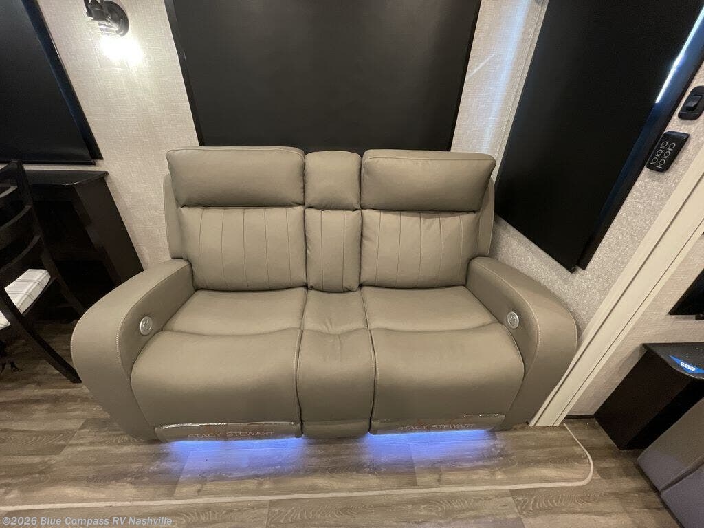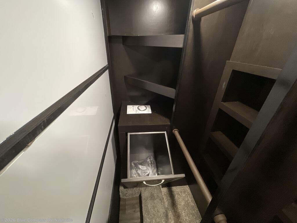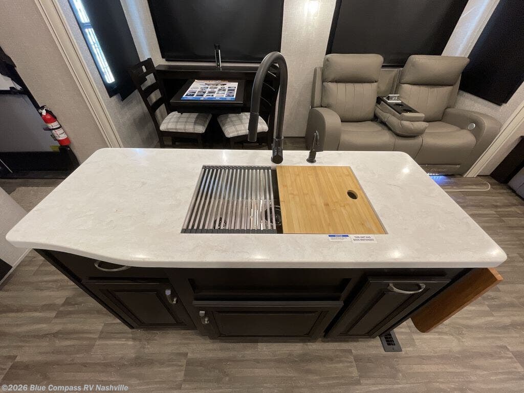 You can work from anywhere with this fifth wheel thanks to the middle bonus room that offers a desk with TV above, a tri-fold sofa with removable table, a flip-up bunk and a murphy bed. This multi-use room works for just about anything including an extra living area and bunkhouse. The linen cabinet in the full bathroom, the drawers / hamper in the bedroom, and the overhead cabinets plus multiple shelves throughout the floorplan allows you to bring whatever you want. Enjoy cooking in the kitchen that provides an island with a flip-up butcher block, a residential refrigerator, a pantry, and everything you need to keep everyone fed. The theater seats and the tri-fold sofa are great places to sit while watching the 4K Smart LED HDTV with fully digital HDMI output and home entertainment system with subwoofer.