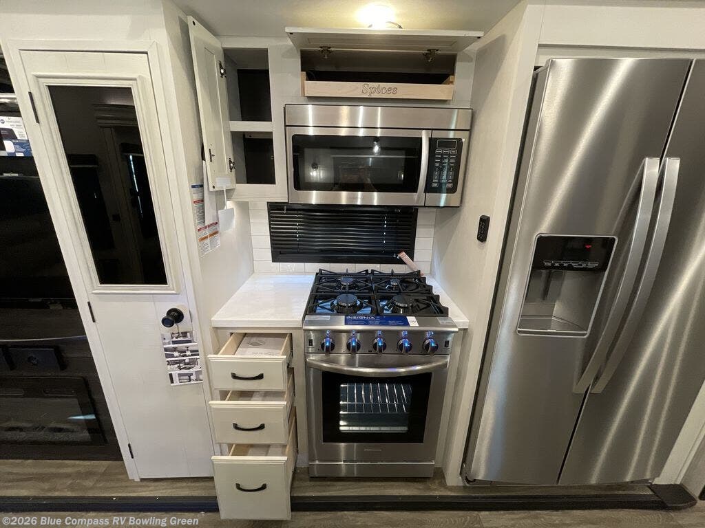 You can work from anywhere with this fifth wheel thanks to the middle bonus room that offers a desk with TV above, a tri-fold sofa with removable table, a flip-up bunk and a murphy bed. This multi-use room works for just about anything including an extra living area and bunkhouse. The linen cabinet in the full bathroom, the drawers / hamper in the bedroom, and the overhead cabinets plus multiple shelves throughout the floorplan allows you to bring whatever you want. Enjoy cooking in the kitchen that provides an island with a flip-up butcher block, a residential refrigerator, a pantry, and everything you need to keep everyone fed. The theater seats and the tri-fold sofa are great places to sit while watching the 4K Smart LED HDTV with fully digital HDMI output and home entertainment system with subwoofer.