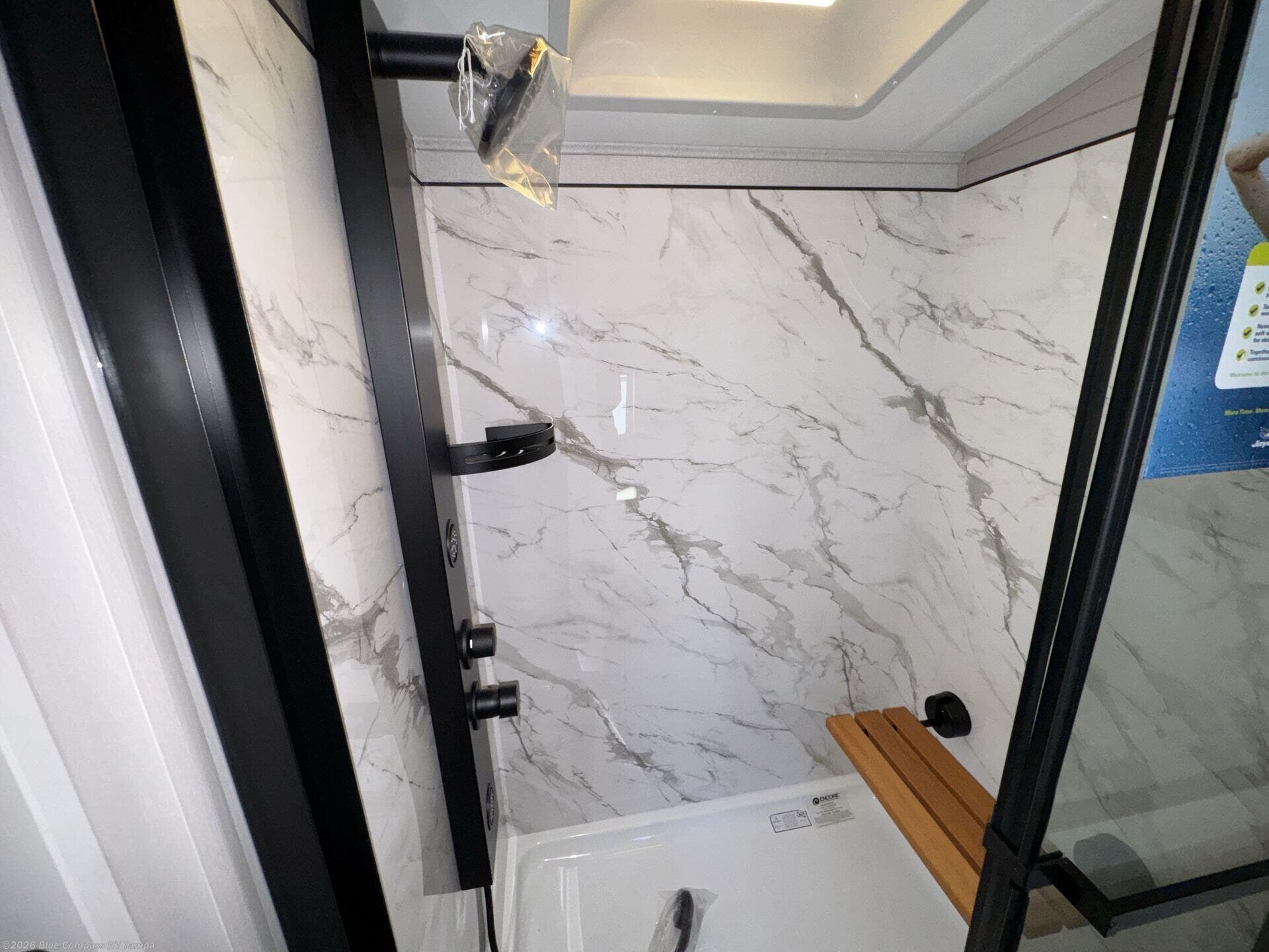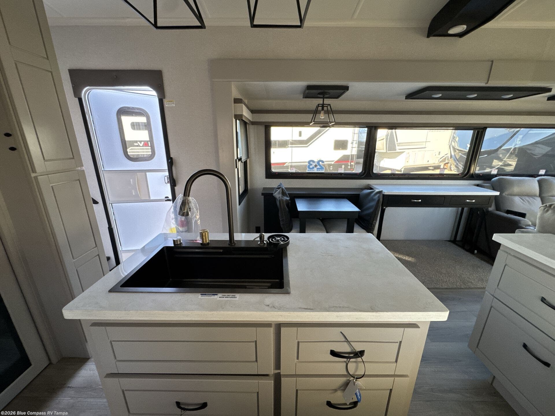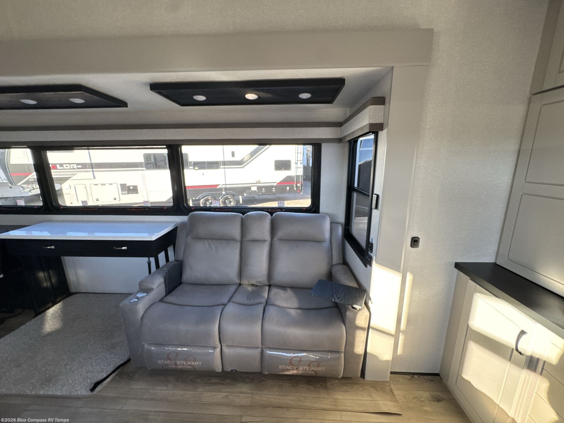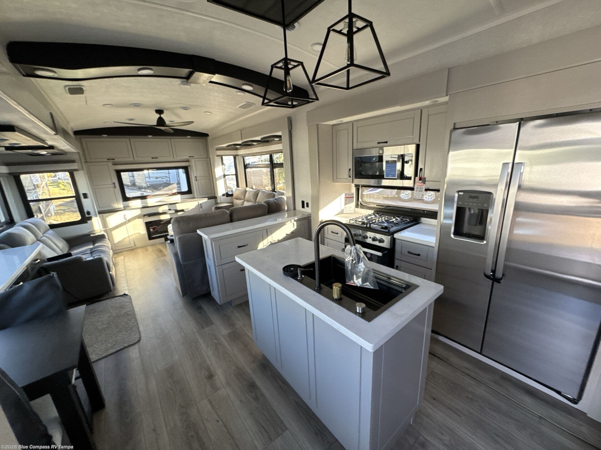Prepare for great adventures in this fifth wheel! The rear living area features a massive L-shaped sofa which includes a hide-a-bed as well as recliner seats! Plus there's an additional theater seat all facing the entertainment center with a fireplace and 50" Smart TV. A flexible desk/coffee bar connects the living room to the kitchen so you can work or relax as needed. Meals will be easy to prepare with the island with sink and pull-out cutting board, plus pantry, microwave, and residential refrigerator. Up front you will find the private bedroom with its king bed, closet with drawers and hamper, and even a second TV. The full bath features a shower with seat and a linen closet for convenient storage.