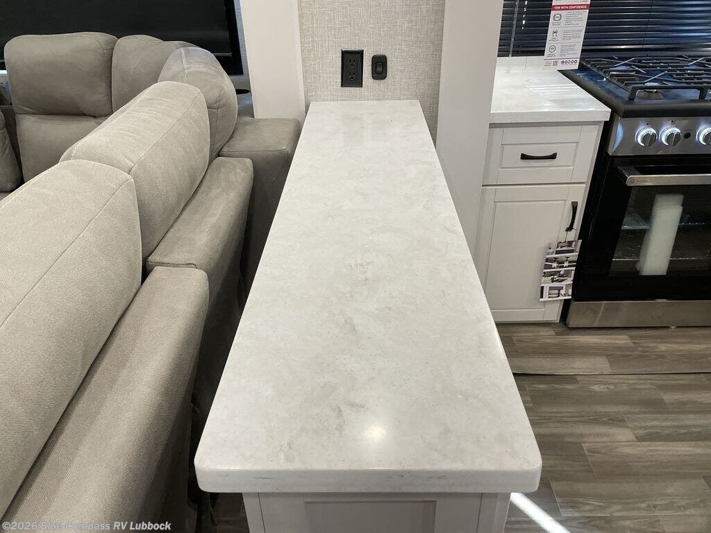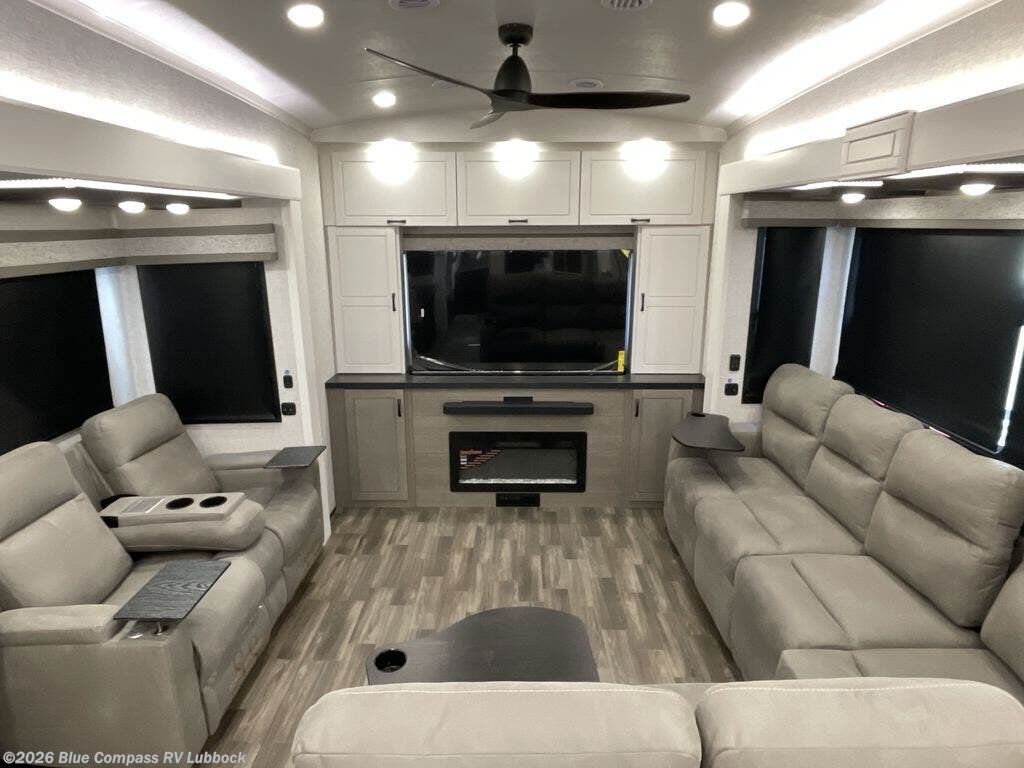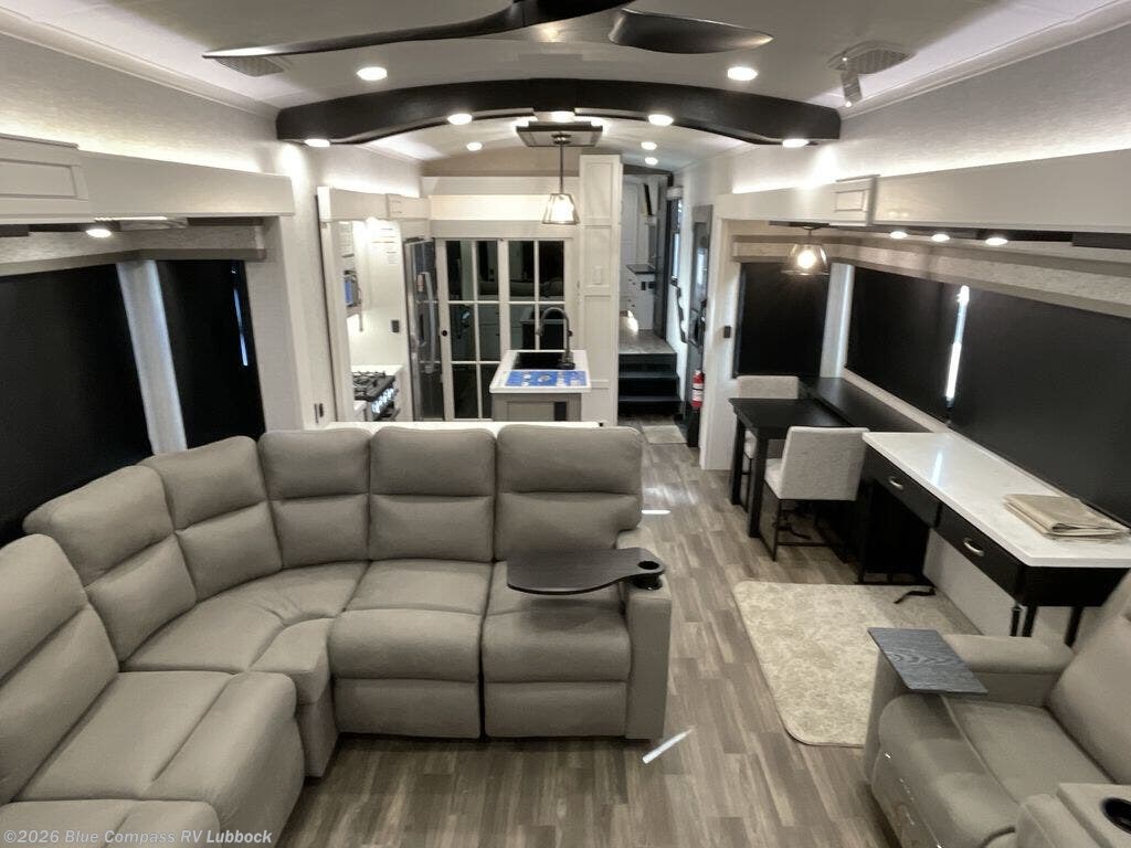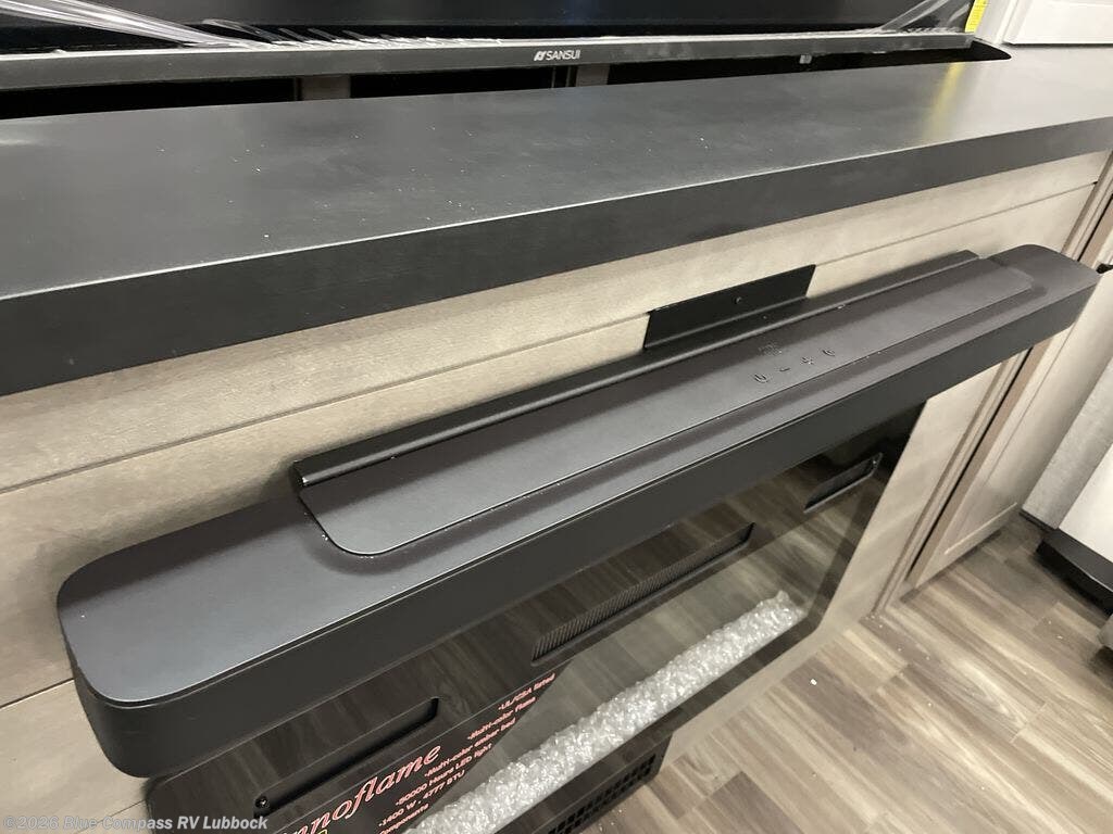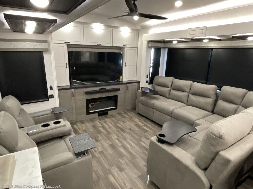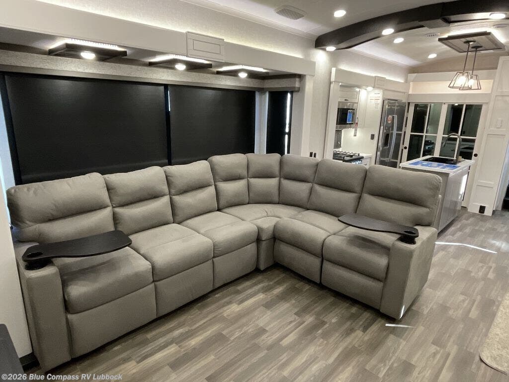 Prepare for great adventures in this fifth wheel! The rear living area features a massive L-shaped sofa which includes a hide-a-bed as well as recliner seats! Plus there's an additional theater seat all facing the entertainment center with a fireplace and 50" Smart TV. A flexible desk/coffee bar connects the living room to the kitchen so you can work or relax as needed. Meals will be easy to prepare with the island with sink and pull-out cutting board, plus pantry, microwave, and residential refrigerator. Up front you will find the private bedroom with its king bed, closet with drawers and hamper, and even a second TV. The full bath features a shower with seat and a linen closet for convenient storage.