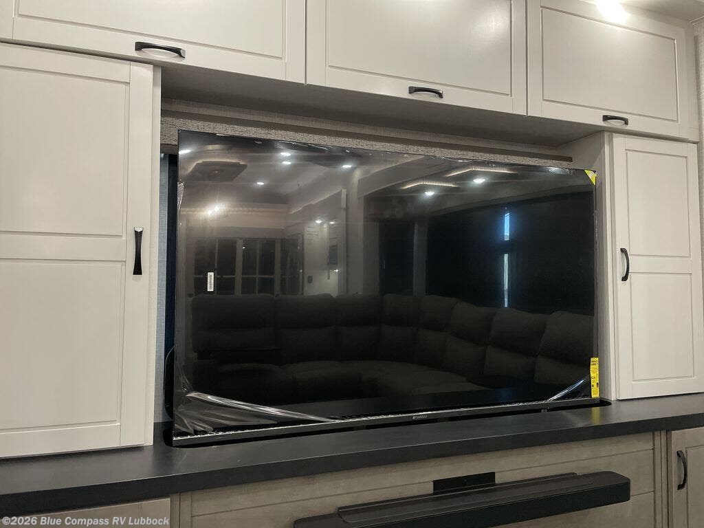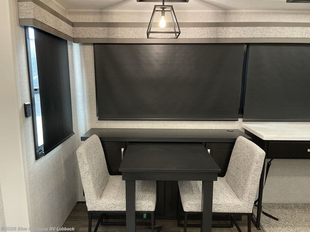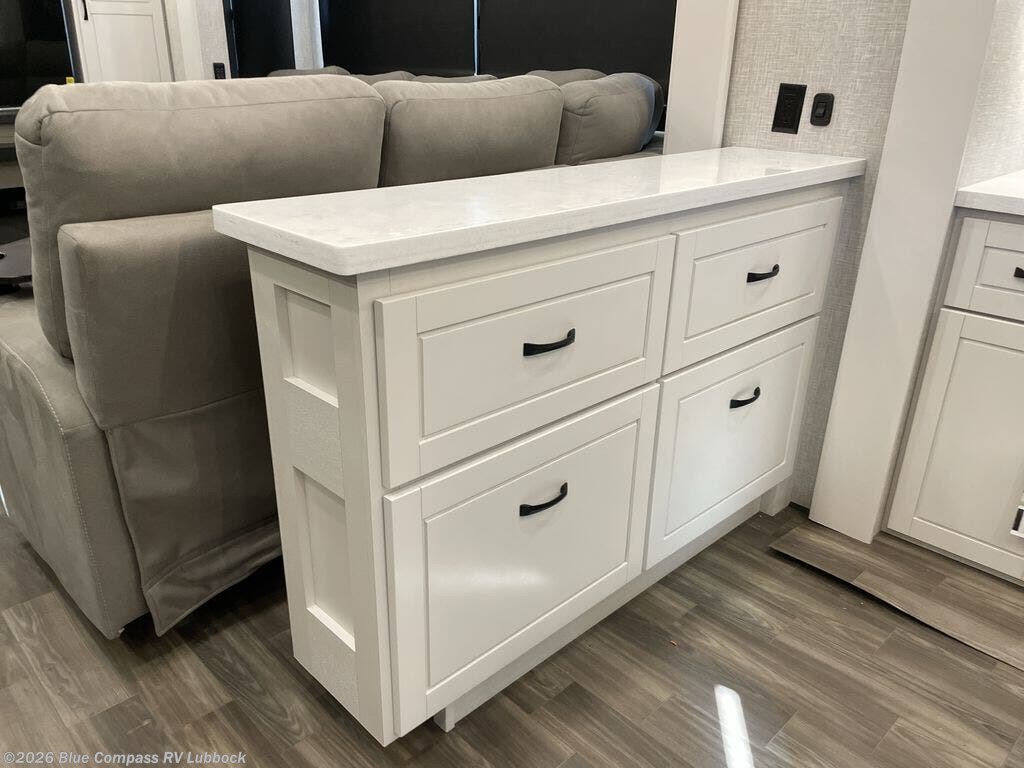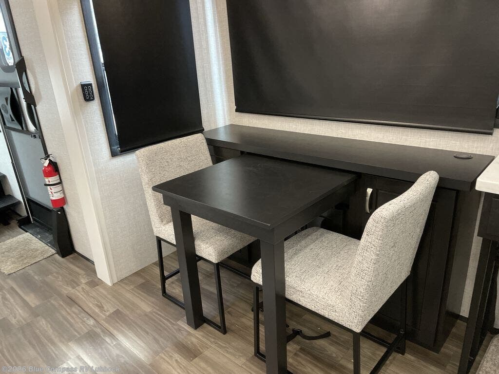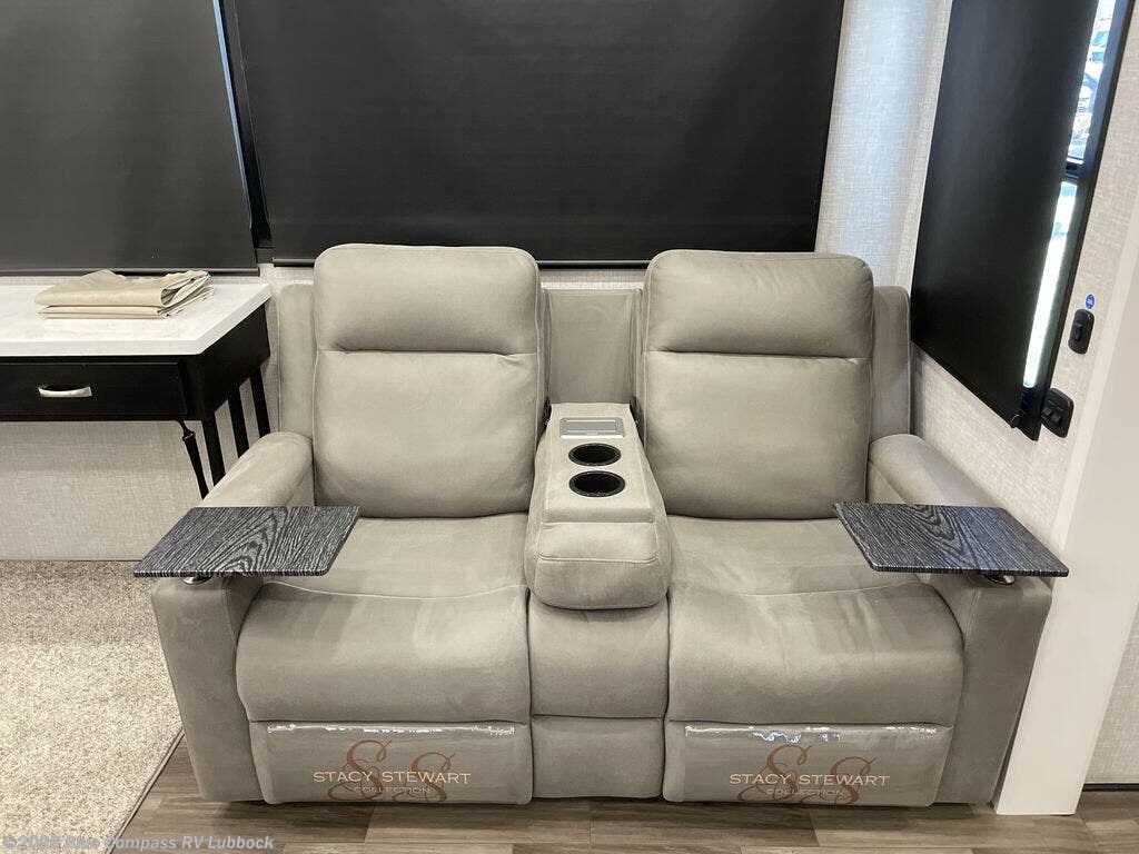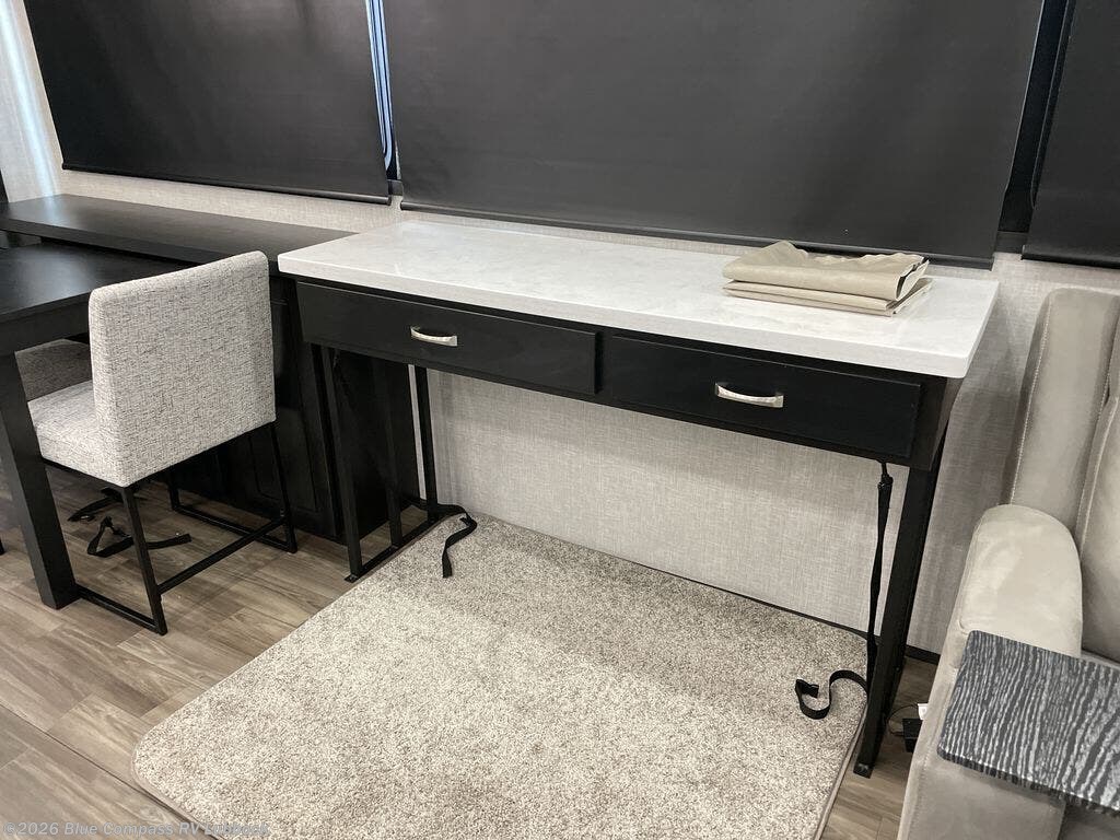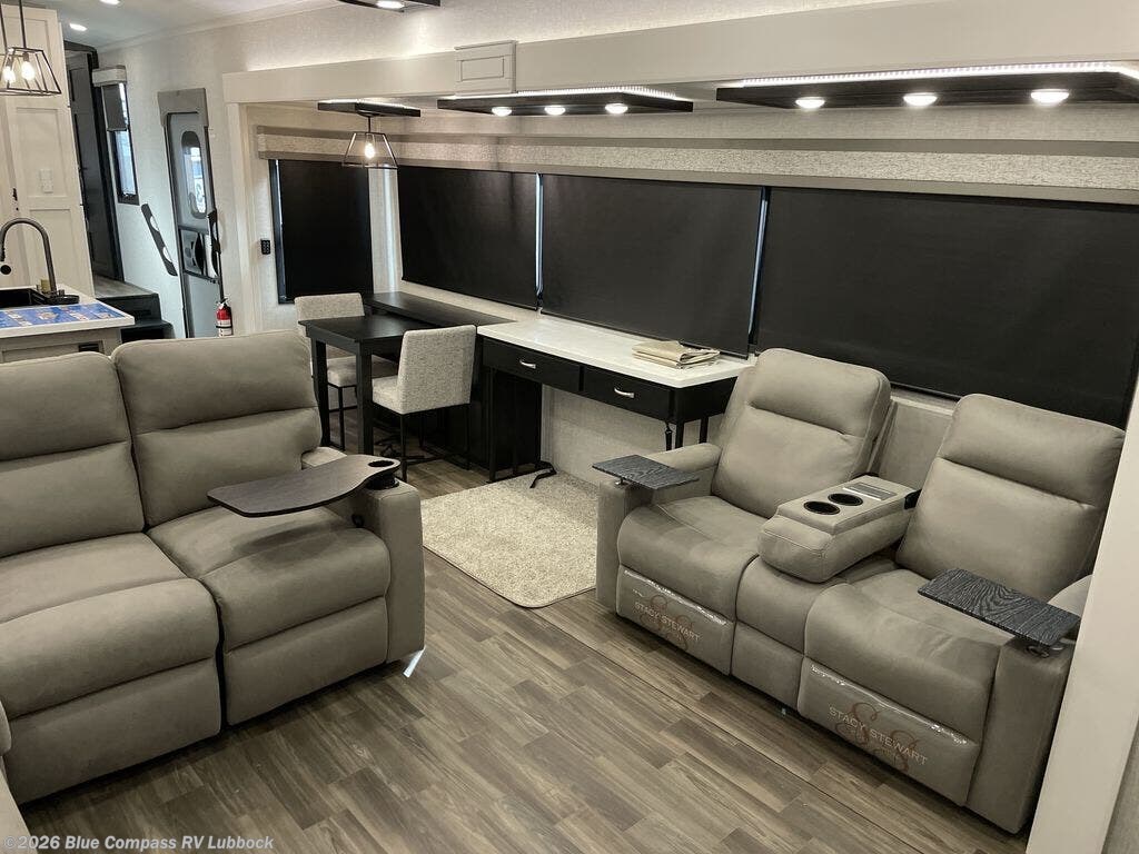 Prepare for great adventures in this fifth wheel! The rear living area features a massive L-shaped sofa which includes a hide-a-bed as well as recliner seats! Plus there's an additional theater seat all facing the entertainment center with a fireplace and 50" Smart TV. A flexible desk/coffee bar connects the living room to the kitchen so you can work or relax as needed. Meals will be easy to prepare with the island with sink and pull-out cutting board, plus pantry, microwave, and residential refrigerator. Up front you will find the private bedroom with its king bed, closet with drawers and hamper, and even a second TV. The full bath features a shower with seat and a linen closet for convenient storage.