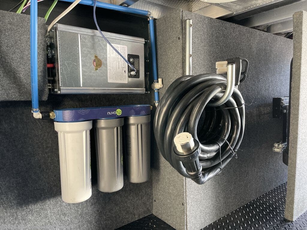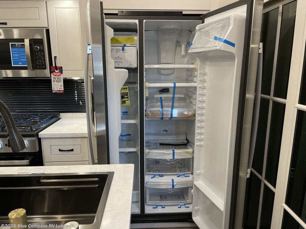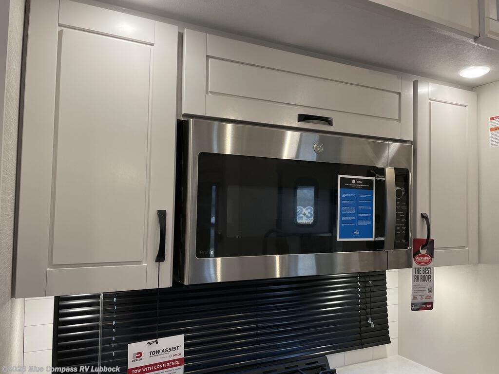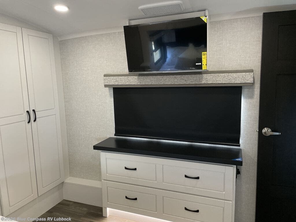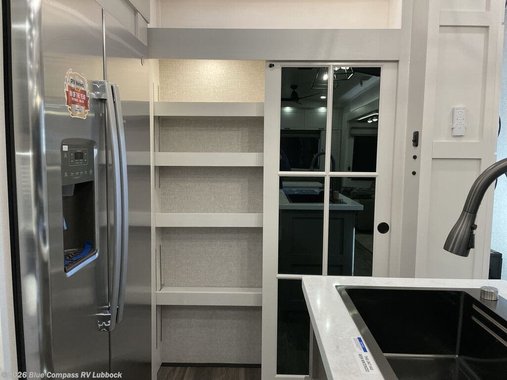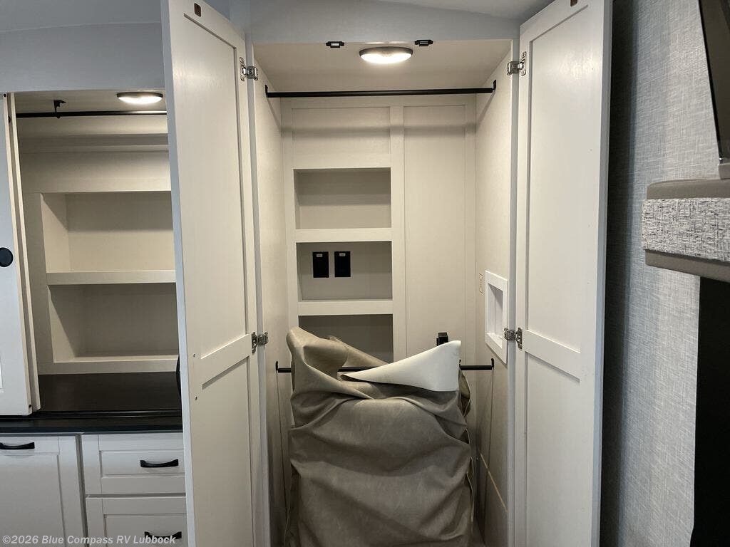Prepare for great adventures in this fifth wheel! The rear living area features a massive L-shaped sofa which includes a hide-a-bed as well as recliner seats! Plus there's an additional theater seat all facing the entertainment center with a fireplace and 50" Smart TV. A flexible desk/coffee bar connects the living room to the kitchen so you can work or relax as needed. Meals will be easy to prepare with the island with sink and pull-out cutting board, plus pantry, microwave, and residential refrigerator. Up front you will find the private bedroom with its king bed, closet with drawers and hamper, and even a second TV. The full bath features a shower with seat and a linen closet for convenient storage.