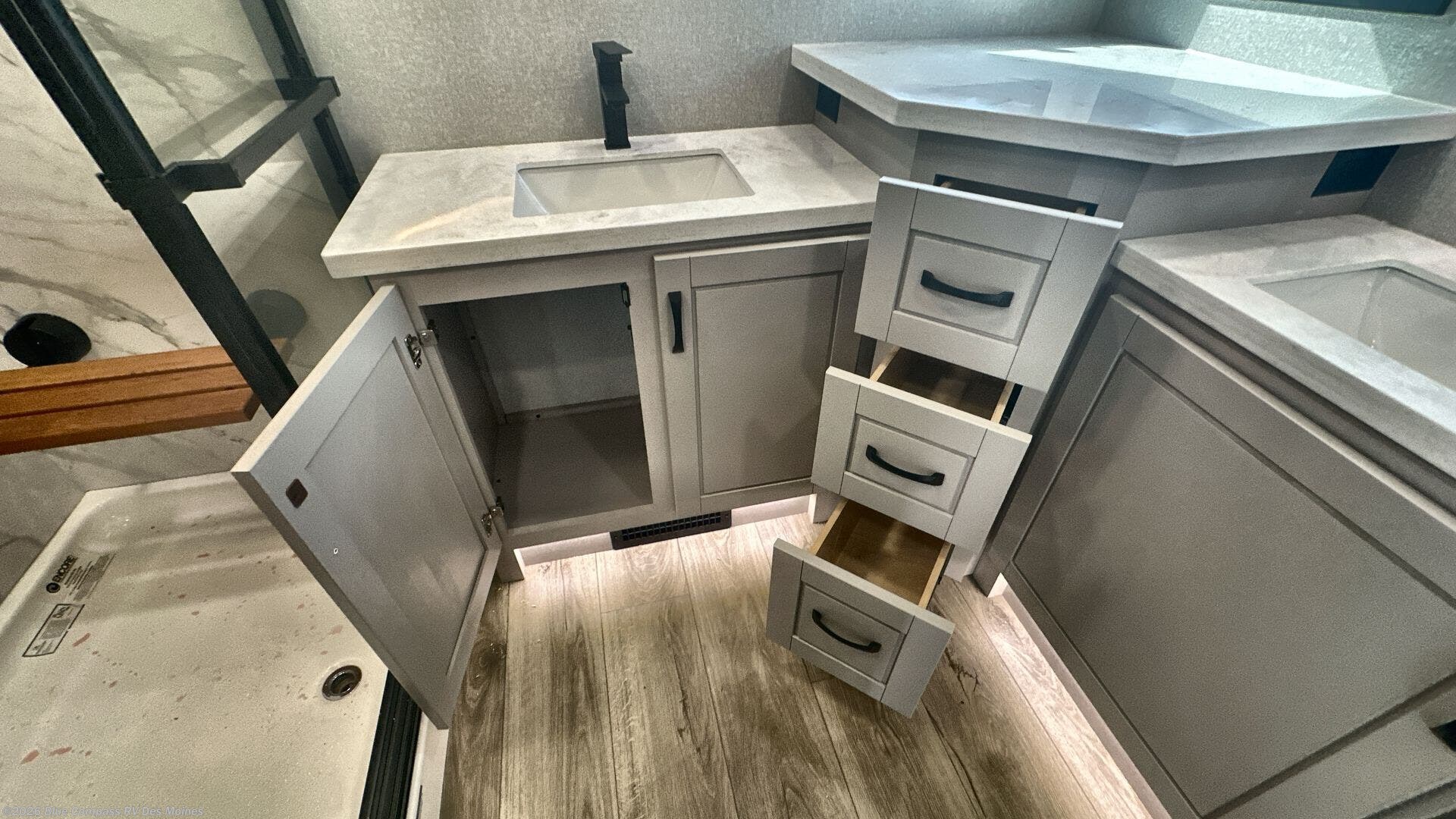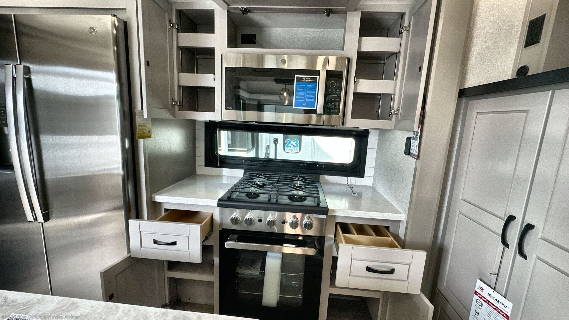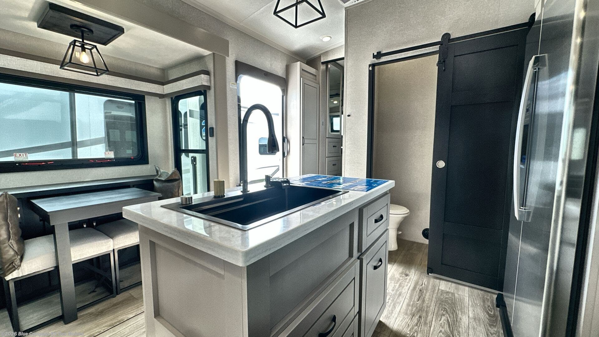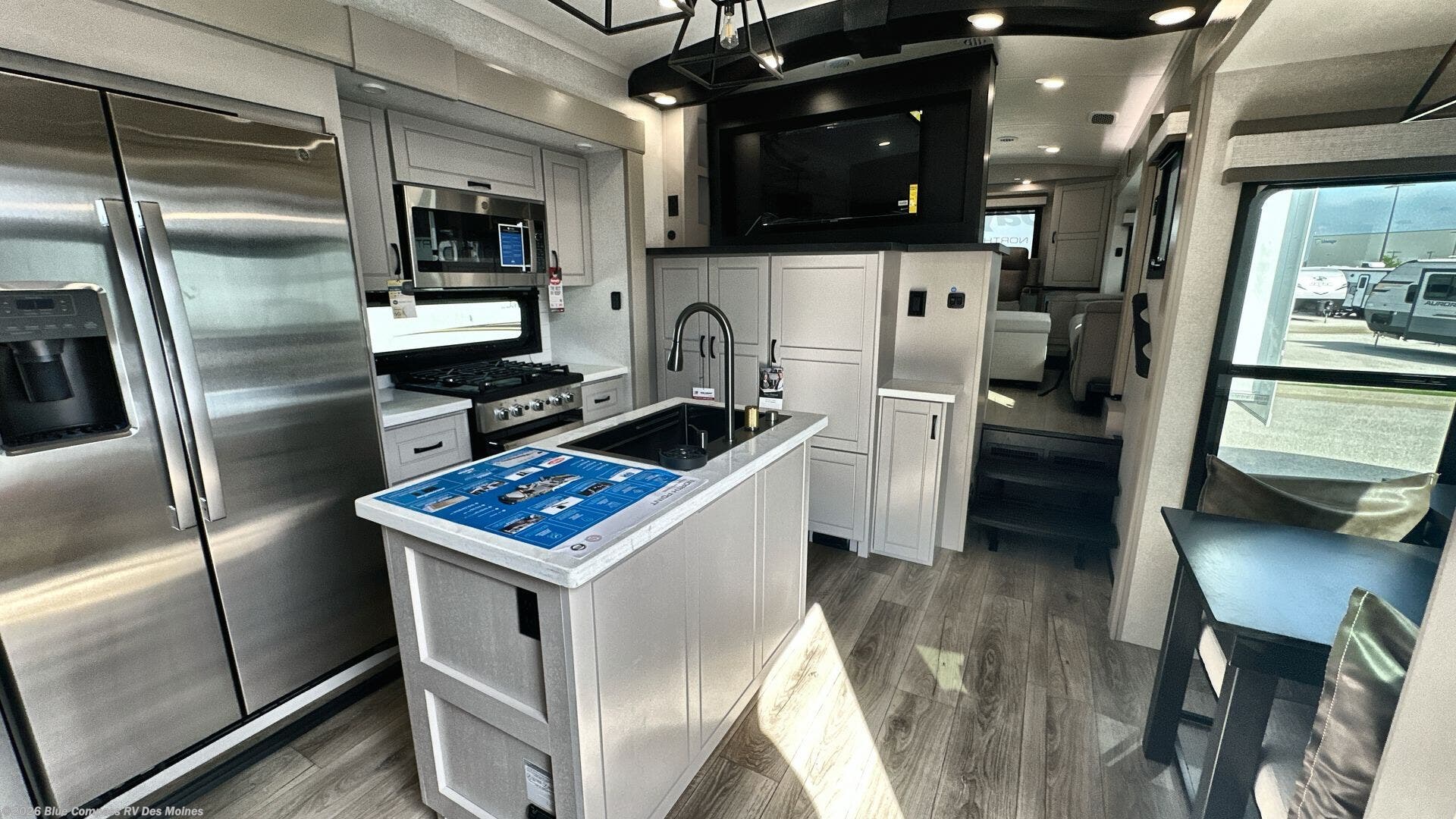 Entertainment can be found throughout this fifth wheel from the front living area with a 50" Smart LED HDTV with fully digital HDMI output and home entertainment system with subwoofer including a fireplace below that you can enjoy while relaxing on theater seats and two tri-fold sofas, a 32" TV in the middle kitchen and there is a bedroom 32" TV. You might even like to add the tailgate TV option along the exterior. Back inside the kitchen, the cook will love the center island, the pantry, the residential refrigerator, and the roll-top dinette. The half bath is a few steps away as an added convenience. The master bedroom includes a king bed slide, a bench, two wardrobes and a sliding door into the bathroom which offers two sinks, a space prepped for a washer/dryer option, and a walk-in shower. And don't forget about the exterior features such as the outside kitchen for more choices when making meals, the storage for your outdoor gear and chairs, and two awnings with integrated LED lighting.