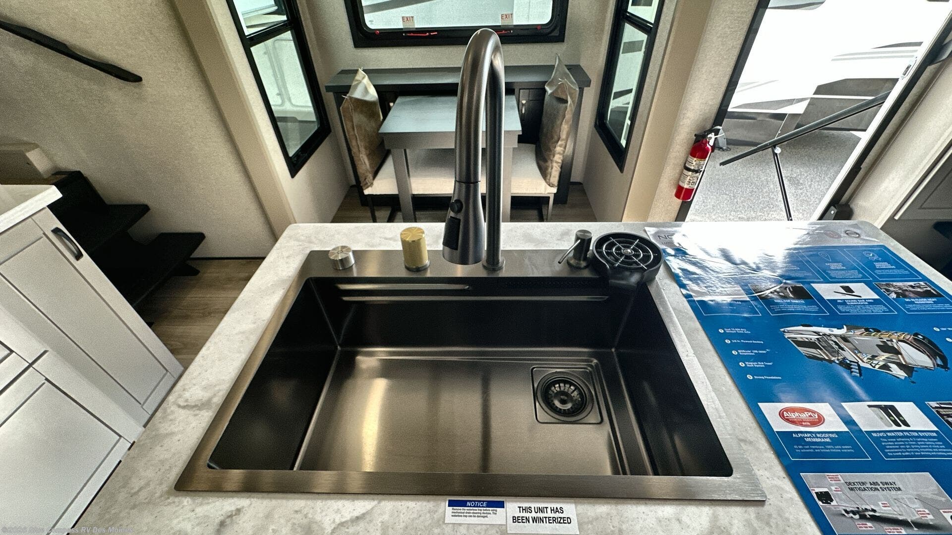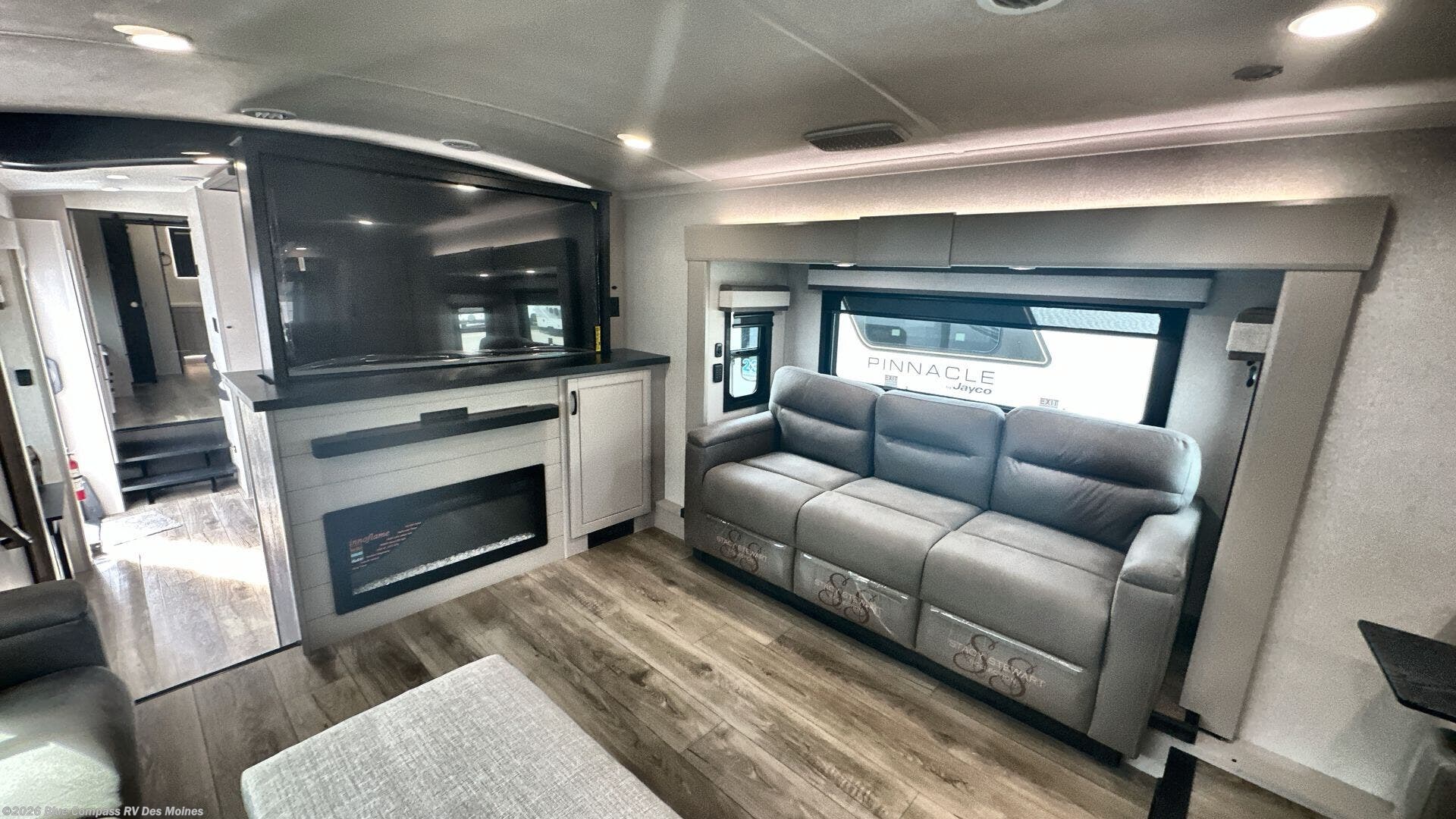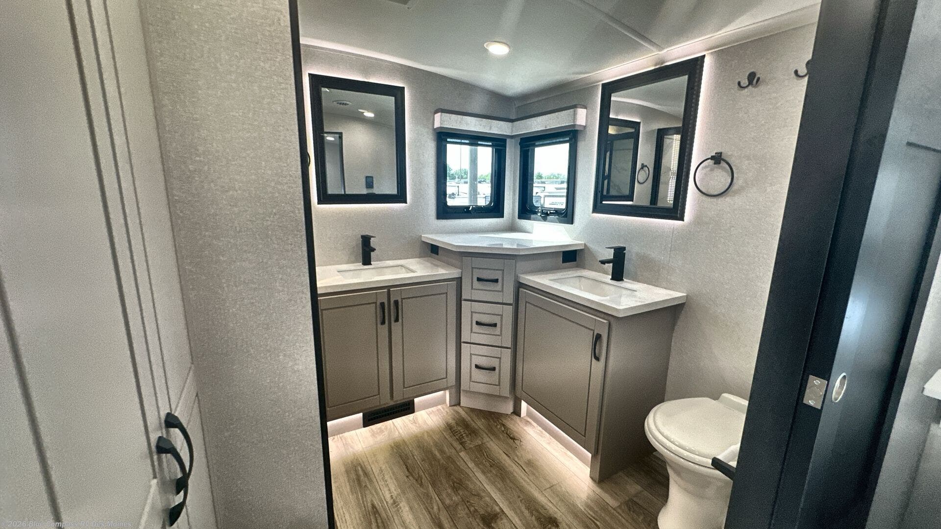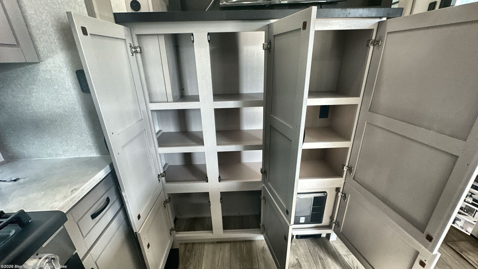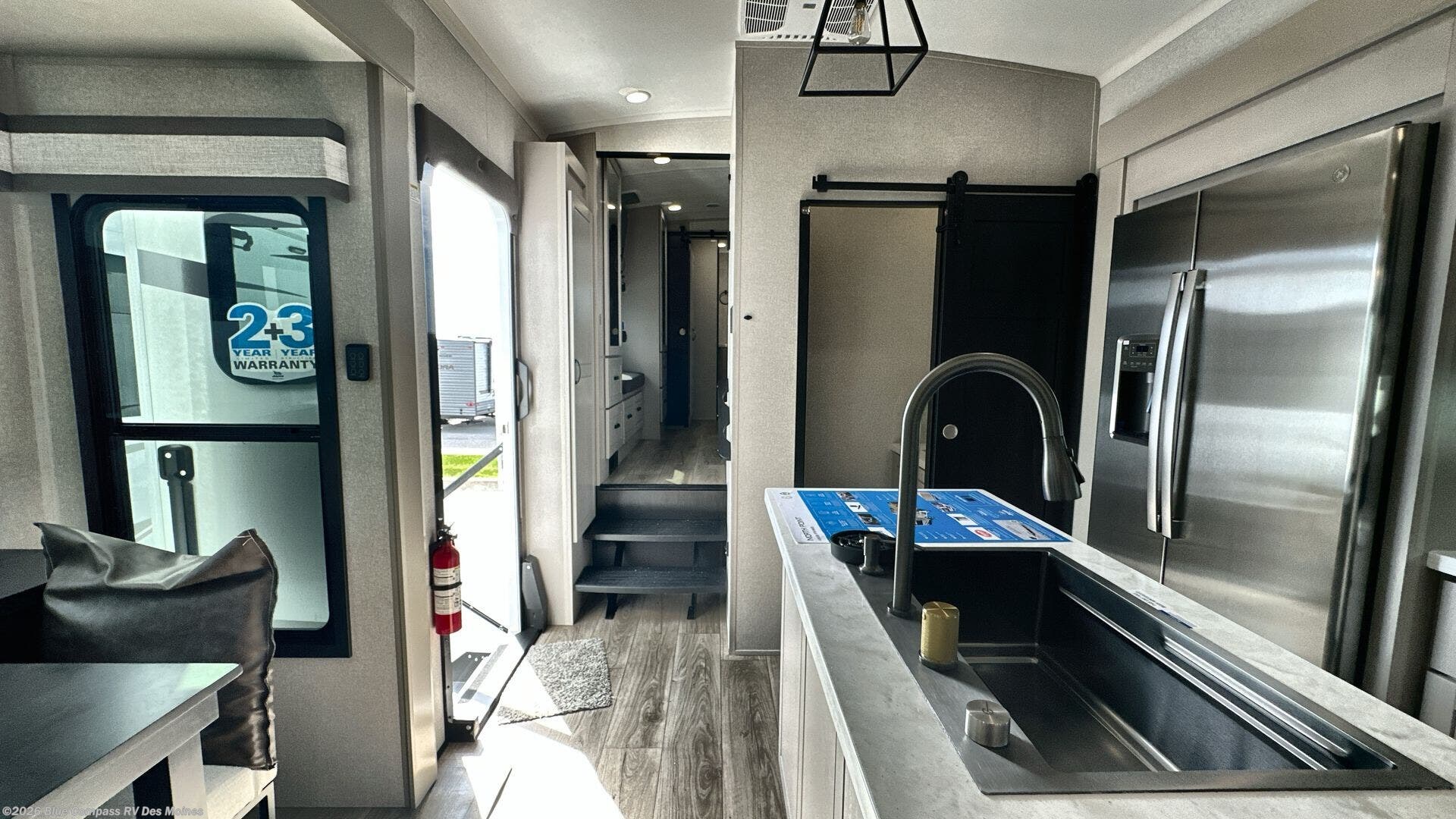 Entertainment can be found throughout this fifth wheel from the front living area with a 50" Smart LED HDTV with fully digital HDMI output and home entertainment system with subwoofer including a fireplace below that you can enjoy while relaxing on theater seats and two tri-fold sofas, a 32" TV in the middle kitchen and there is a bedroom 32" TV. You might even like to add the tailgate TV option along the exterior. Back inside the kitchen, the cook will love the center island, the pantry, the residential refrigerator, and the roll-top dinette. The half bath is a few steps away as an added convenience. The master bedroom includes a king bed slide, a bench, two wardrobes and a sliding door into the bathroom which offers two sinks, a space prepped for a washer/dryer option, and a walk-in shower. And don't forget about the exterior features such as the outside kitchen for more choices when making meals, the storage for your outdoor gear and chairs, and two awnings with integrated LED lighting.