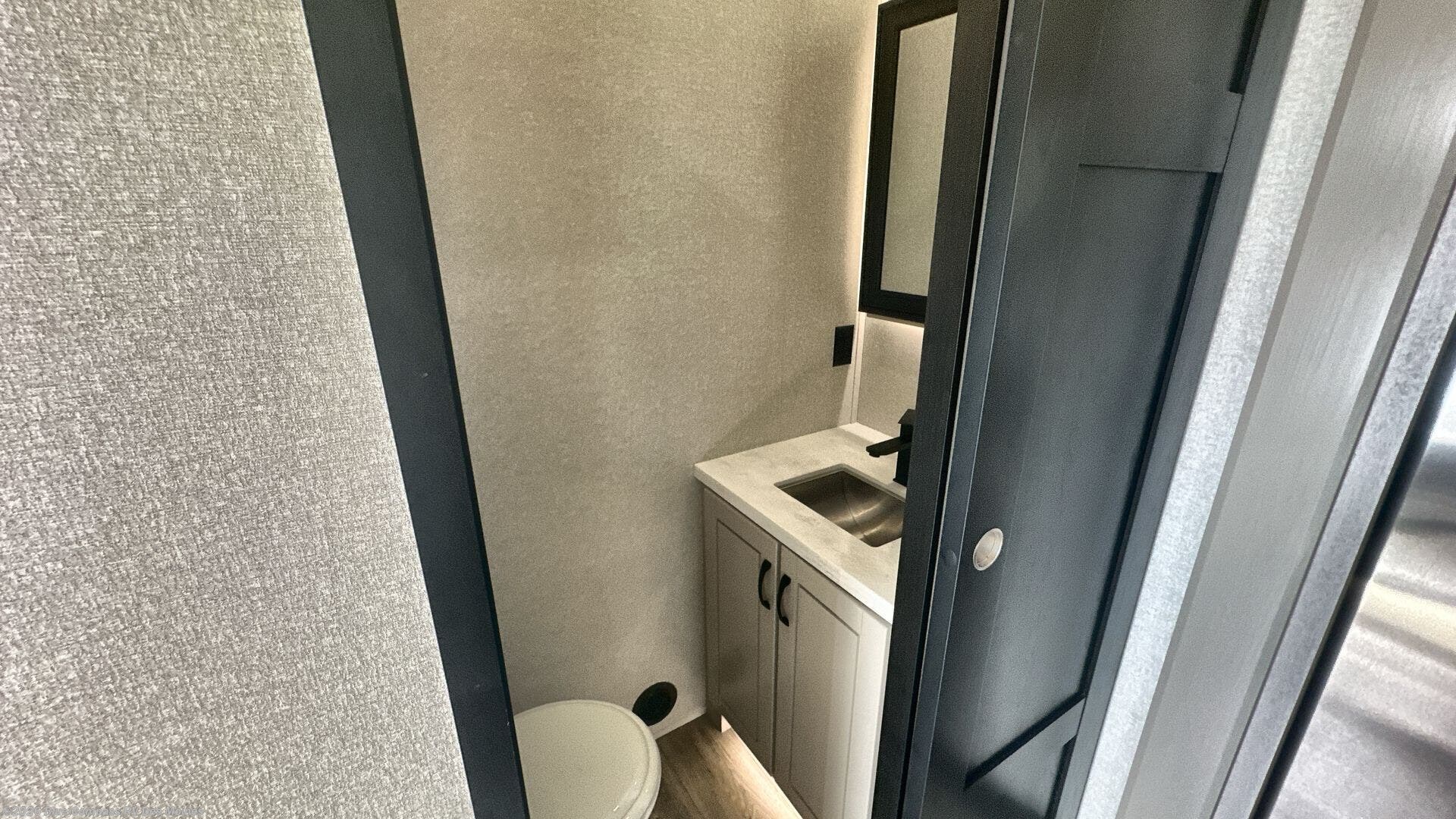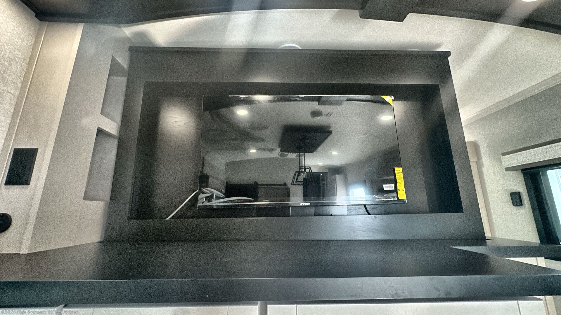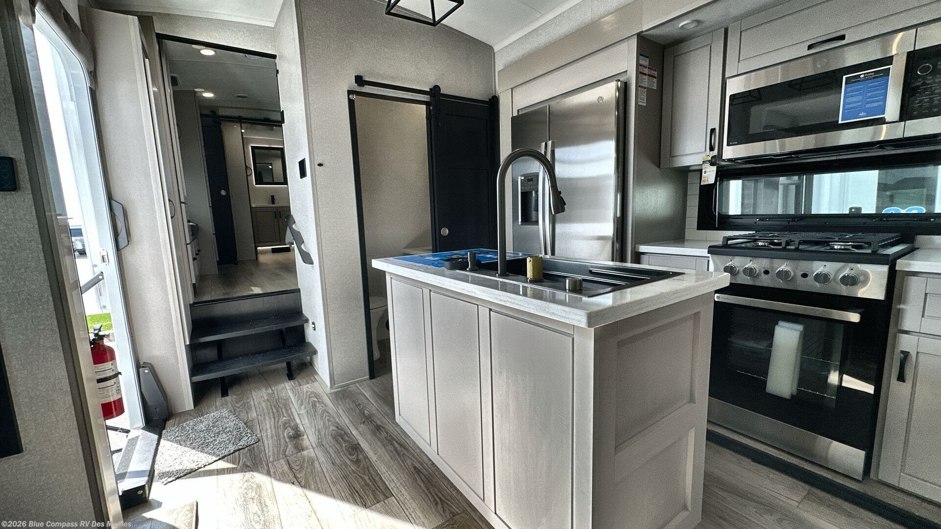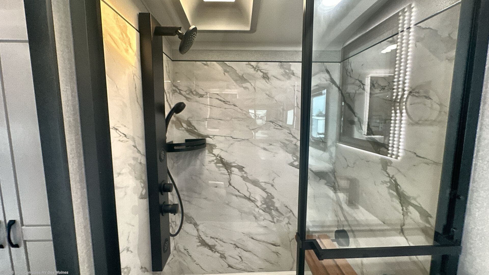Entertainment can be found throughout this fifth wheel from the front living area with a 50" Smart LED HDTV with fully digital HDMI output and home entertainment system with subwoofer including a fireplace below that you can enjoy while relaxing on theater seats and two tri-fold sofas, a 32" TV in the middle kitchen and there is a bedroom 32" TV. You might even like to add the tailgate TV option along the exterior. Back inside the kitchen, the cook will love the center island, the pantry, the residential refrigerator, and the roll-top dinette. The half bath is a few steps away as an added convenience. The master bedroom includes a king bed slide, a bench, two wardrobes and a sliding door into the bathroom which offers two sinks, a space prepped for a washer/dryer option, and a walk-in shower. And don't forget about the exterior features such as the outside kitchen for more choices when making meals, the storage for your outdoor gear and chairs, and two awnings with integrated LED lighting.