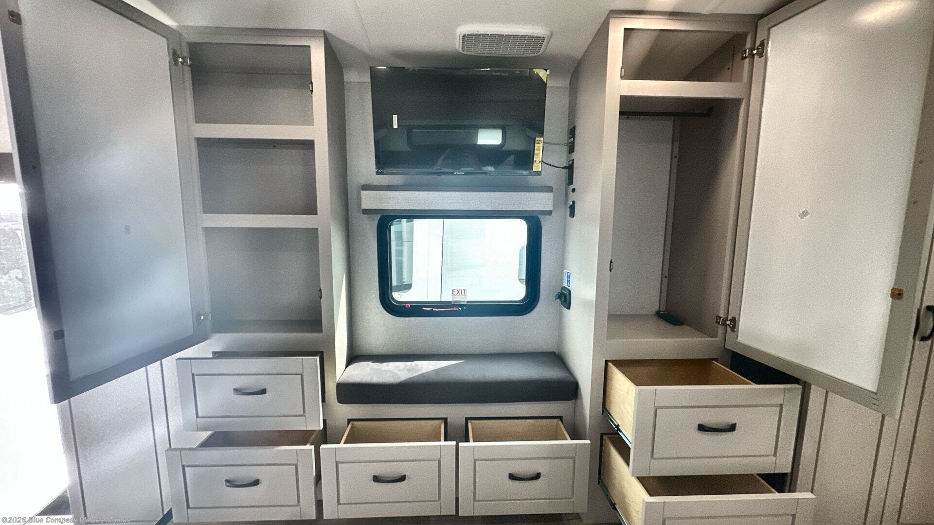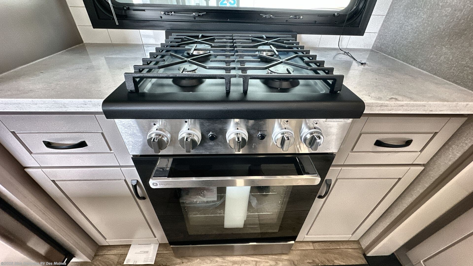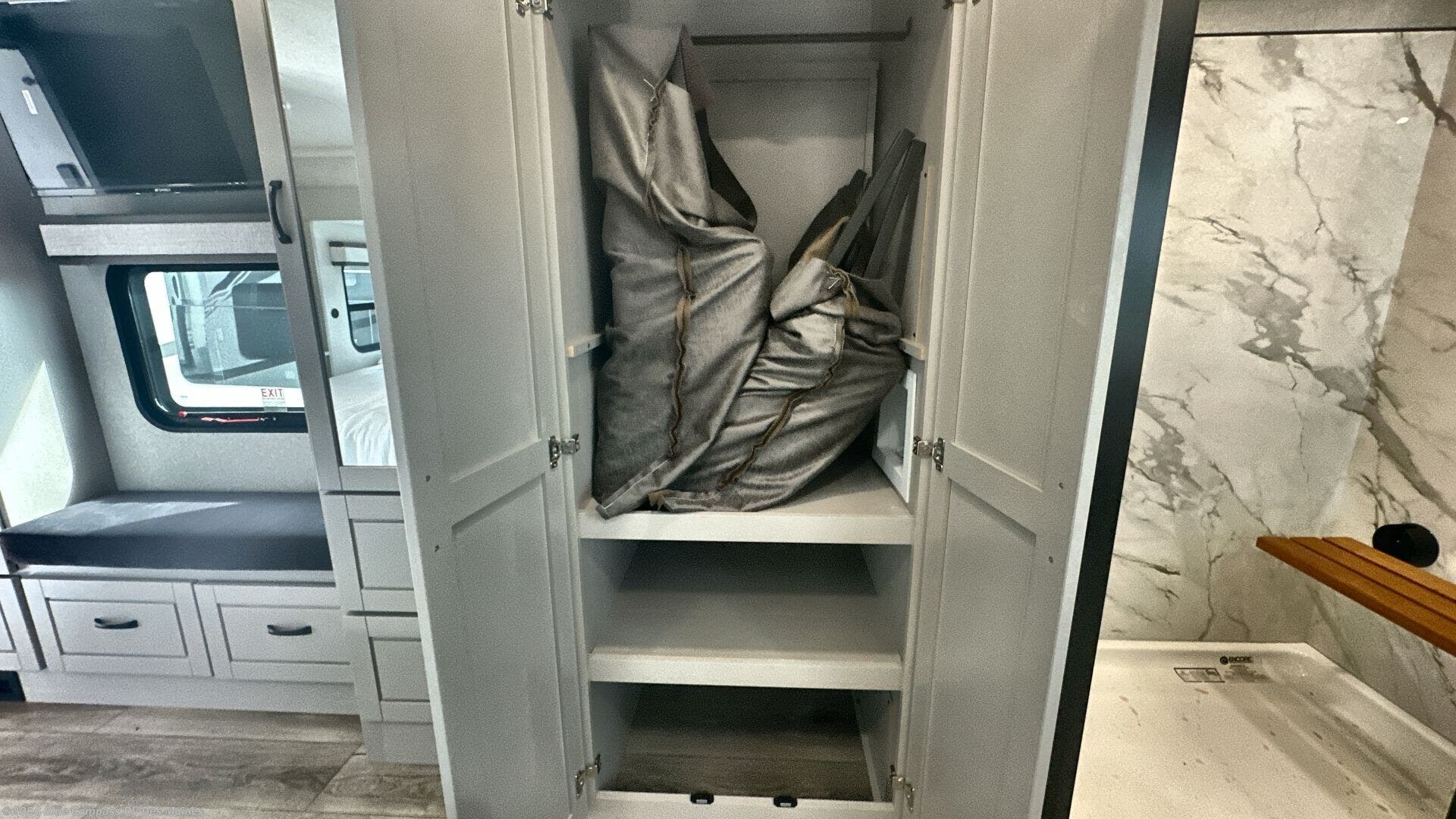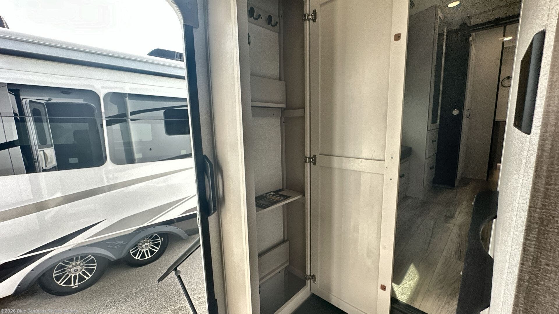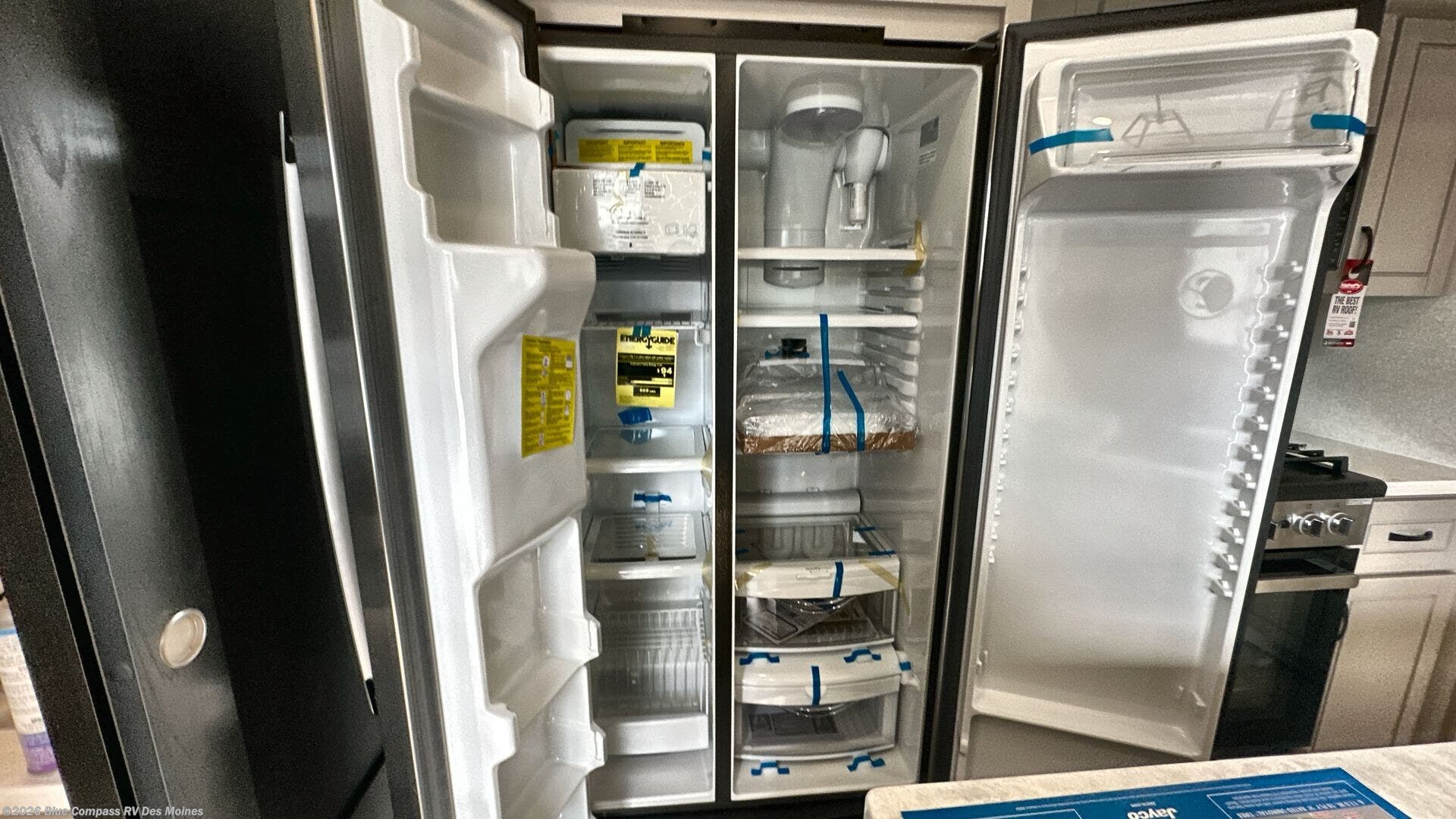 Entertainment can be found throughout this fifth wheel from the front living area with a 50" Smart LED HDTV with fully digital HDMI output and home entertainment system with subwoofer including a fireplace below that you can enjoy while relaxing on theater seats and two tri-fold sofas, a 32" TV in the middle kitchen and there is a bedroom 32" TV. You might even like to add the tailgate TV option along the exterior. Back inside the kitchen, the cook will love the center island, the pantry, the residential refrigerator, and the roll-top dinette. The half bath is a few steps away as an added convenience. The master bedroom includes a king bed slide, a bench, two wardrobes and a sliding door into the bathroom which offers two sinks, a space prepped for a washer/dryer option, and a walk-in shower. And don't forget about the exterior features such as the outside kitchen for more choices when making meals, the storage for your outdoor gear and chairs, and two awnings with integrated LED lighting.