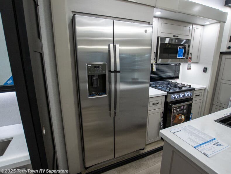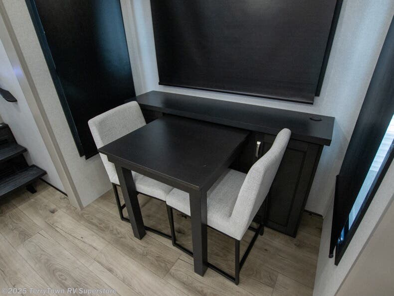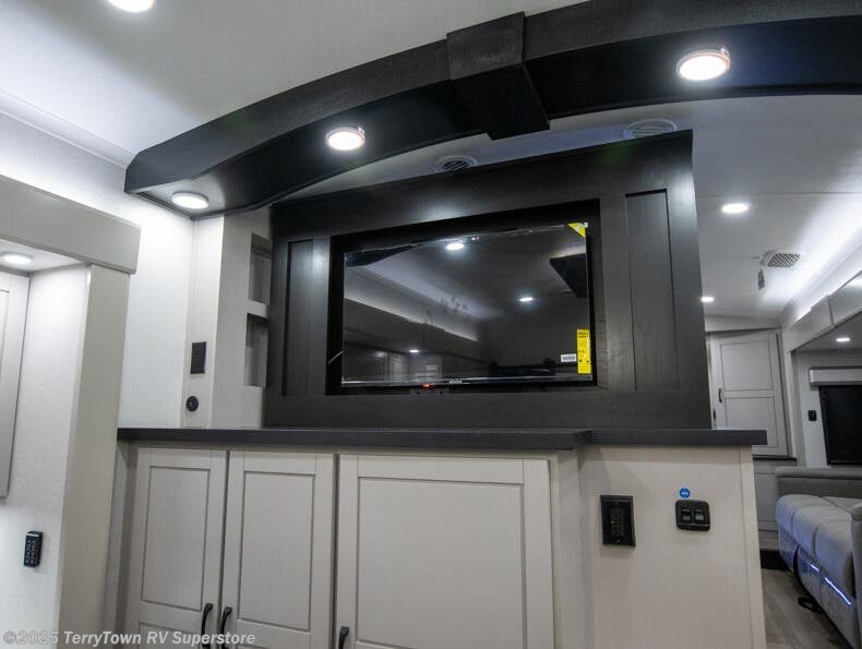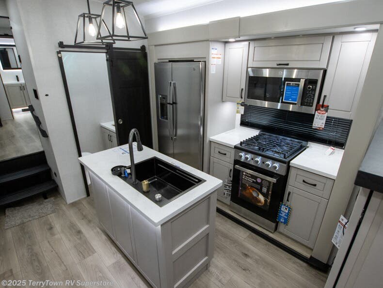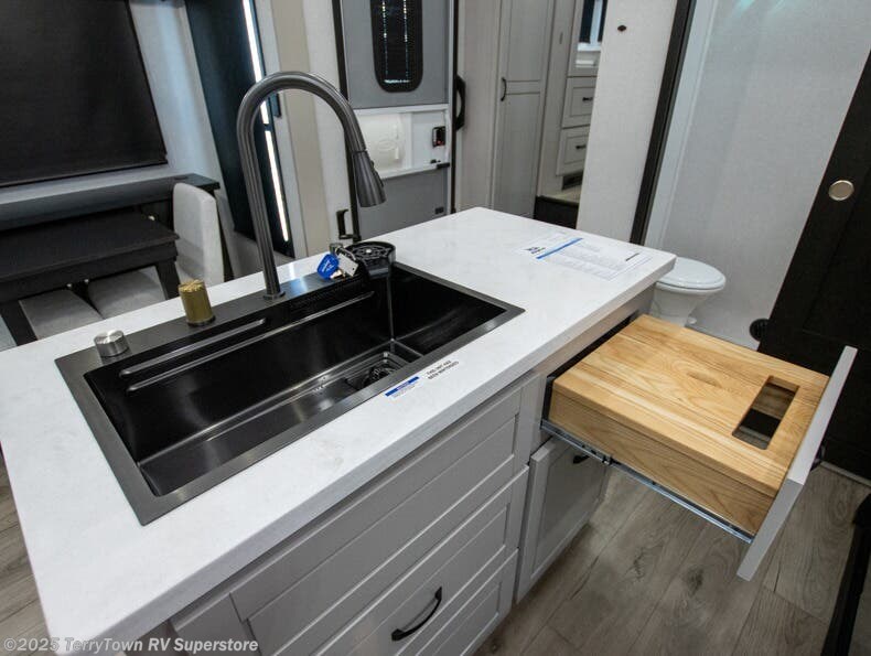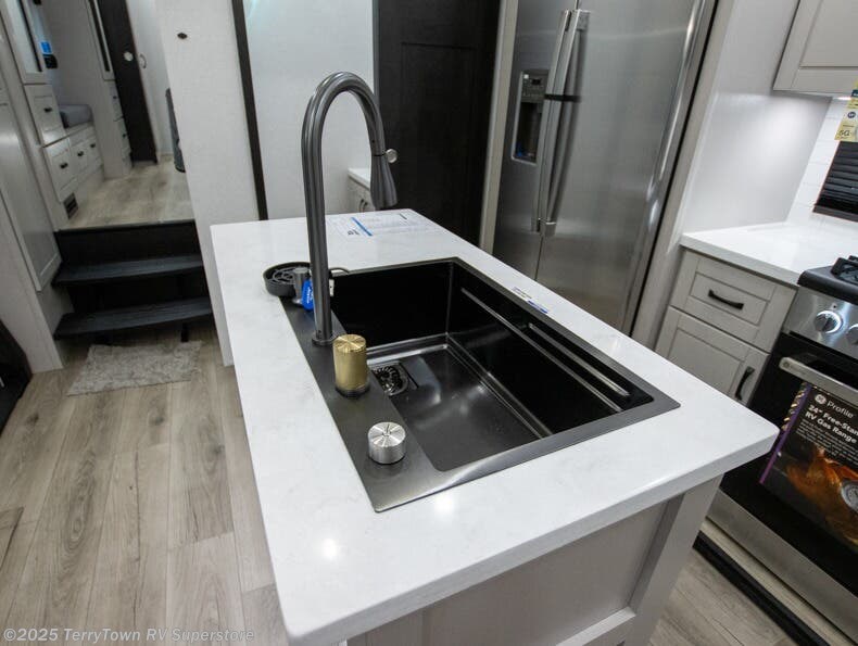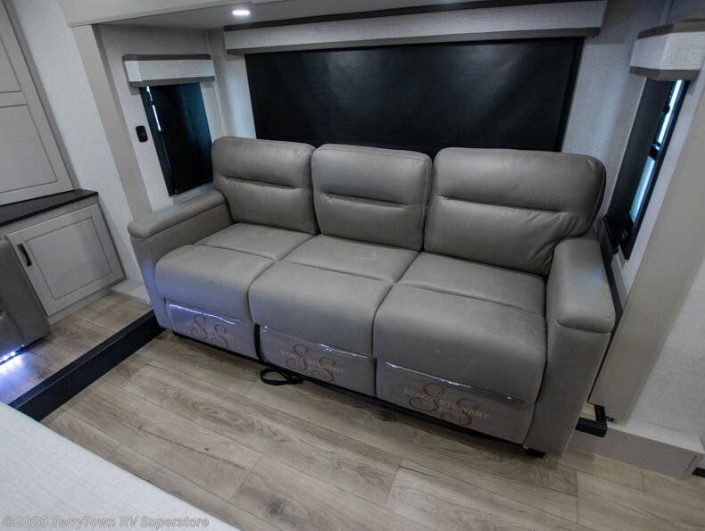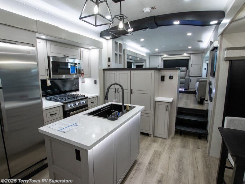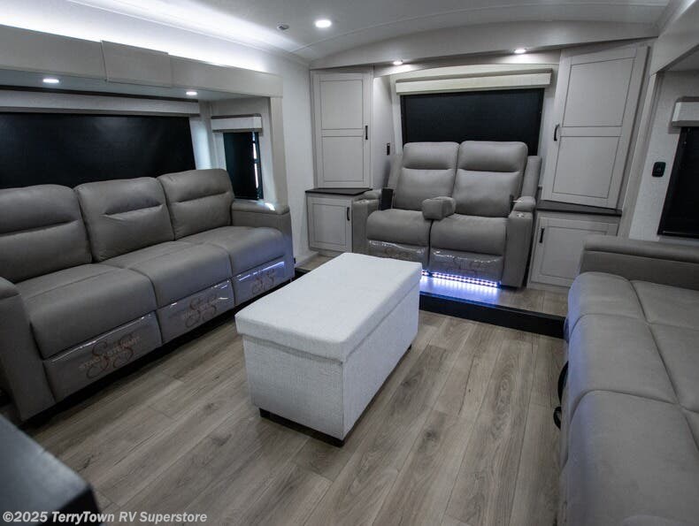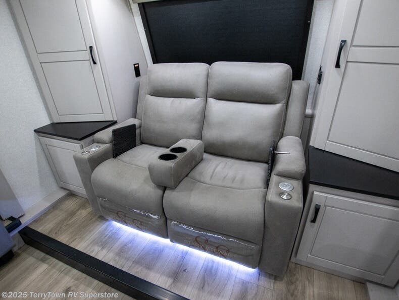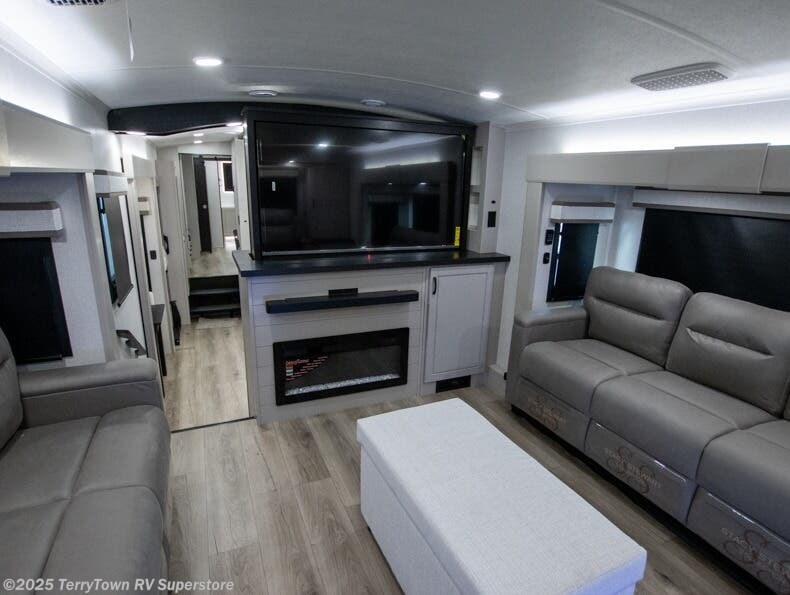 Entertainment can be found throughout this fifth wheel from the front living area with a 50" Smart LED HDTV with fully digital HDMI output and home entertainment system with subwoofer including a fireplace below that you can enjoy while relaxing on theater seats and two tri-fold sofas, a 32" TV in the middle kitchen and there is a bedroom 32" TV. You might even like to add the tailgate TV option along the exterior. Back inside the kitchen, the cook will love the center island, the pantry, the residential refrigerator, and the roll-top dinette. The half bath is a few steps away as an added convenience. The master bedroom includes a king bed slide, a bench, two wardrobes and a sliding door into the bathroom which offers two sinks, a space prepped for a washer/dryer option, and a walk-in shower. And don't forget about the exterior features such as the outside kitchen for more choices when making meals, the storage for your outdoor gear and chairs, and two awnings with integrated LED lighting.