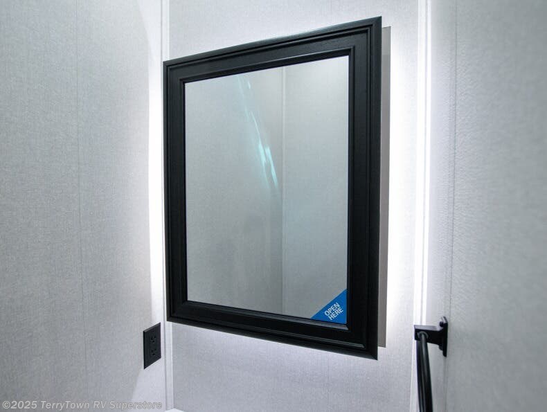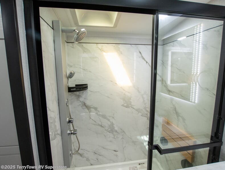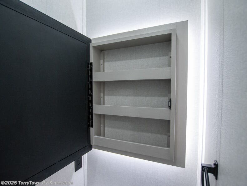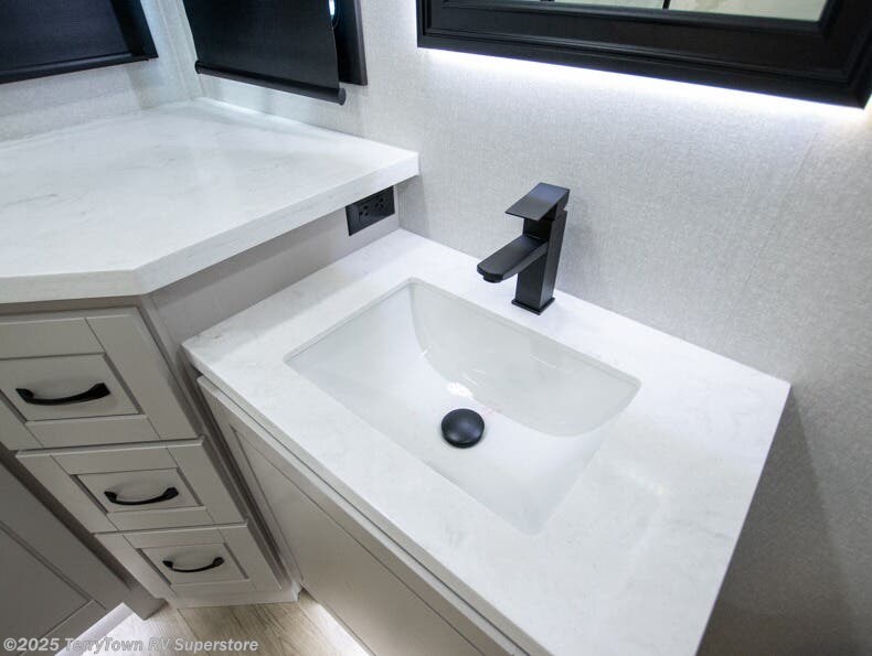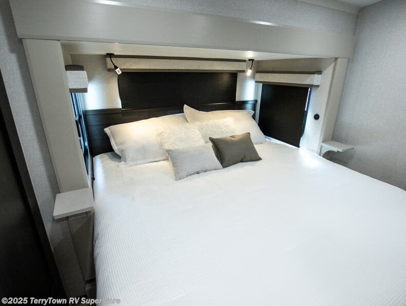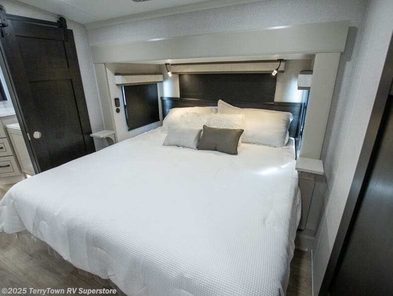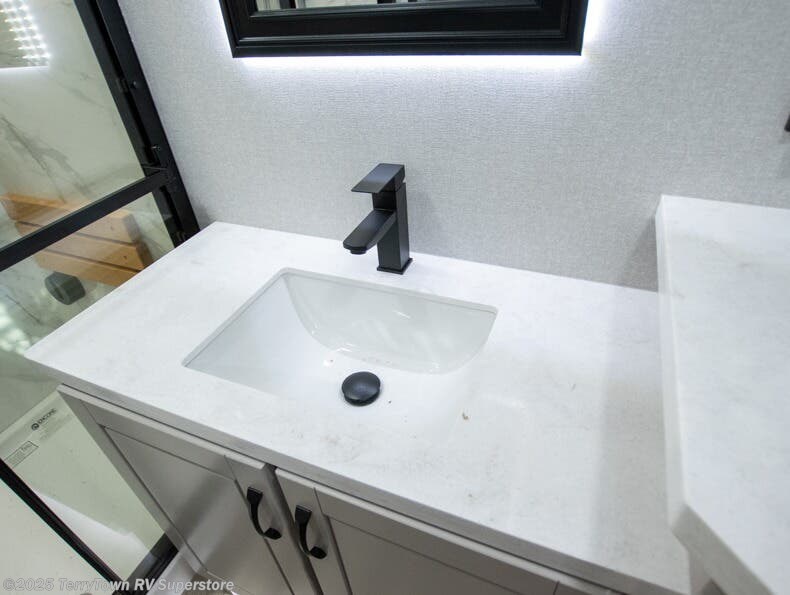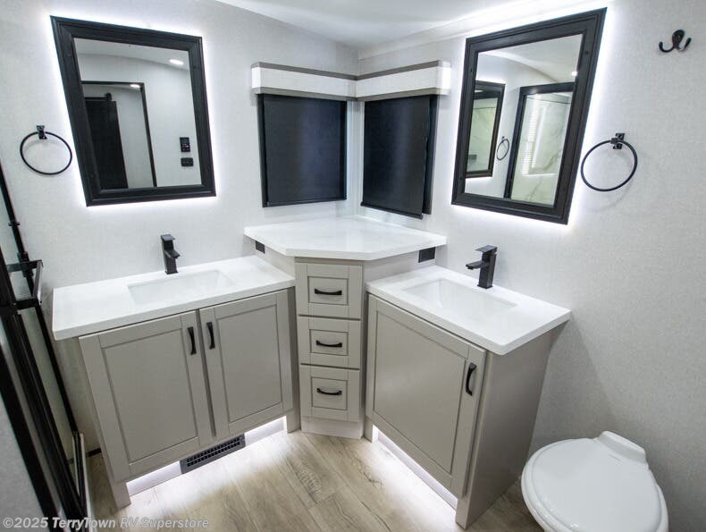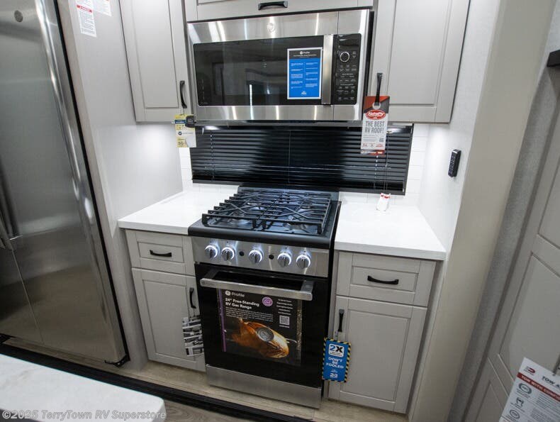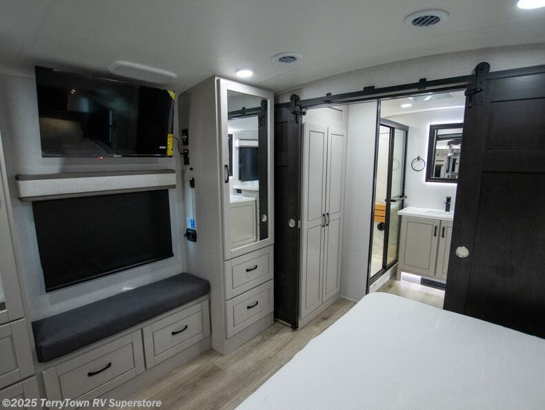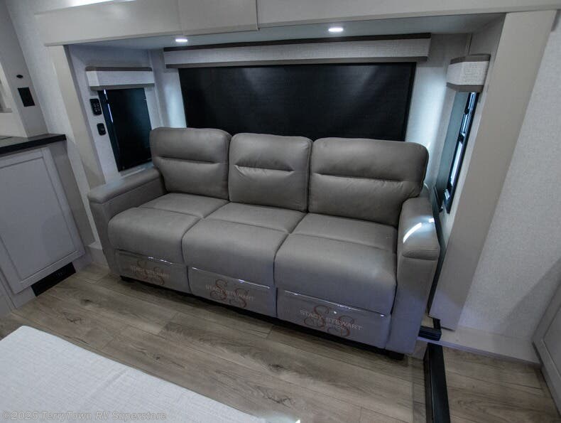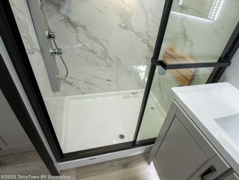 Entertainment can be found throughout this fifth wheel from the front living area with a 50" Smart LED HDTV with fully digital HDMI output and home entertainment system with subwoofer including a fireplace below that you can enjoy while relaxing on theater seats and two tri-fold sofas, a 32" TV in the middle kitchen and there is a bedroom 32" TV. You might even like to add the tailgate TV option along the exterior. Back inside the kitchen, the cook will love the center island, the pantry, the residential refrigerator, and the roll-top dinette. The half bath is a few steps away as an added convenience. The master bedroom includes a king bed slide, a bench, two wardrobes and a sliding door into the bathroom which offers two sinks, a space prepped for a washer/dryer option, and a walk-in shower. And don't forget about the exterior features such as the outside kitchen for more choices when making meals, the storage for your outdoor gear and chairs, and two awnings with integrated LED lighting.