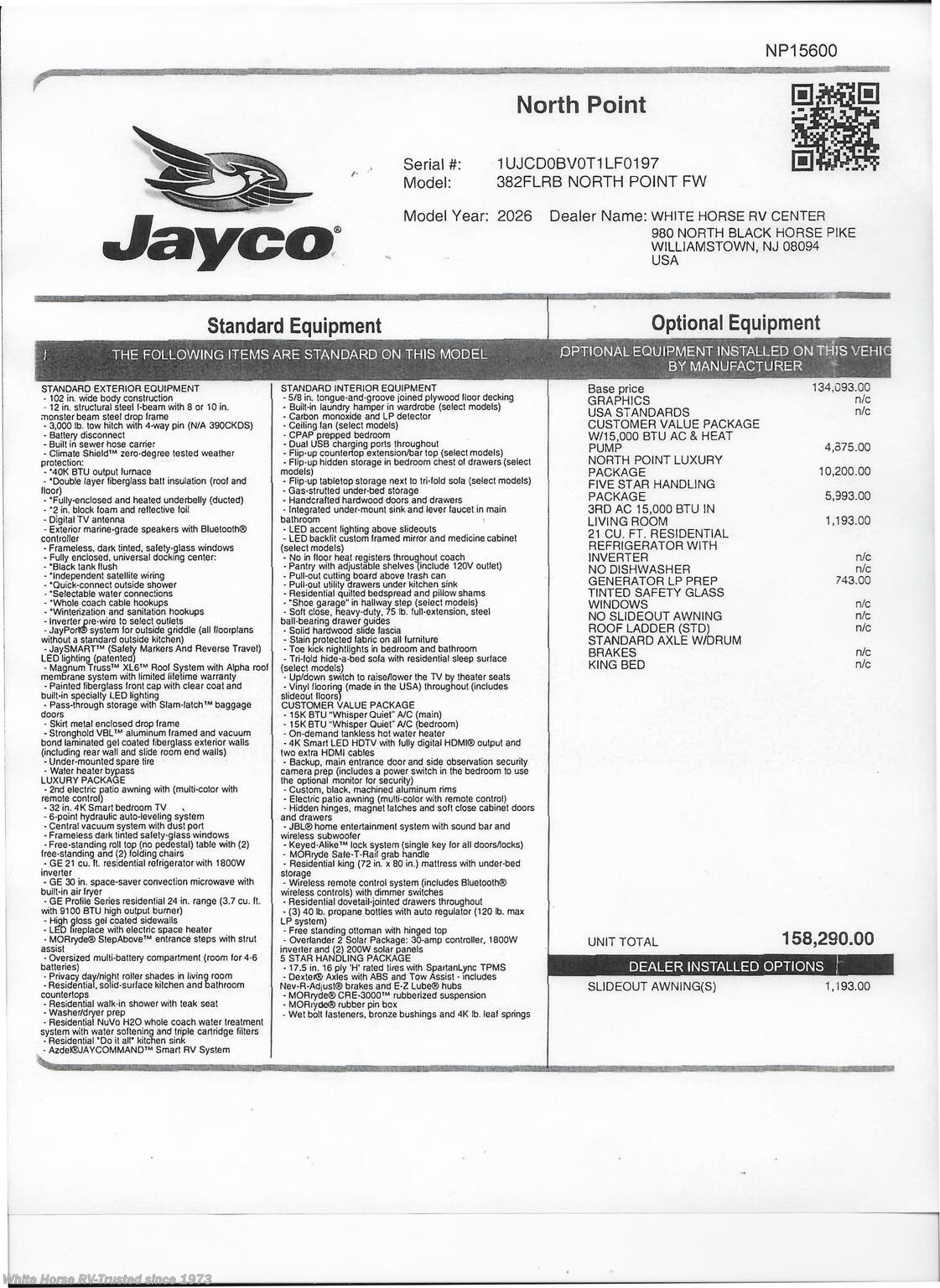 This 2026 Jayco North Point Fifth Wheel, Stock# NP15600 comes equipped as follows: