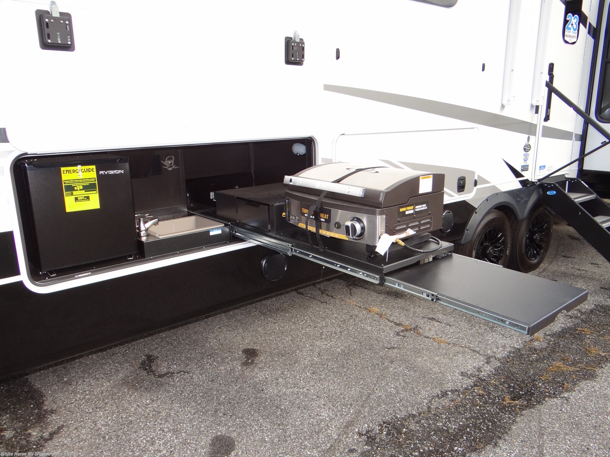 Automatic Leveling Jacks, Black Tank Flush, Enclosed Underbelly, Exterior Speakers, Heated Underbelly, Hitch, Outside Kitchen, Power Awning, Tinted Windows -