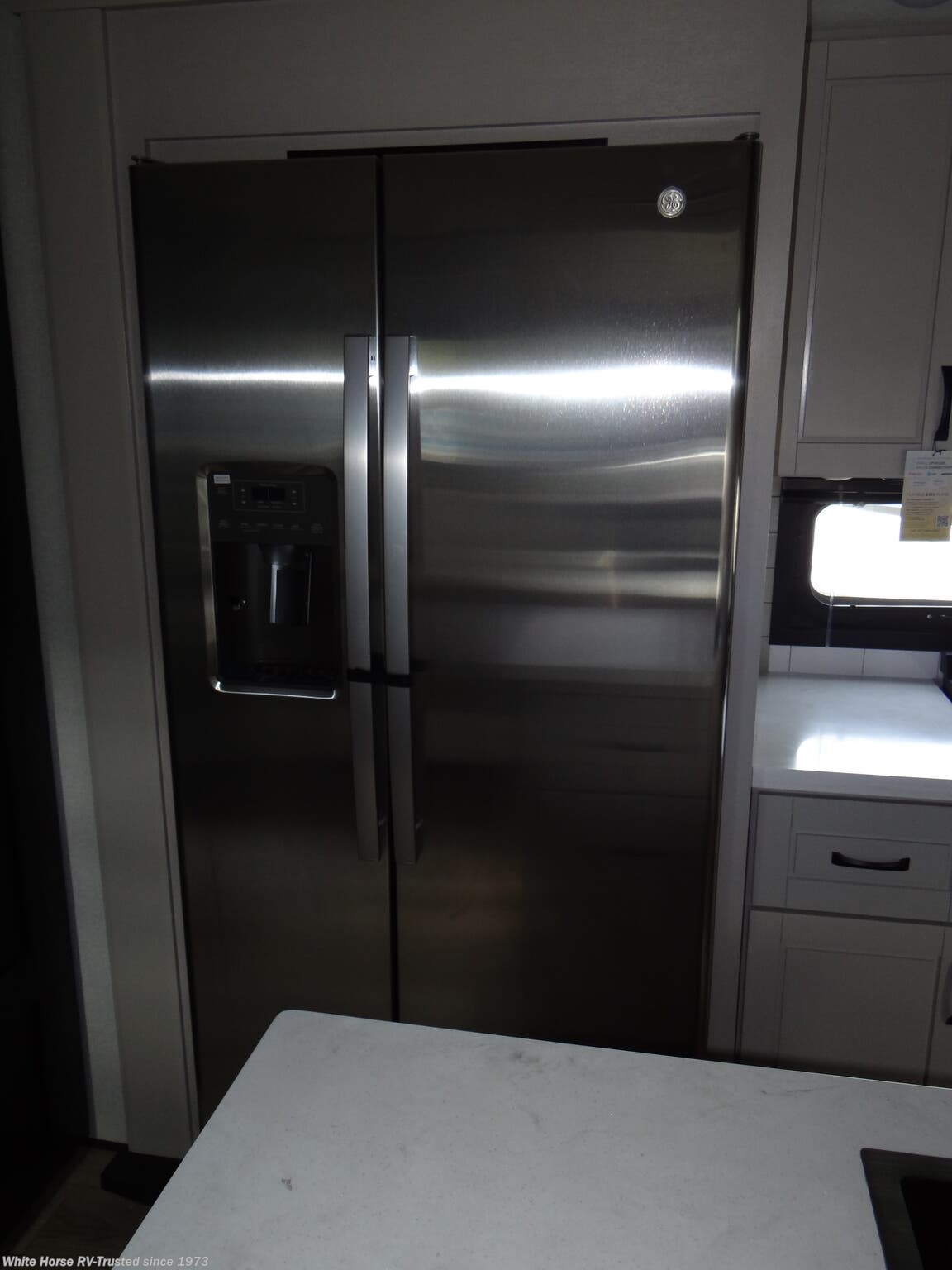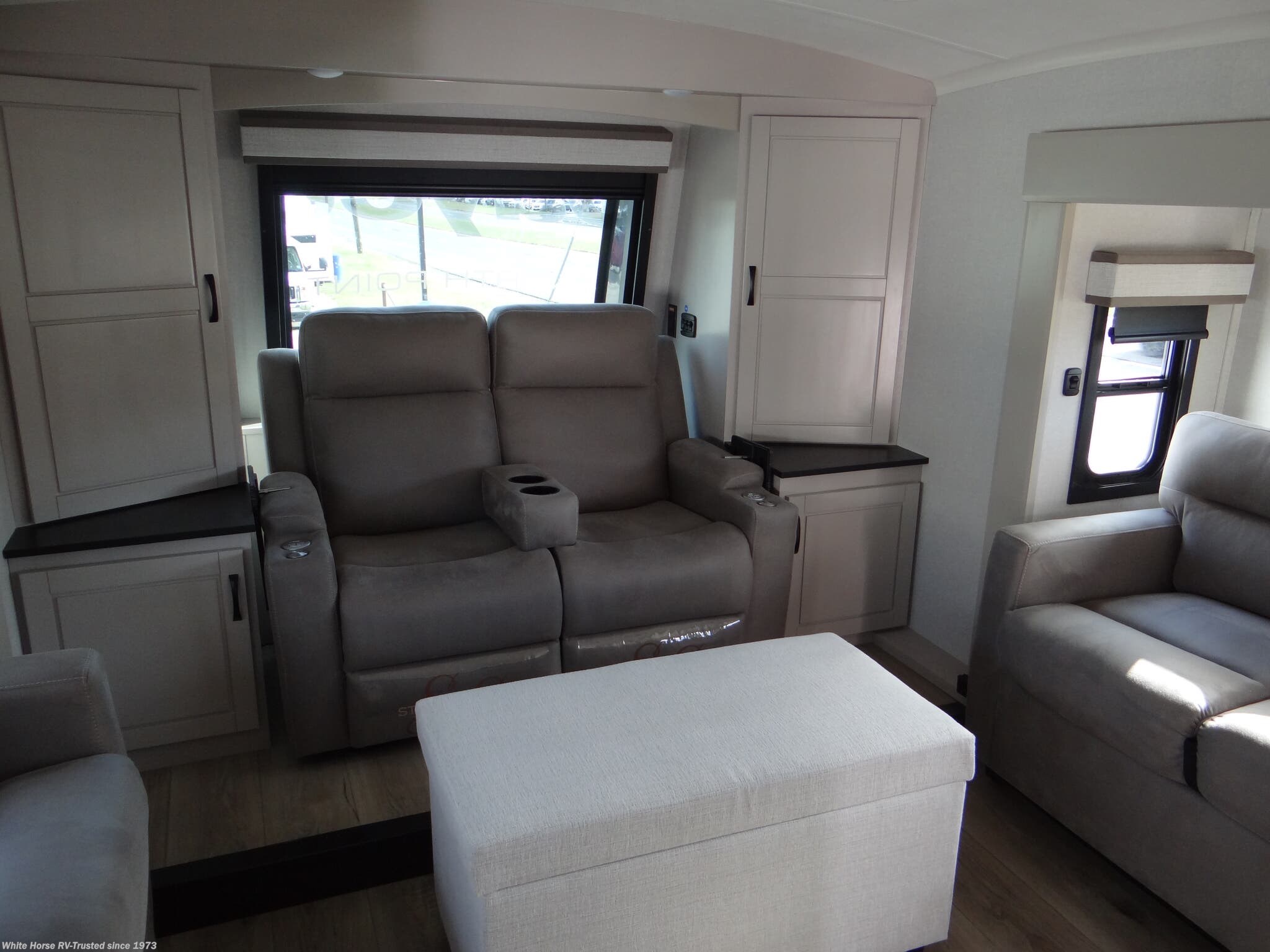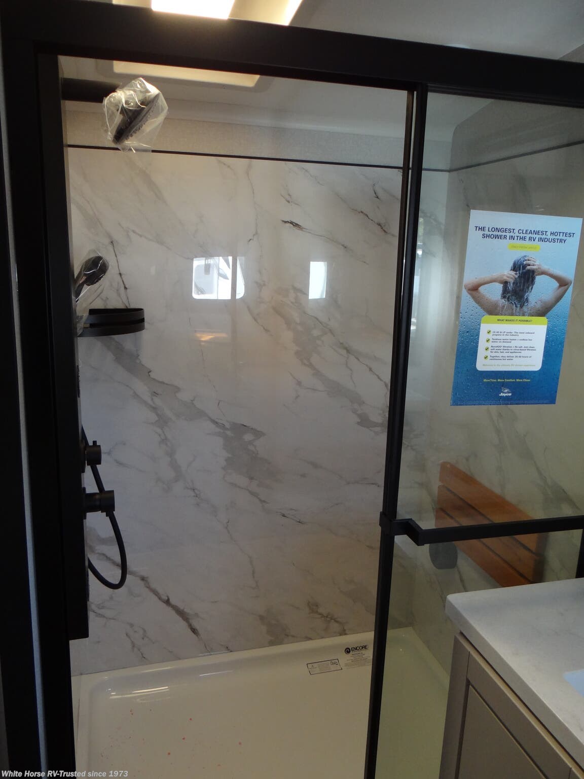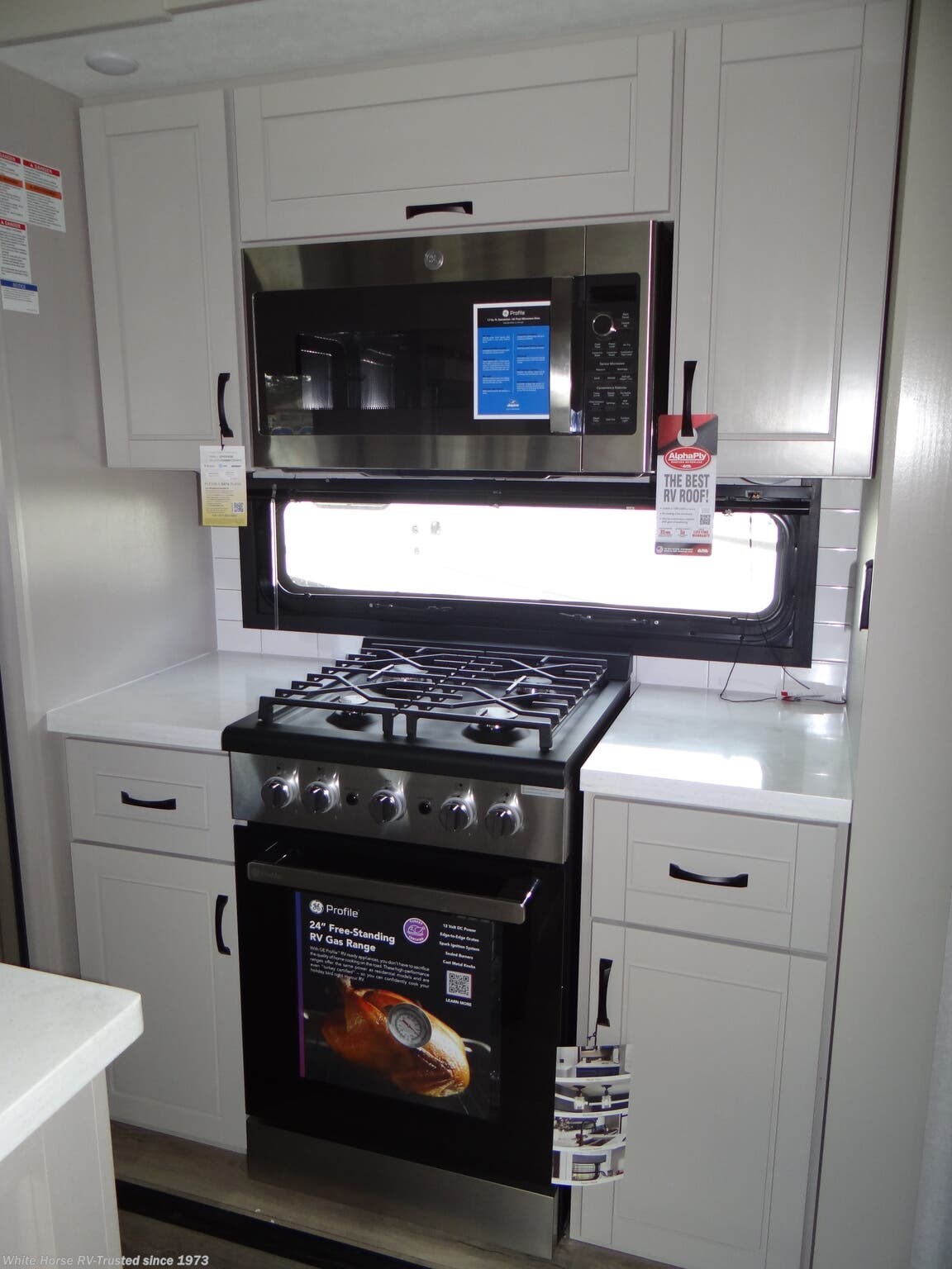 NP Luxury Package: 2nd Electric Patio Awning w/Integrated RGB Lights, 32" 4K Smart TV in Bedroom, 6 pt. Hydraulic Auto-Leveling System, Central Vacuum System w/Dust Port, Frameless Dark Tinted Safety Glass Windows, Freestanding Roll Top (No Pedestal) Table with 2- Freestanding Chairs and 2- Folding Chairs, GE 21 Cu Ft Residential Refrigerator w/1800W Inverter, GE 30" Space Saver Convection Microwave w/Built In Air Fryer, GE Profile Series Residential 24" Range (3.7 cu ft w/9100 BTU High Output Burner), High Gloss Gel-Coated Sidewalls, LED Fireplace w/Electric Space Heater, MORryde® StepAbove™ Entrance Steps (Main Entrance), Oversized Multi-Battery Compartment (Industry Leading Room for 4-6 Batteries), Privacy Day/Night Roller Shades in Living Room, Residential Solid-Surface Kitchen and Bathroom Countertops, Residential Walk In Shower w/ Shampoo/Soap Holder, Teak Seat and Shower Tower, Washer/Dryer Prep, Residential NuVo H2O Whole Coach Water System w/Water Softening and includes (3) Cartridges, Residential Do It All Kitchen Sink, JAYCOMMAND® "Smart RV System.