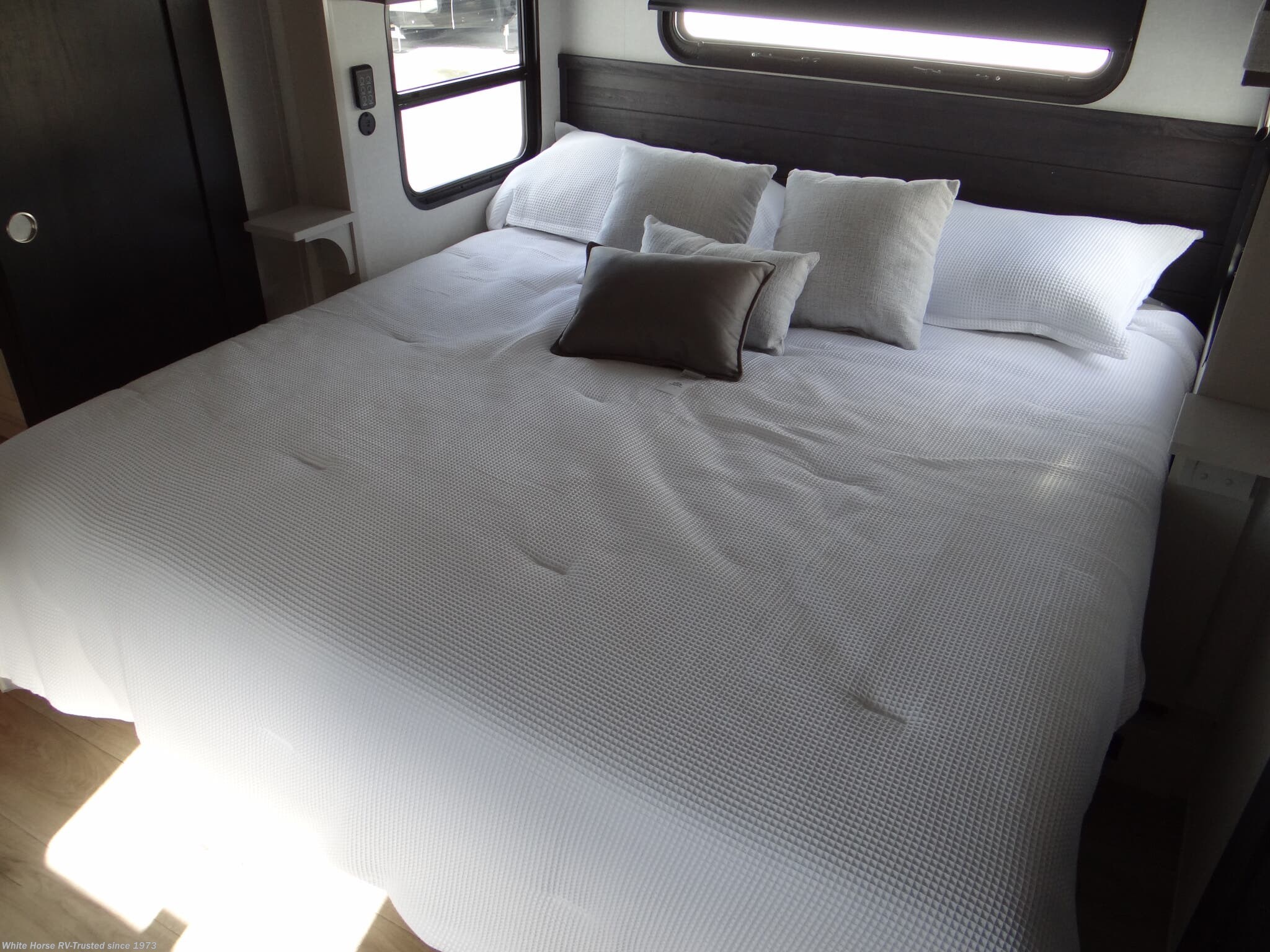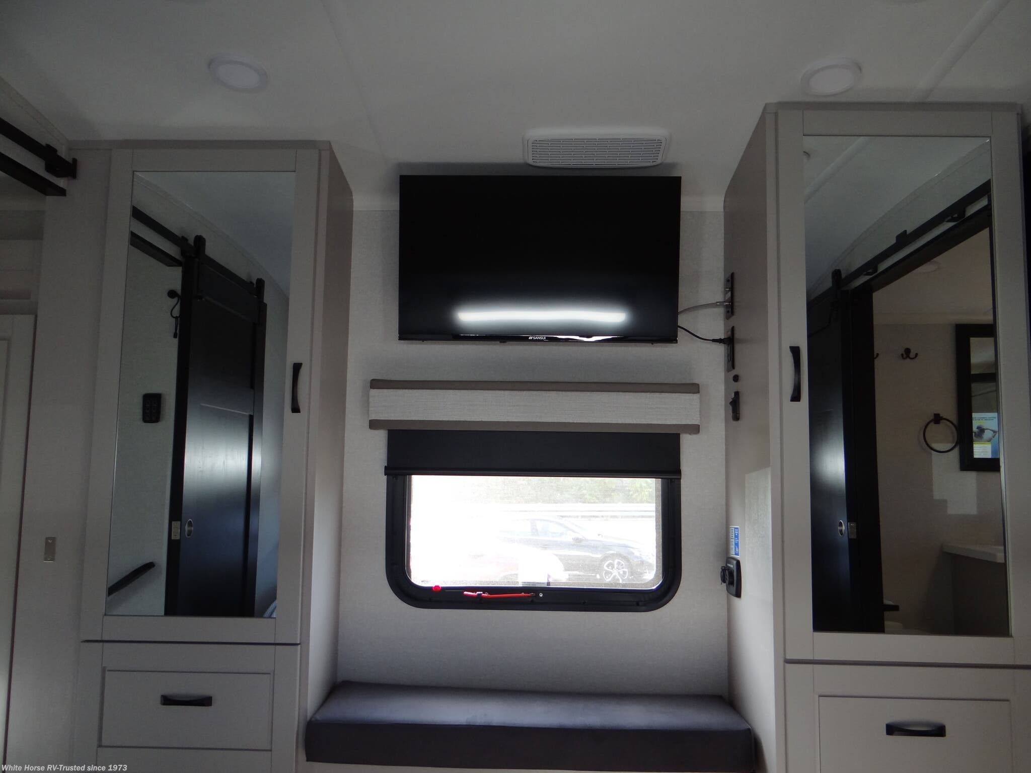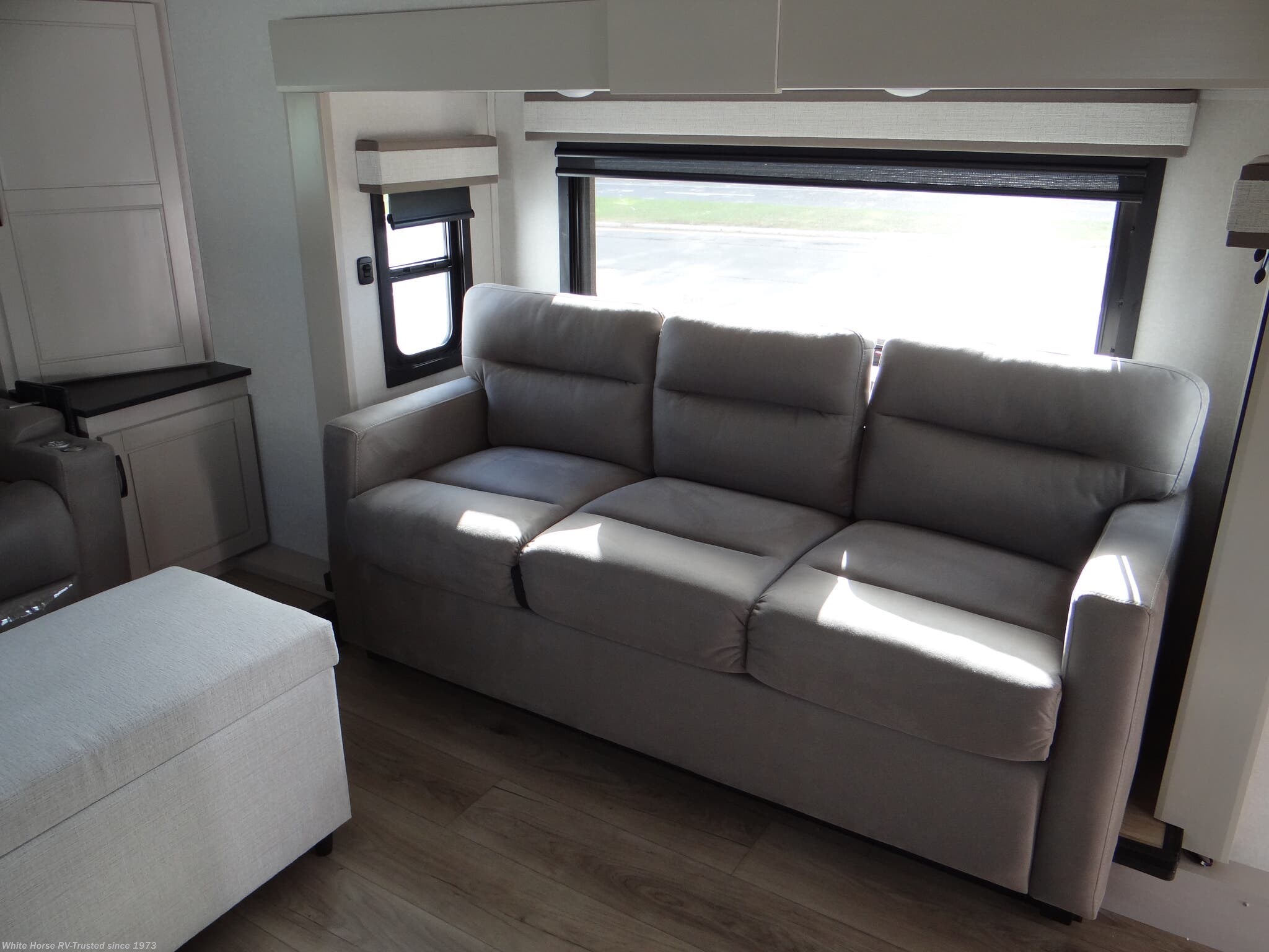 NP Luxury Package: 2nd Electric Patio Awning w/Integrated RGB Lights, 32" 4K Smart TV in Bedroom, 6 pt. Hydraulic Auto-Leveling System, Central Vacuum System w/Dust Port, Frameless Dark Tinted Safety Glass Windows, Freestanding Roll Top (No Pedestal) Table with 2- Freestanding Chairs and 2- Folding Chairs, GE 21 Cu Ft Residential Refrigerator w/1800W Inverter, GE 30" Space Saver Convection Microwave w/Built In Air Fryer, GE Profile Series Residential 24" Range (3.7 cu ft w/9100 BTU High Output Burner), High Gloss Gel-Coated Sidewalls, LED Fireplace w/Electric Space Heater, MORryde® StepAbove™ Entrance Steps (Main Entrance), Oversized Multi-Battery Compartment (Industry Leading Room for 4-6 Batteries), Privacy Day/Night Roller Shades in Living Room, Residential Solid-Surface Kitchen and Bathroom Countertops, Residential Walk In Shower w/ Shampoo/Soap Holder, Teak Seat and Shower Tower, Washer/Dryer Prep, Residential NuVo H2O Whole Coach Water System w/Water Softening and includes (3) Cartridges, Residential Do It All Kitchen Sink, JAYCOMMAND® "Smart RV System.