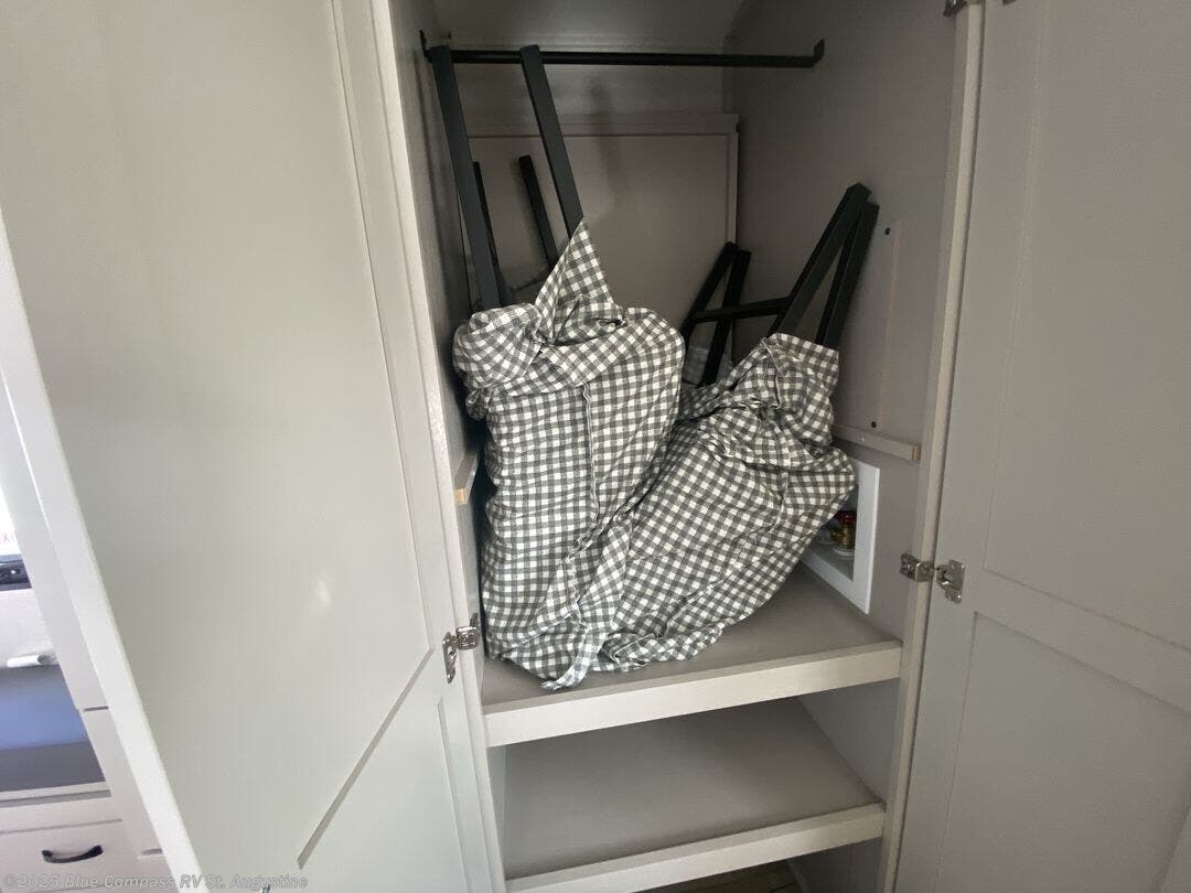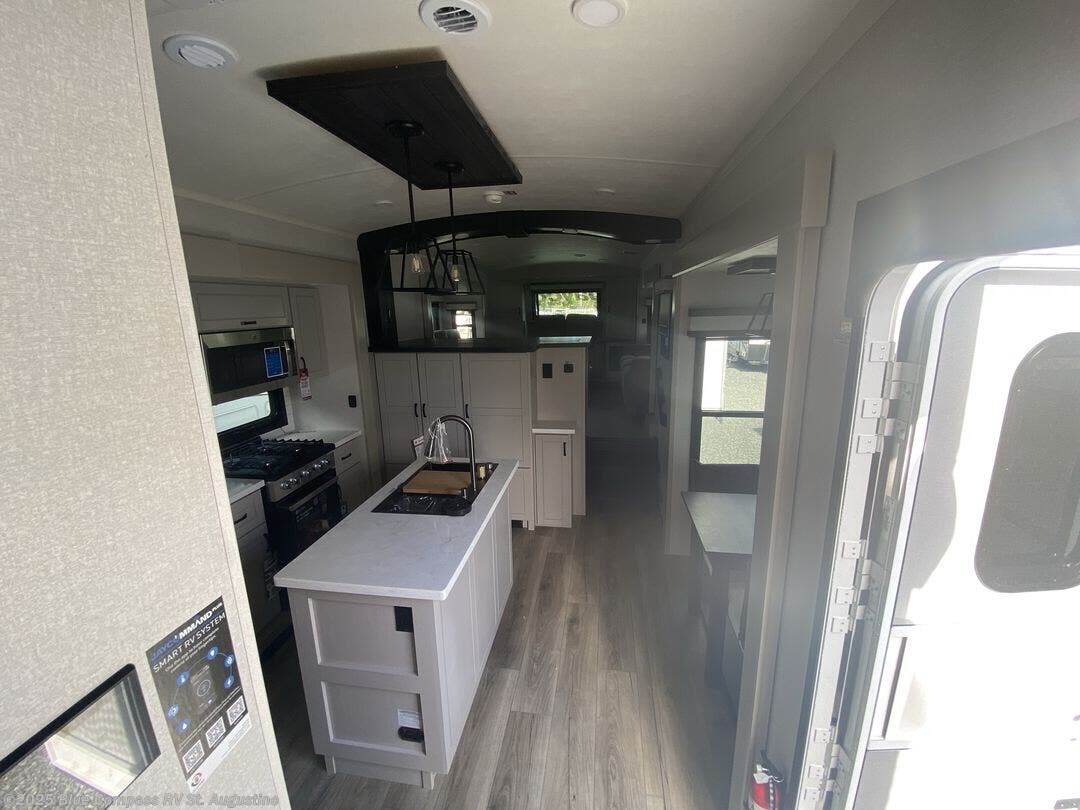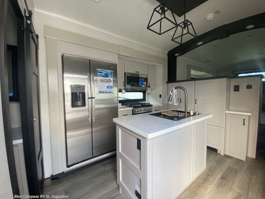 Entertainment can be found throughout this fifth wheel from the front living area with a 50" Smart LED HDTV with fully digital HDMI output and home entertainment system with subwoofer including a fireplace below that you can enjoy while relaxing on theater seats and two tri-fold sofas, a 32" TV in the middle kitchen and there is a bedroom 32" TV. You might even like to add the tailgate TV option along the exterior. Back inside the kitchen, the cook will love the center island, the pantry, the residential refrigerator, and the roll-top dinette. The half bath is a few steps away as an added convenience. The master bedroom includes a king bed slide, a bench, two wardrobes and a sliding door into the bathroom which offers two sinks, a space prepped for a washer/dryer option, and a walk-in shower. And don't forget about the exterior features such as the outside kitchen for more choices when making meals, the storage for your outdoor gear and chairs, and two awnings with integrated LED lighting.