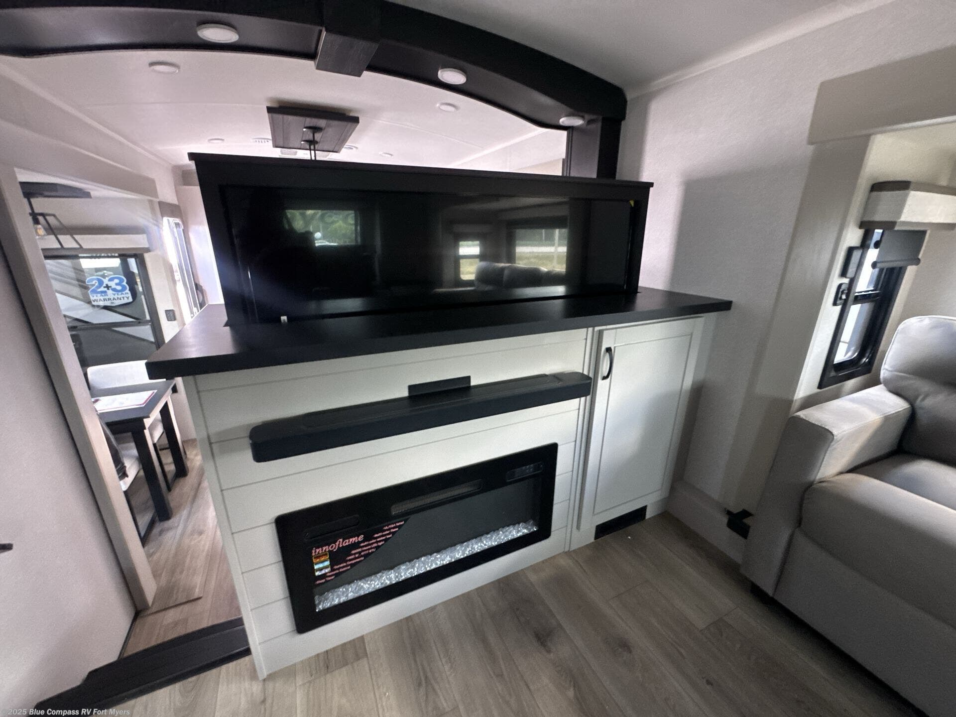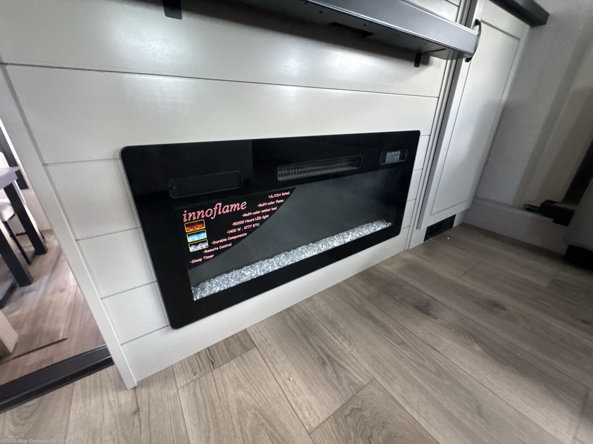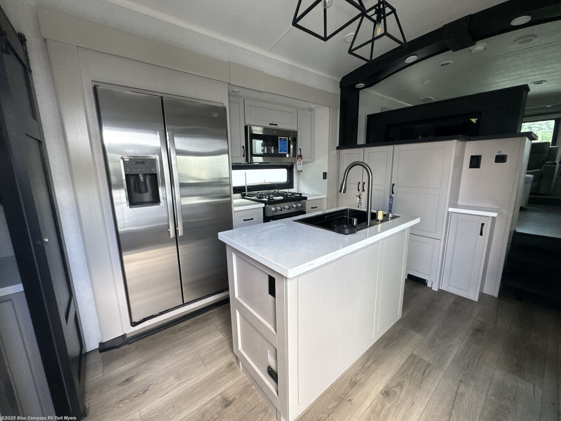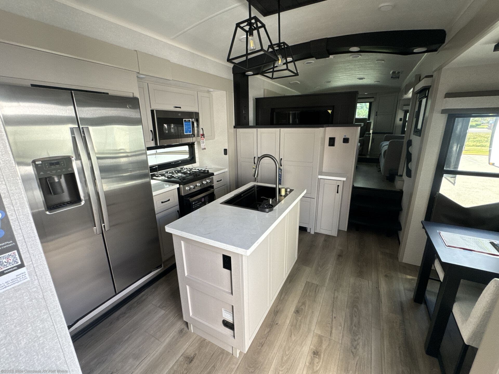 Entertainment can be found throughout this fifth wheel from the front living area with a 50" Smart LED HDTV with fully digital HDMI output and home entertainment system with subwoofer including a fireplace below that you can enjoy while relaxing on theater seats and two tri-fold sofas, a 32" TV in the middle kitchen and there is a bedroom 32" TV. You might even like to add the tailgate TV option along the exterior. Back inside the kitchen, the cook will love the center island, the pantry, the residential refrigerator, and the roll-top dinette. The half bath is a few steps away as an added convenience. The master bedroom includes a king bed slide, a bench, two wardrobes and a sliding door into the bathroom which offers two sinks, a space prepped for a washer/dryer option, and a walk-in shower. And don't forget about the exterior features such as the outside kitchen for more choices when making meals, the storage for your outdoor gear and chairs, and two awnings with integrated LED lighting.