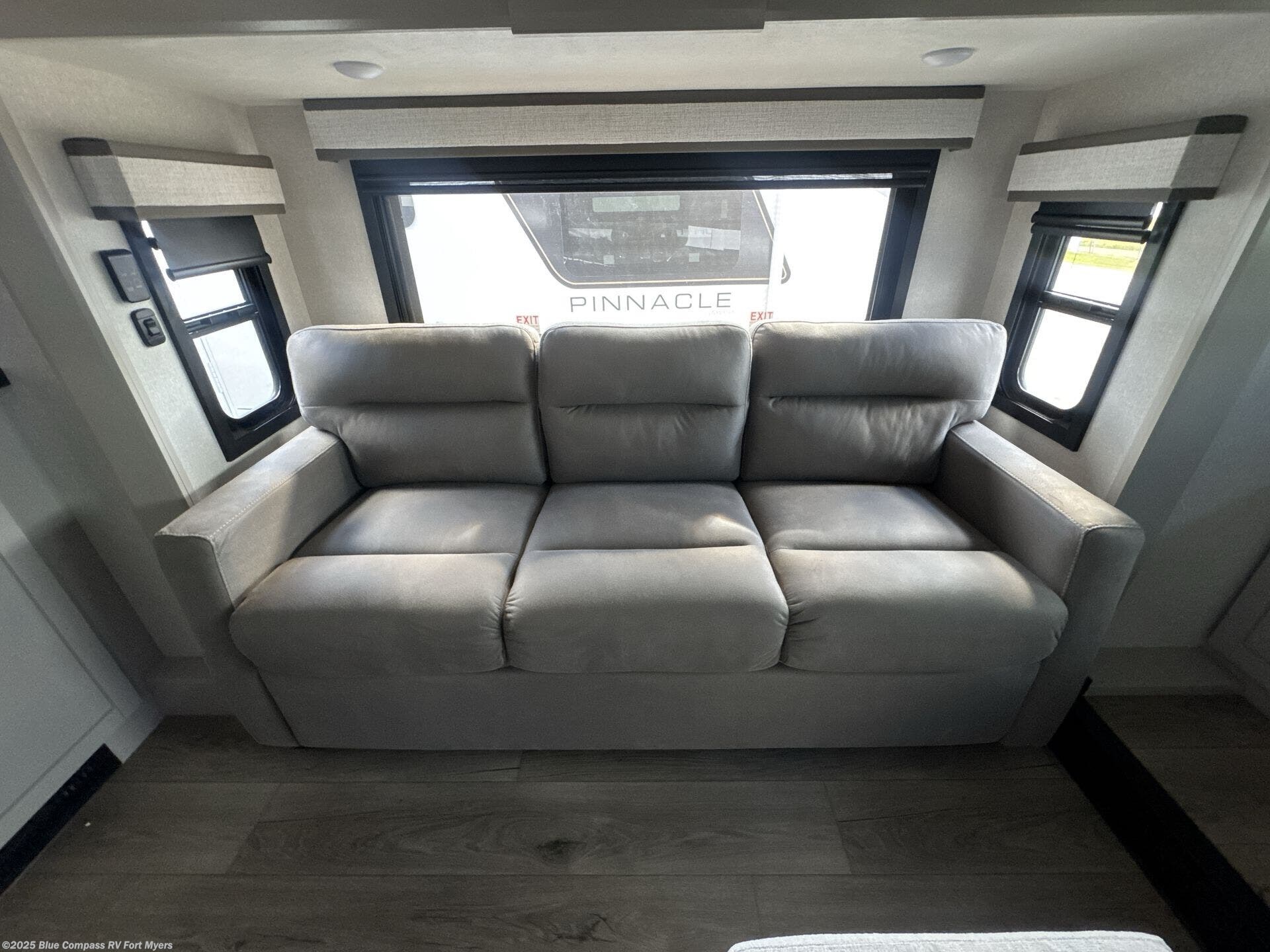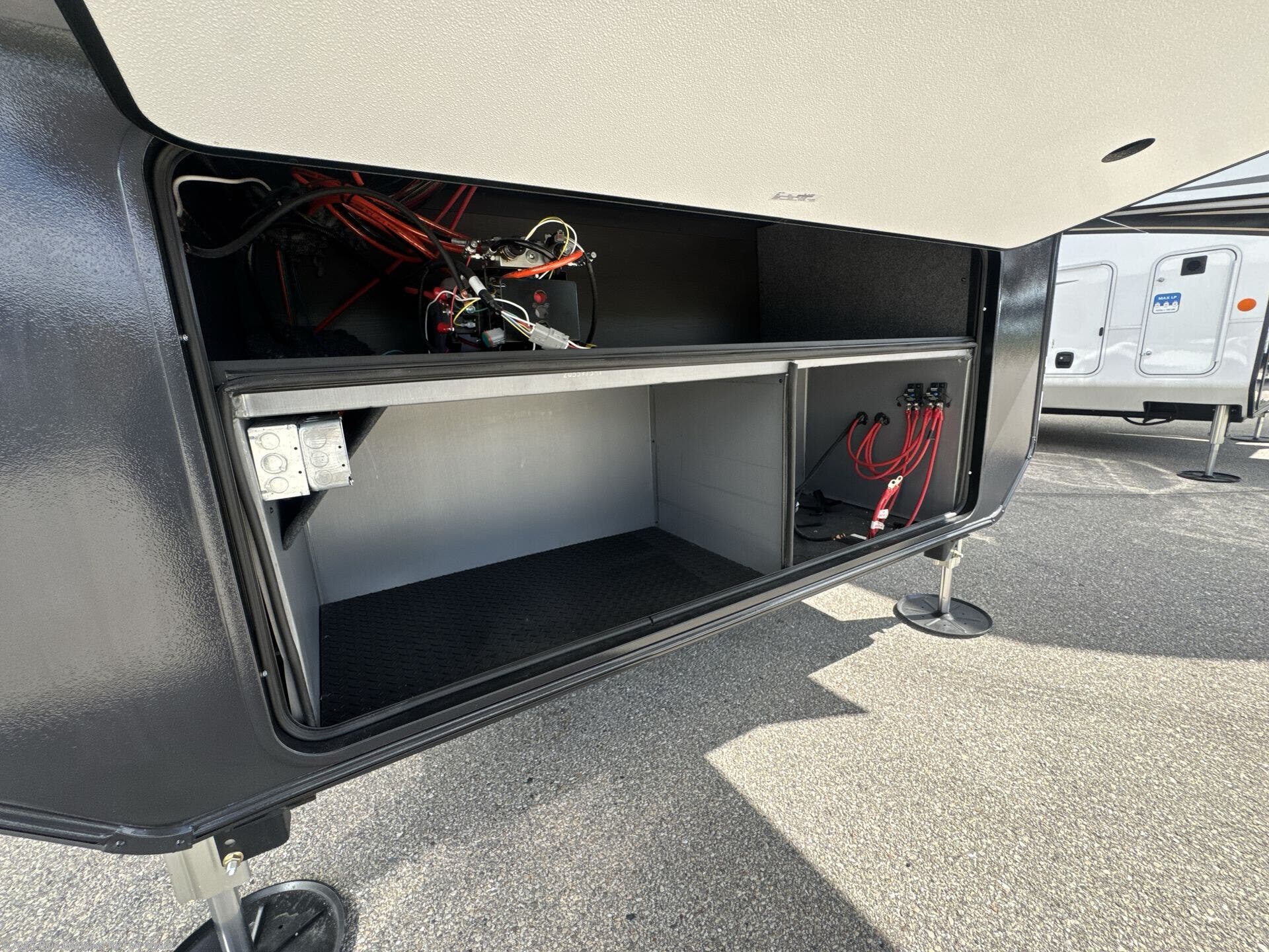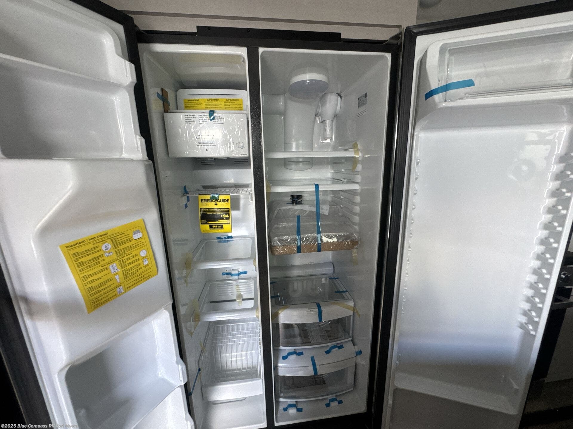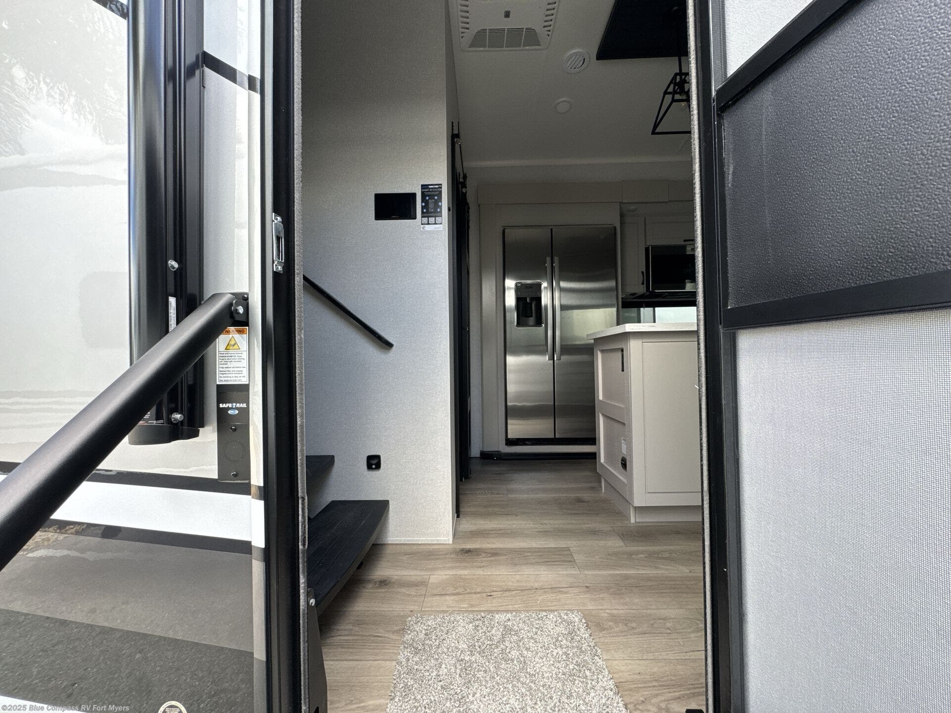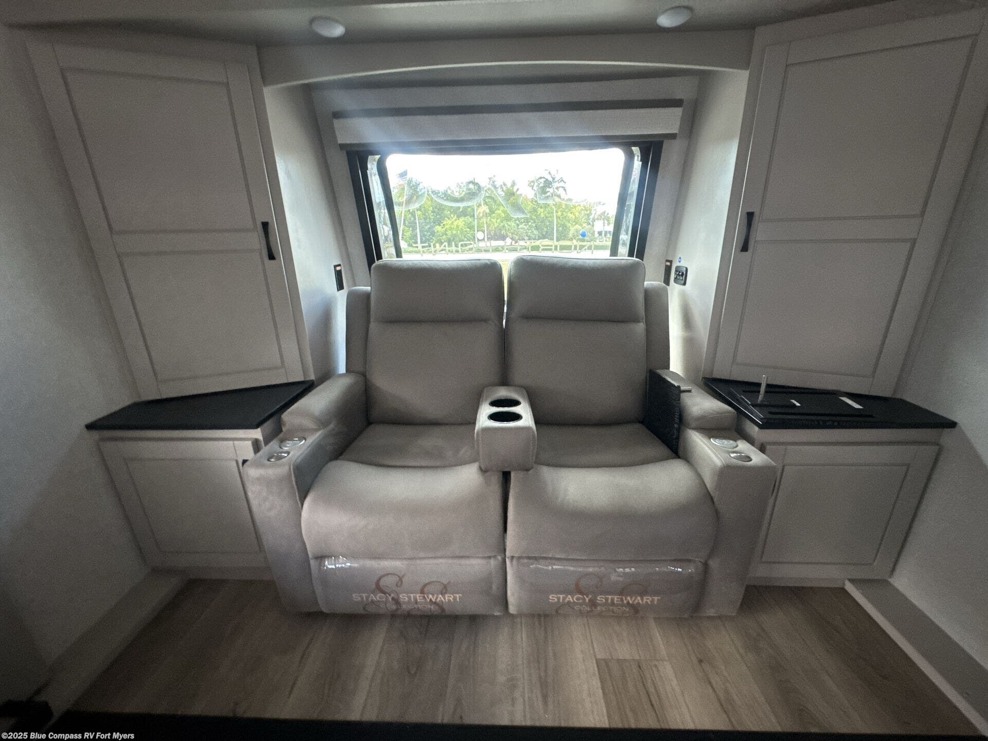 Entertainment can be found throughout this fifth wheel from the front living area with a 50" Smart LED HDTV with fully digital HDMI output and home entertainment system with subwoofer including a fireplace below that you can enjoy while relaxing on theater seats and two tri-fold sofas, a 32" TV in the middle kitchen and there is a bedroom 32" TV. You might even like to add the tailgate TV option along the exterior. Back inside the kitchen, the cook will love the center island, the pantry, the residential refrigerator, and the roll-top dinette. The half bath is a few steps away as an added convenience. The master bedroom includes a king bed slide, a bench, two wardrobes and a sliding door into the bathroom which offers two sinks, a space prepped for a washer/dryer option, and a walk-in shower. And don't forget about the exterior features such as the outside kitchen for more choices when making meals, the storage for your outdoor gear and chairs, and two awnings with integrated LED lighting.