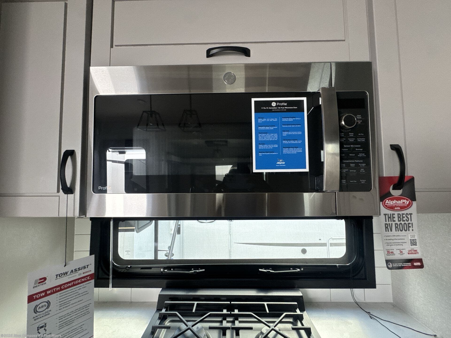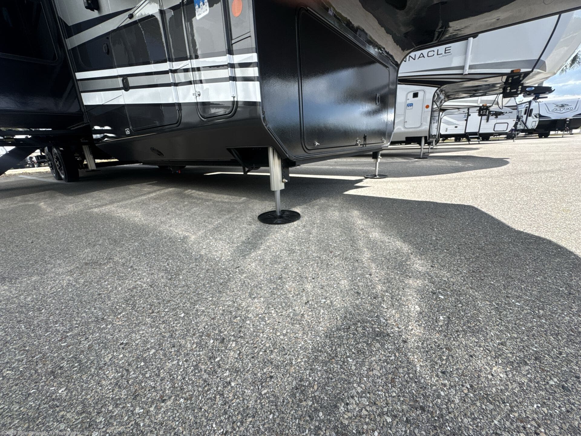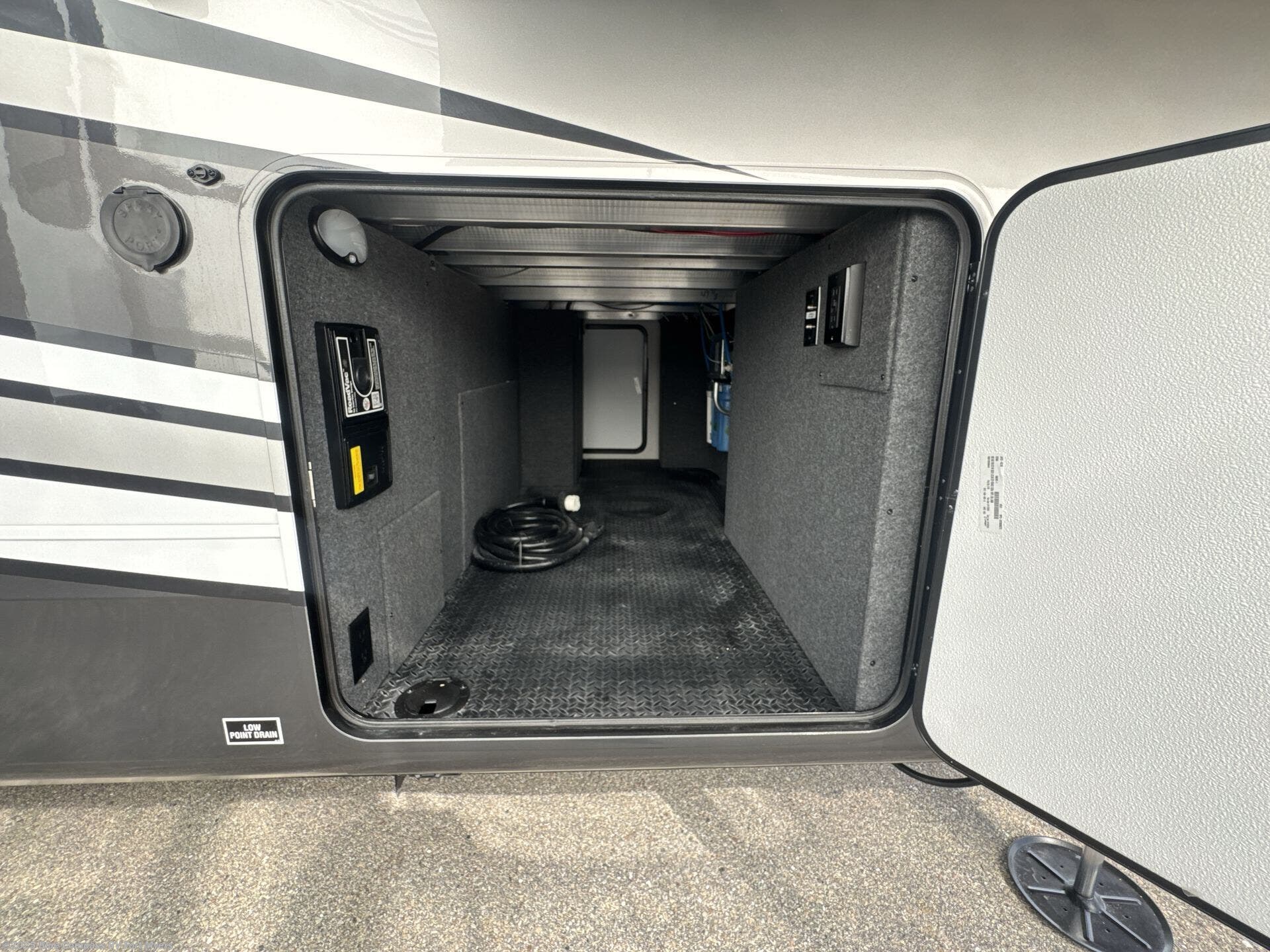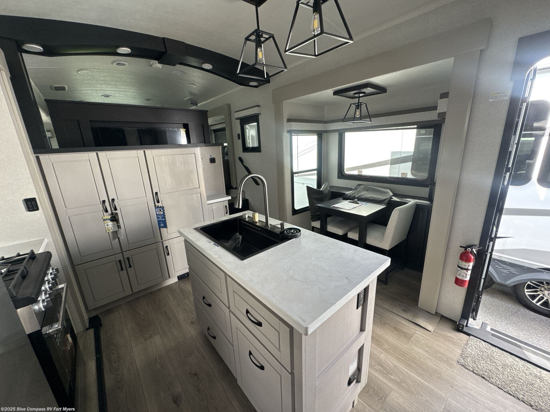 Entertainment can be found throughout this fifth wheel from the front living area with a 50" Smart LED HDTV with fully digital HDMI output and home entertainment system with subwoofer including a fireplace below that you can enjoy while relaxing on theater seats and two tri-fold sofas, a 32" TV in the middle kitchen and there is a bedroom 32" TV. You might even like to add the tailgate TV option along the exterior. Back inside the kitchen, the cook will love the center island, the pantry, the residential refrigerator, and the roll-top dinette. The half bath is a few steps away as an added convenience. The master bedroom includes a king bed slide, a bench, two wardrobes and a sliding door into the bathroom which offers two sinks, a space prepped for a washer/dryer option, and a walk-in shower. And don't forget about the exterior features such as the outside kitchen for more choices when making meals, the storage for your outdoor gear and chairs, and two awnings with integrated LED lighting.