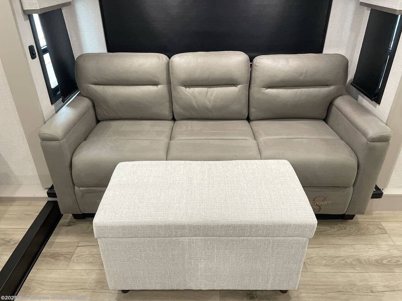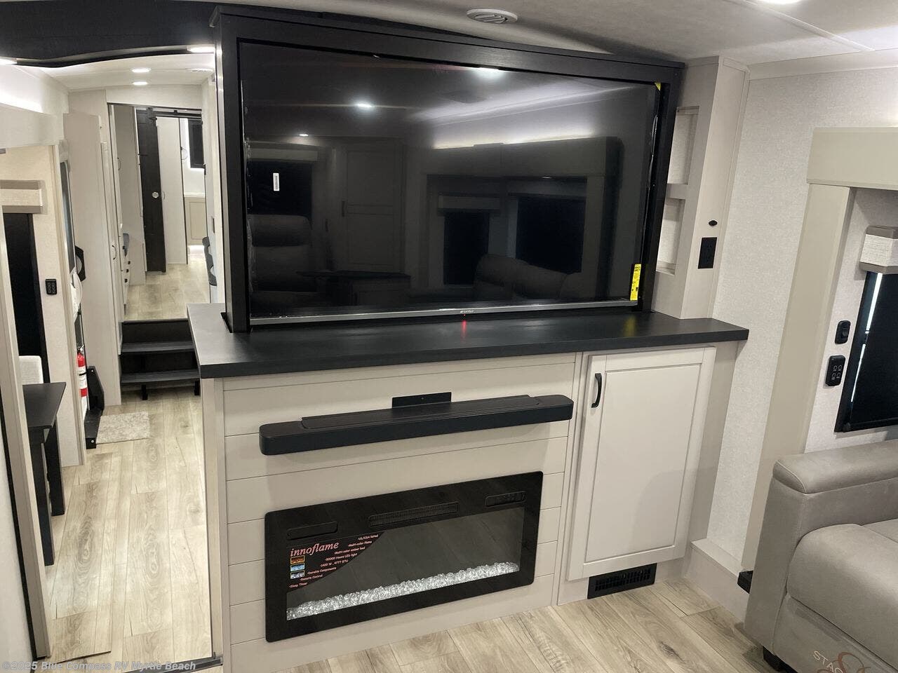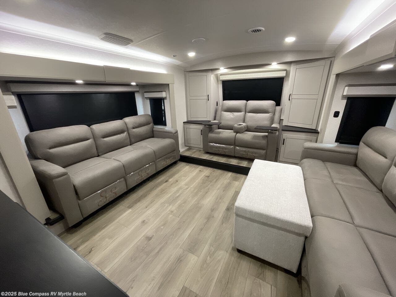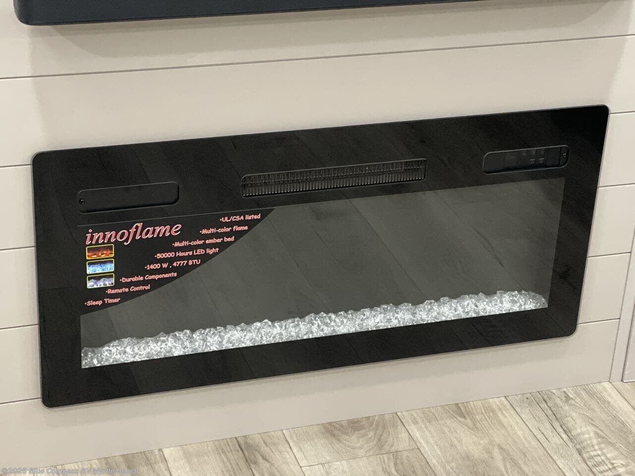 Entertainment can be found throughout this fifth wheel from the front living area with a 50" Smart LED HDTV with fully digital HDMI output and home entertainment system with subwoofer including a fireplace below that you can enjoy while relaxing on theater seats and two tri-fold sofas, a 32" TV in the middle kitchen and there is a bedroom 32" TV. You might even like to add the tailgate TV option along the exterior. Back inside the kitchen, the cook will love the center island, the pantry, the residential refrigerator, and the roll-top dinette. The half bath is a few steps away as an added convenience. The master bedroom includes a king bed slide, a bench, two wardrobes and a sliding door into the bathroom which offers two sinks, a space prepped for a washer/dryer option, and a walk-in shower. And don't forget about the exterior features such as the outside kitchen for more choices when making meals, the storage for your outdoor gear and chairs, and two awnings with integrated LED lighting.