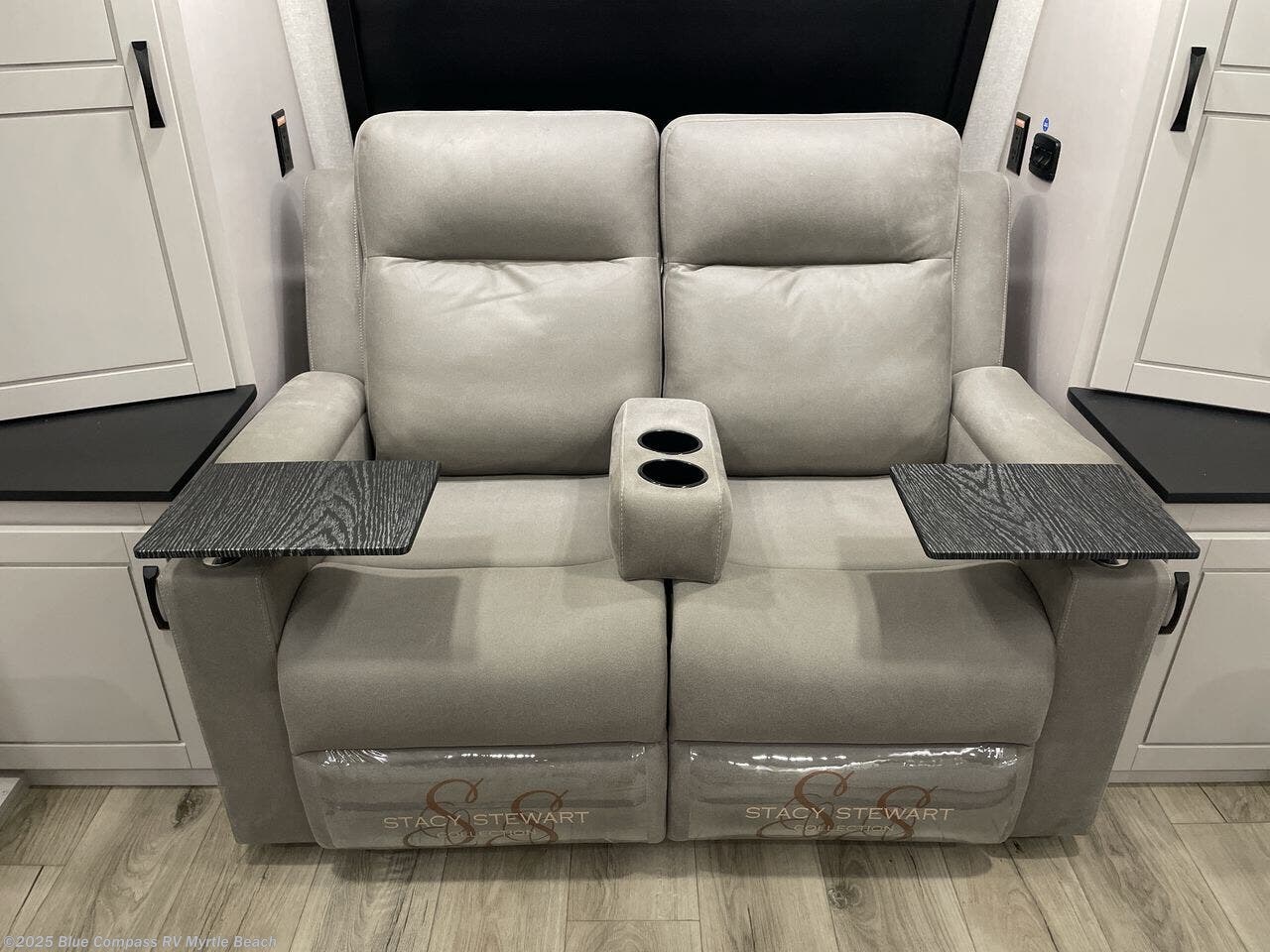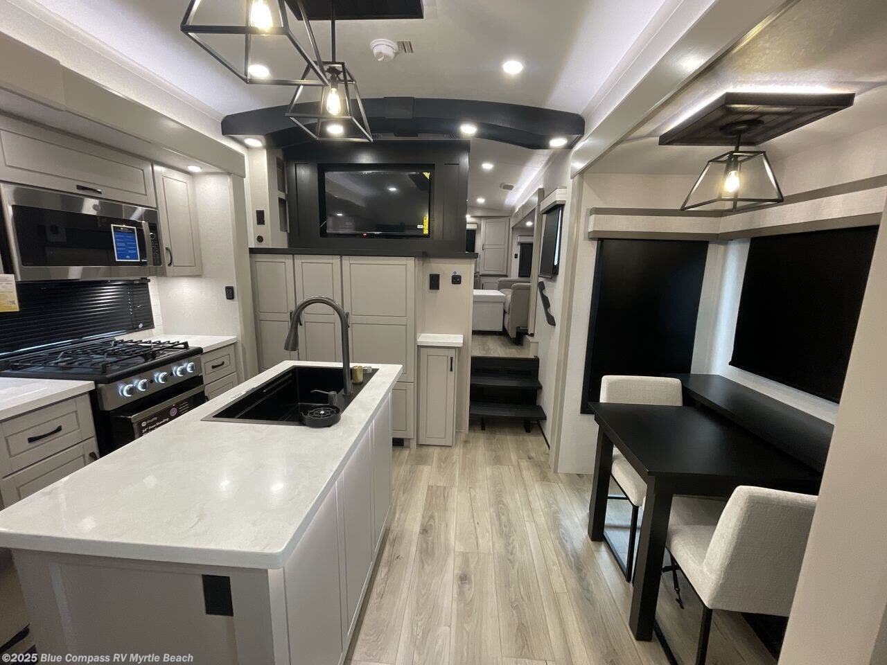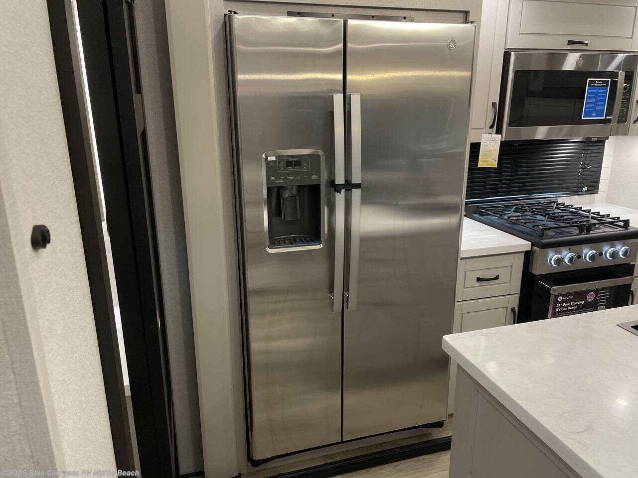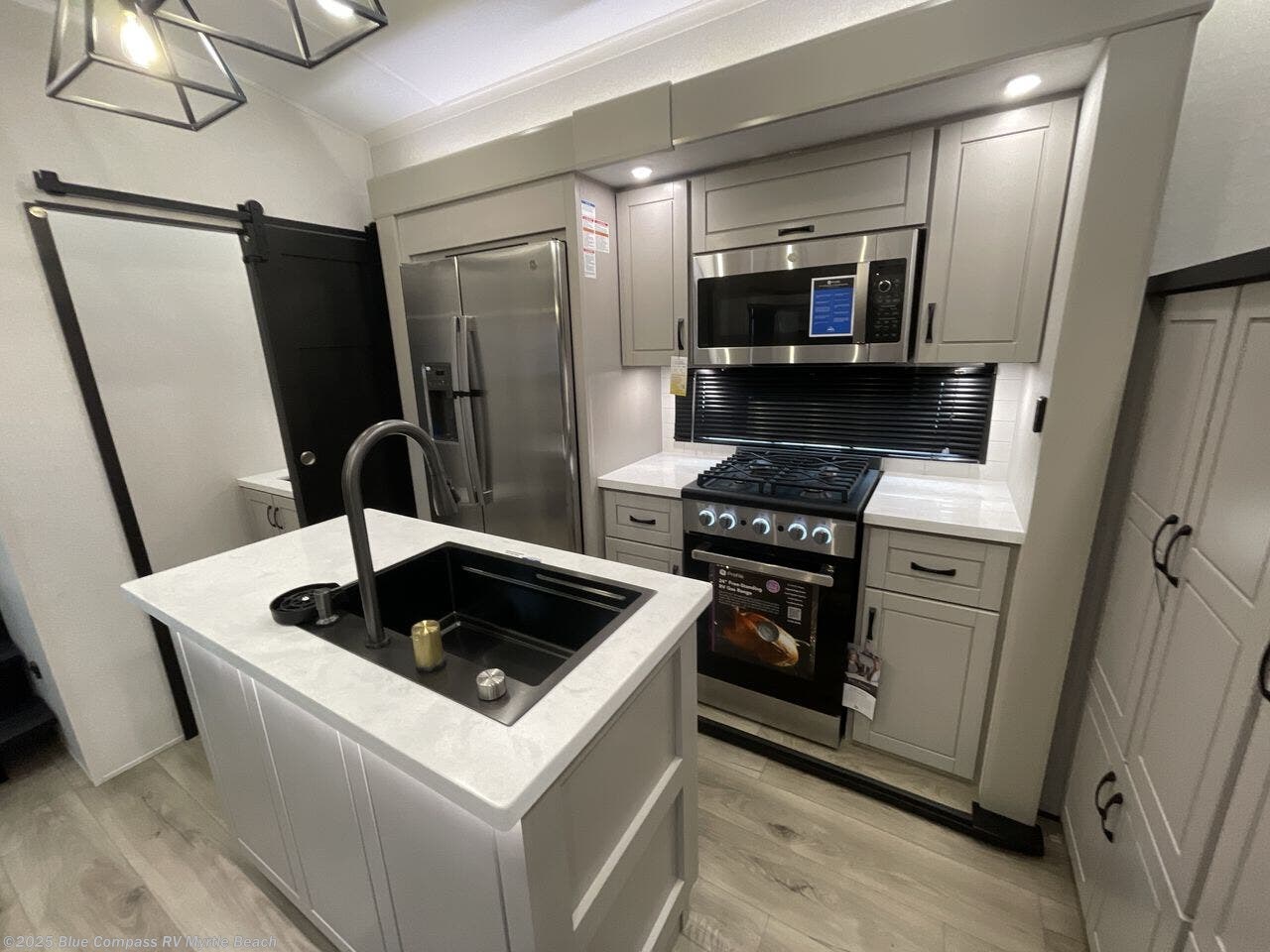 Entertainment can be found throughout this fifth wheel from the front living area with a 50" Smart LED HDTV with fully digital HDMI output and home entertainment system with subwoofer including a fireplace below that you can enjoy while relaxing on theater seats and two tri-fold sofas, a 32" TV in the middle kitchen and there is a bedroom 32" TV. You might even like to add the tailgate TV option along the exterior. Back inside the kitchen, the cook will love the center island, the pantry, the residential refrigerator, and the roll-top dinette. The half bath is a few steps away as an added convenience. The master bedroom includes a king bed slide, a bench, two wardrobes and a sliding door into the bathroom which offers two sinks, a space prepped for a washer/dryer option, and a walk-in shower. And don't forget about the exterior features such as the outside kitchen for more choices when making meals, the storage for your outdoor gear and chairs, and two awnings with integrated LED lighting.