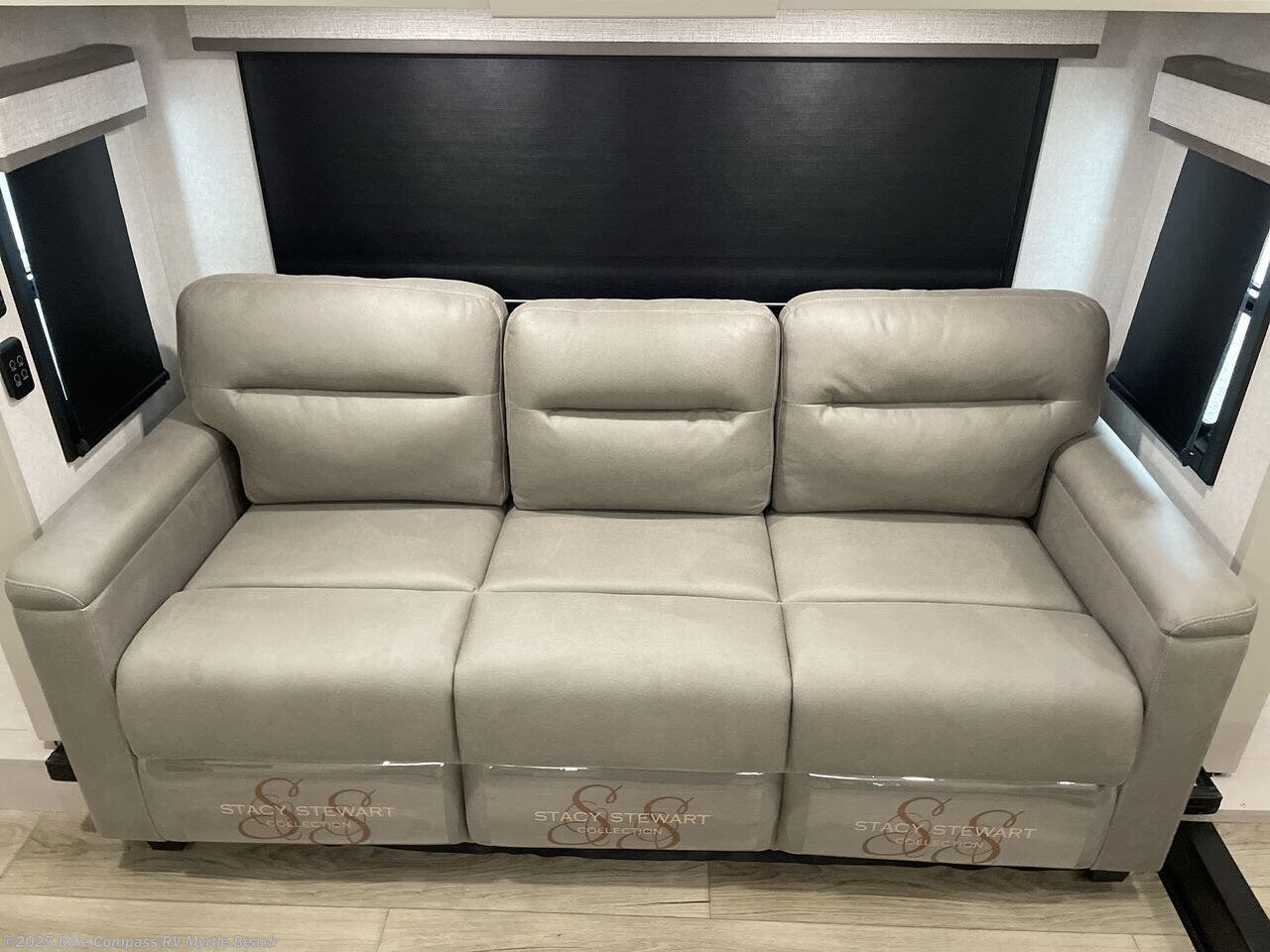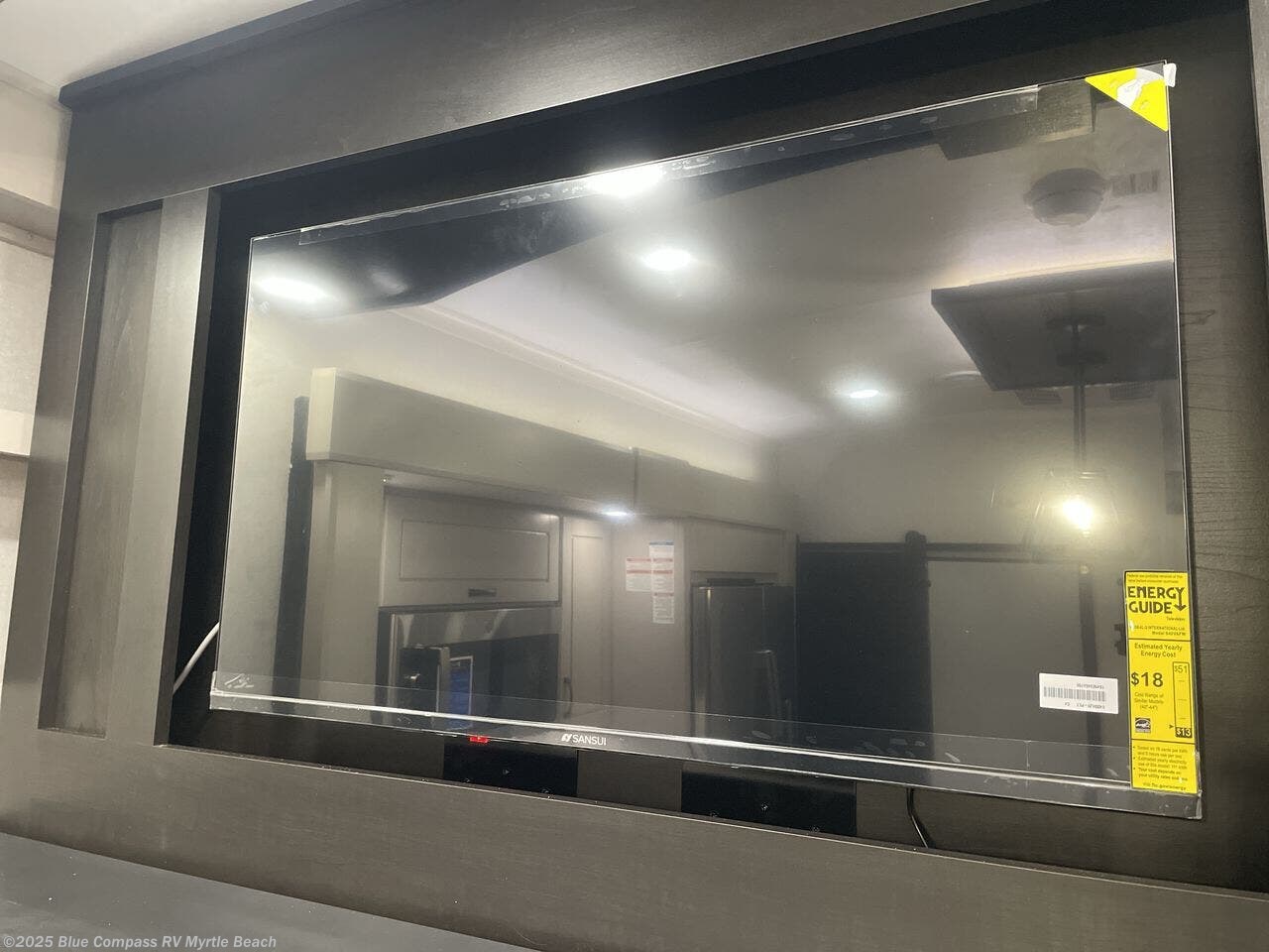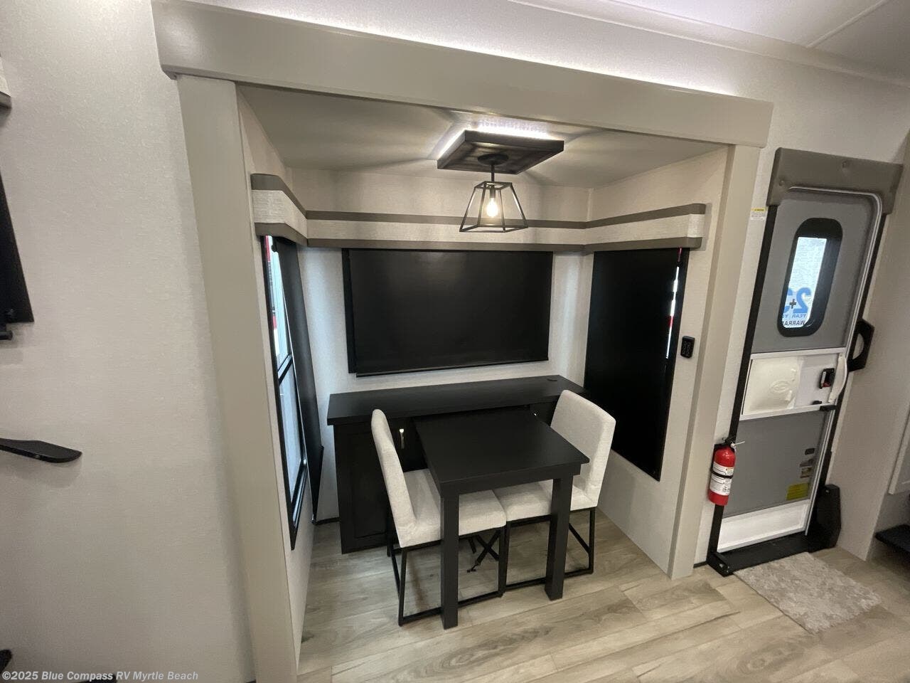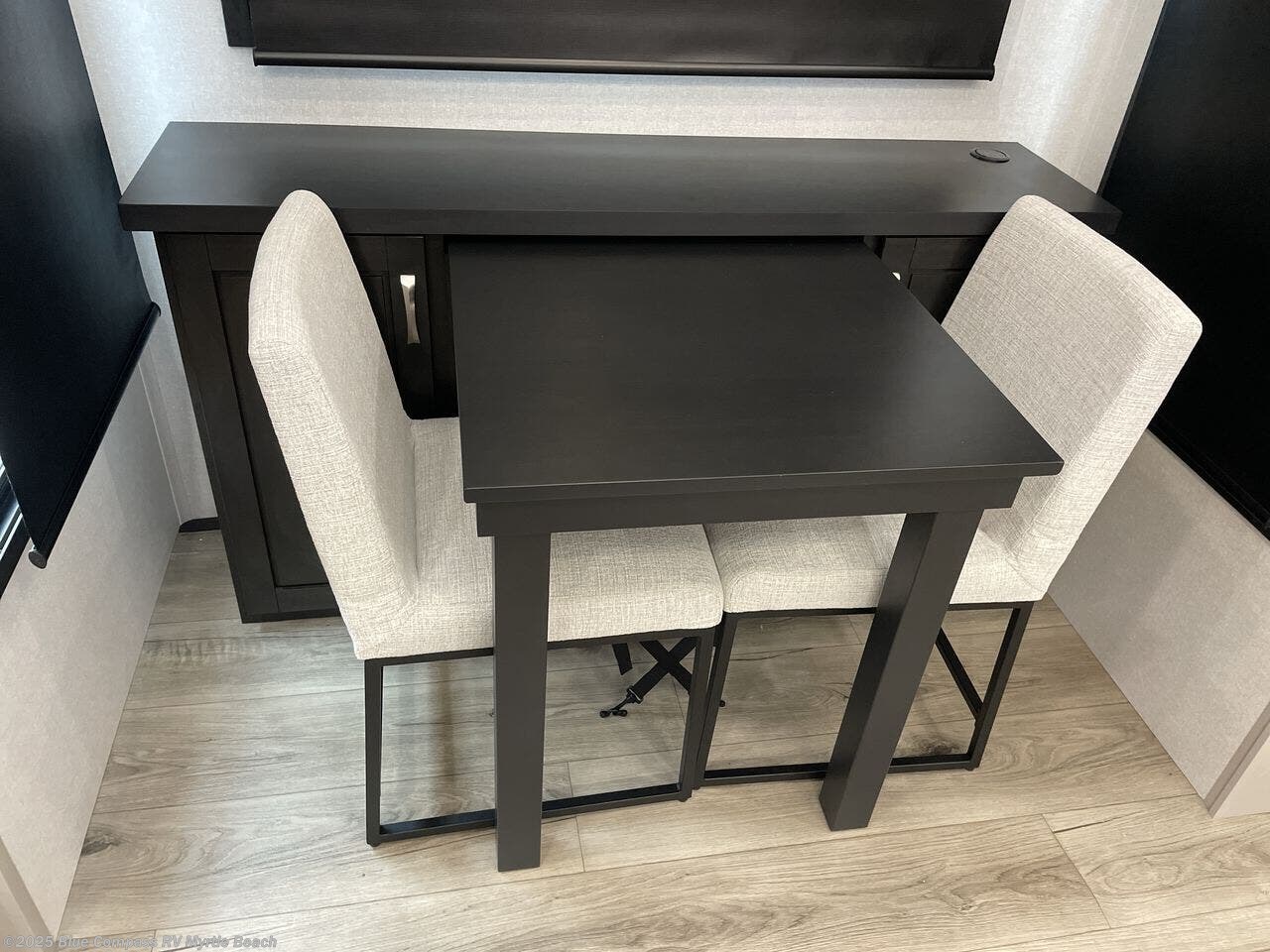Entertainment can be found throughout this fifth wheel from the front living area with a 50" Smart LED HDTV with fully digital HDMI output and home entertainment system with subwoofer including a fireplace below that you can enjoy while relaxing on theater seats and two tri-fold sofas, a 32" TV in the middle kitchen and there is a bedroom 32" TV. You might even like to add the tailgate TV option along the exterior. Back inside the kitchen, the cook will love the center island, the pantry, the residential refrigerator, and the roll-top dinette. The half bath is a few steps away as an added convenience. The master bedroom includes a king bed slide, a bench, two wardrobes and a sliding door into the bathroom which offers two sinks, a space prepped for a washer/dryer option, and a walk-in shower. And don't forget about the exterior features such as the outside kitchen for more choices when making meals, the storage for your outdoor gear and chairs, and two awnings with integrated LED lighting.