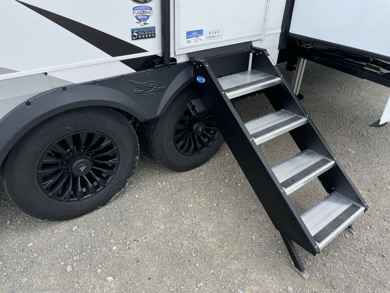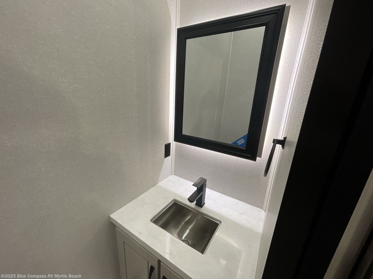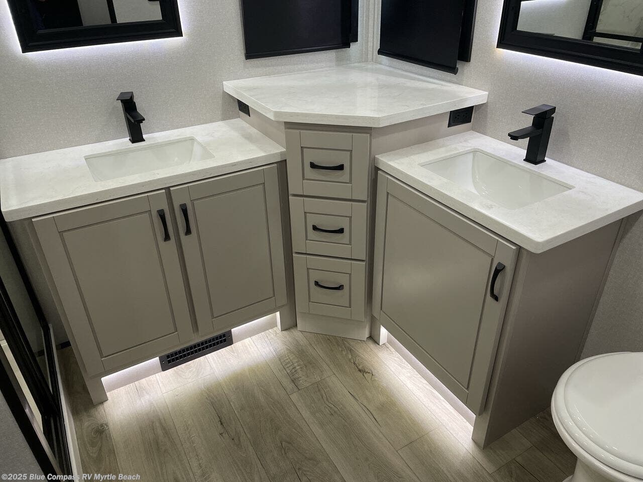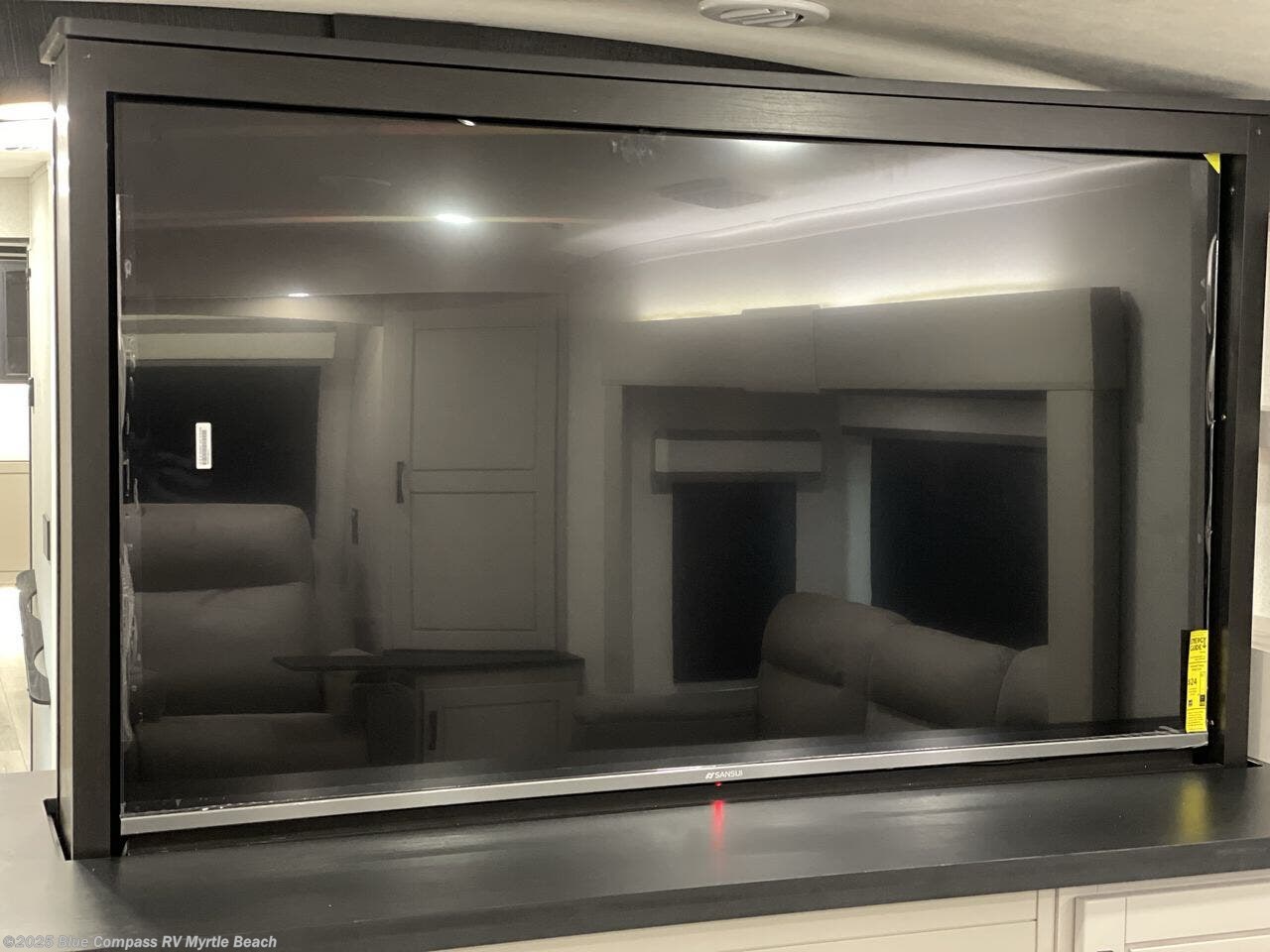 Entertainment can be found throughout this fifth wheel from the front living area with a 50" Smart LED HDTV with fully digital HDMI output and home entertainment system with subwoofer including a fireplace below that you can enjoy while relaxing on theater seats and two tri-fold sofas, a 32" TV in the middle kitchen and there is a bedroom 32" TV. You might even like to add the tailgate TV option along the exterior. Back inside the kitchen, the cook will love the center island, the pantry, the residential refrigerator, and the roll-top dinette. The half bath is a few steps away as an added convenience. The master bedroom includes a king bed slide, a bench, two wardrobes and a sliding door into the bathroom which offers two sinks, a space prepped for a washer/dryer option, and a walk-in shower. And don't forget about the exterior features such as the outside kitchen for more choices when making meals, the storage for your outdoor gear and chairs, and two awnings with integrated LED lighting.