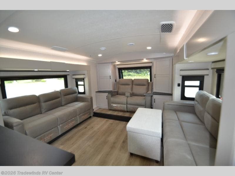 Entertainment can be found throughout this fifth wheel from the front living area with a 4K Smart LED HDTV with fully digital HDMI output and home entertainment system with subwoofer including a fireplace below that you can enjoy while relaxing on theater seats and two tri-fold sofas, a 40" TV in the middle kitchen and there is a bedroom 32" TV. Back inside the kitchen, the cook will love the center island, the pantry, the residential refrigerator, and the roll-top dinette. The half bath is a few steps away as an added convenience. The master bedroom includes a king bed slide, a bench, two wardrobes and a sliding door into the bathroom which offers two sinks, a space prepped for a washer/dryer option, and a walk-in shower. And don't forget about the exterior features such as the outside kitchen for more choices when making meals, the storage for your outdoor gear and chairs, and two awnings with integrated LED lighting.