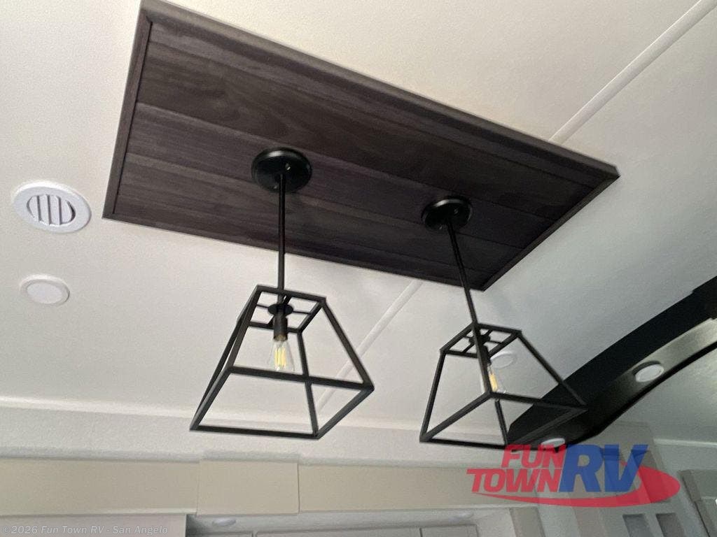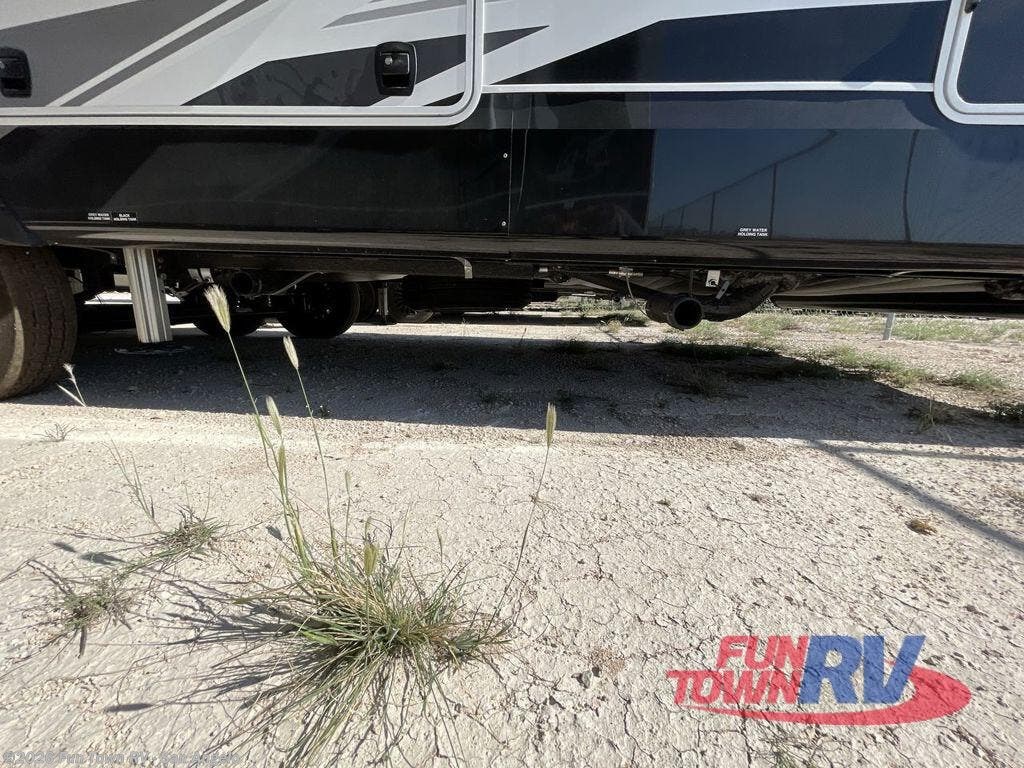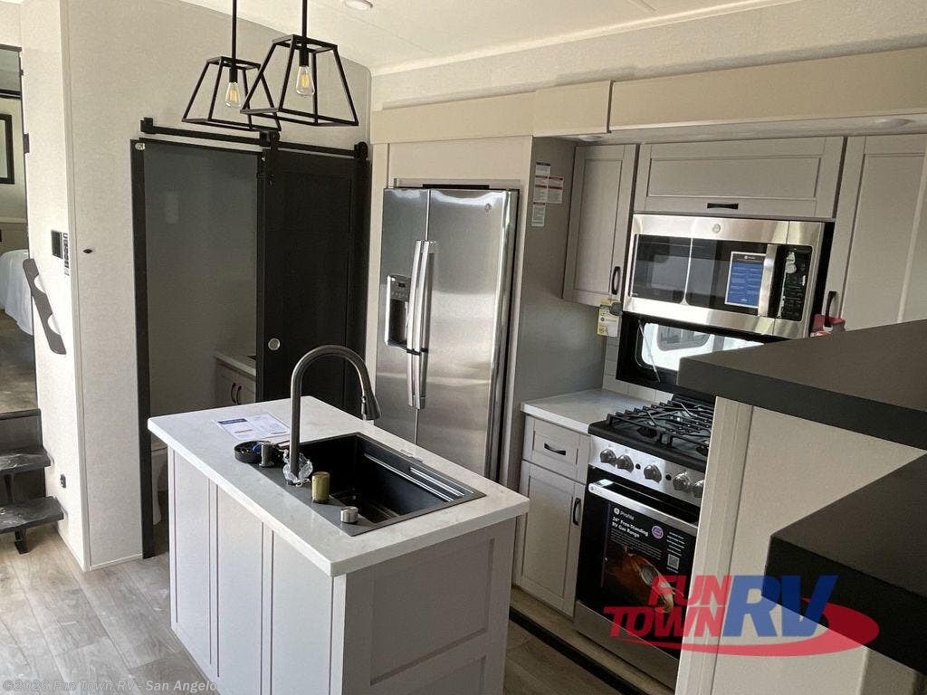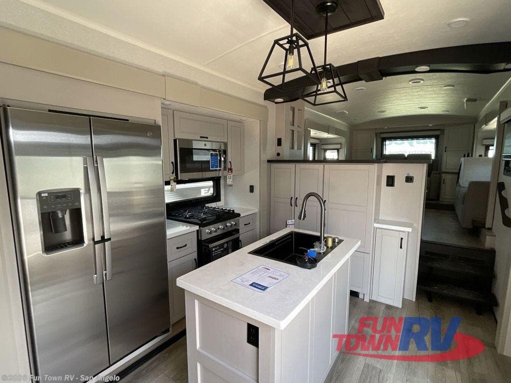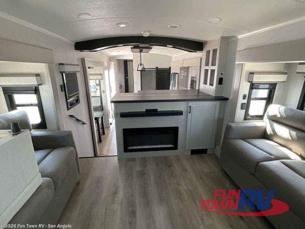 Entertainment can be found throughout this fifth wheel from the front living area with a 50" Smart LED HDTV with fully digital HDMI output and home entertainment system with subwoofer including a fireplace below that you can enjoy while relaxing on theater seats and two tri-fold sofas, a 32" TV in the middle kitchen and there is a bedroom 32" TV. You might even like to add the tailgate TV option along the exterior. Back inside the kitchen, the cook will love the center island, the pantry, the residential refrigerator, and the roll-top dinette. The half bath is a few steps away as an added convenience. The master bedroom includes a king bed slide, a bench, two wardrobes and a sliding door into the bathroom which offers two sinks, a space prepped for a washer/dryer option, and a walk-in shower. And don't forget about the exterior features such as the outside kitchen for more choices when making meals, the storage for your outdoor gear and chairs, and two awnings with integrated LED lighting.