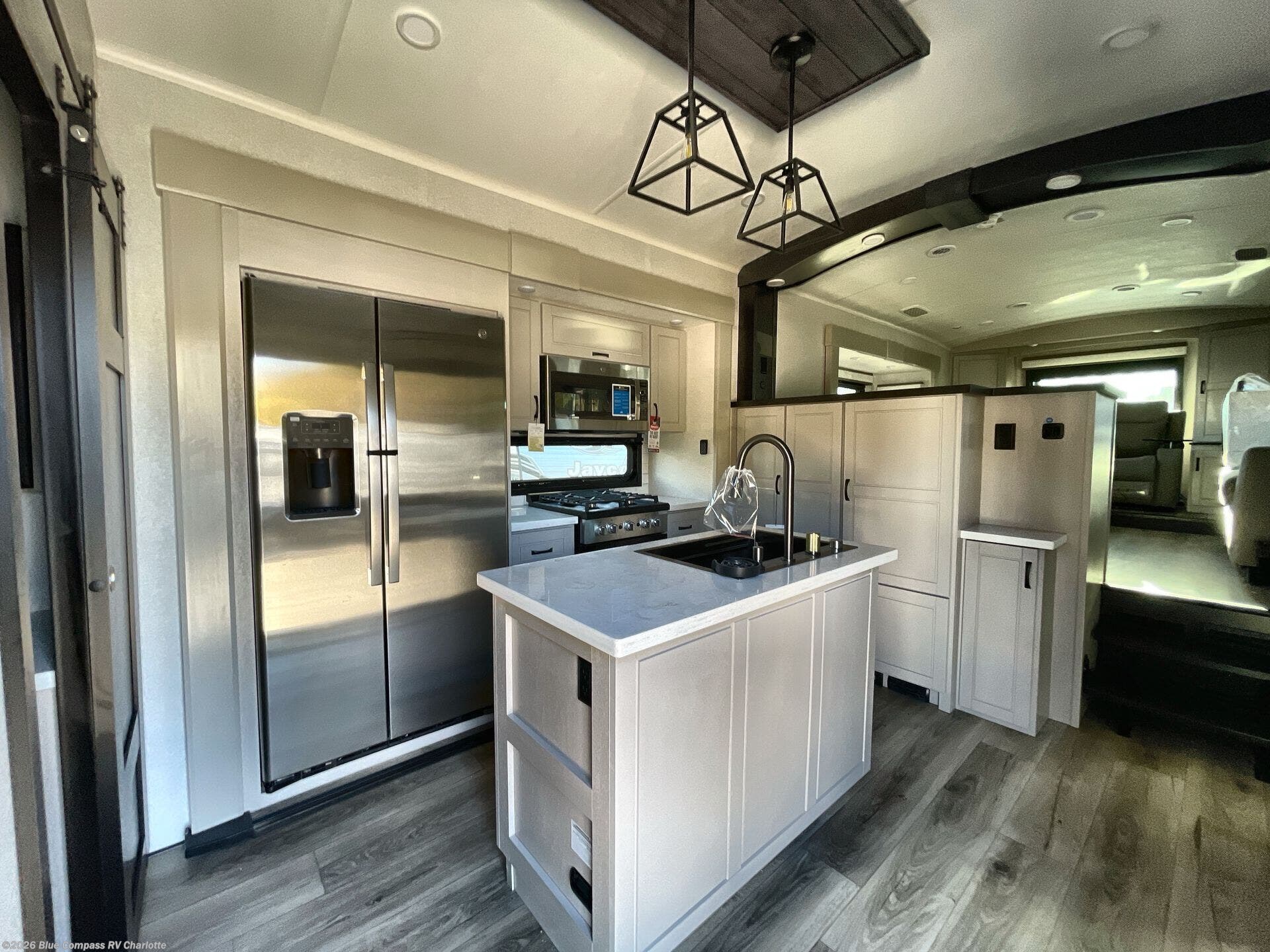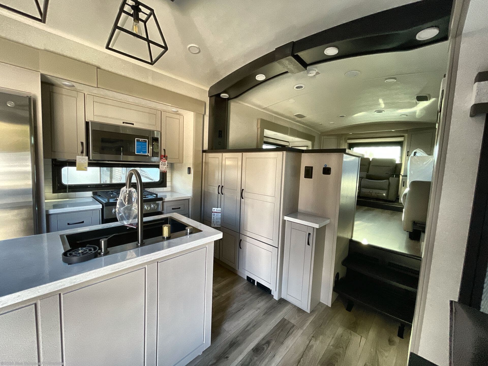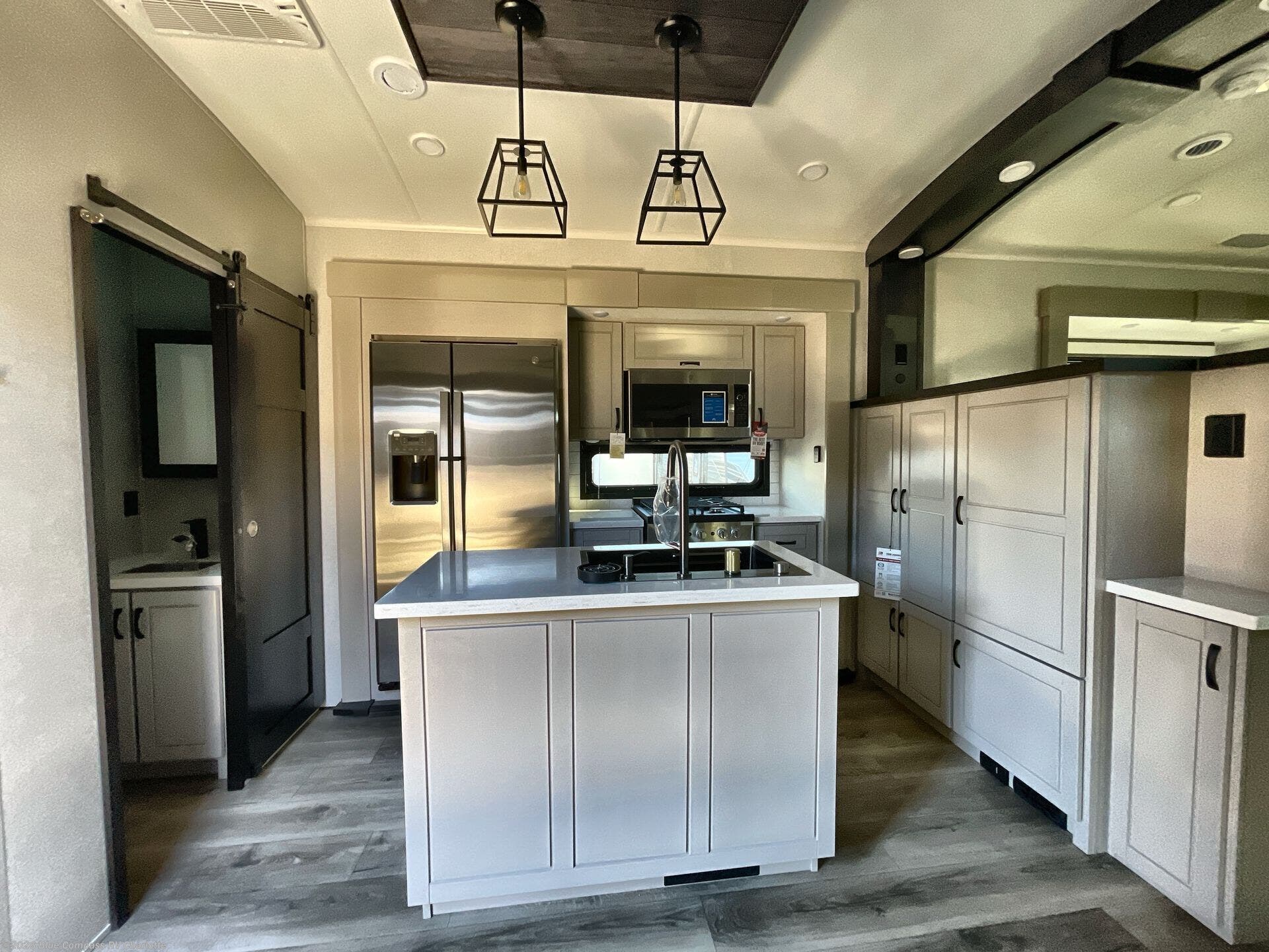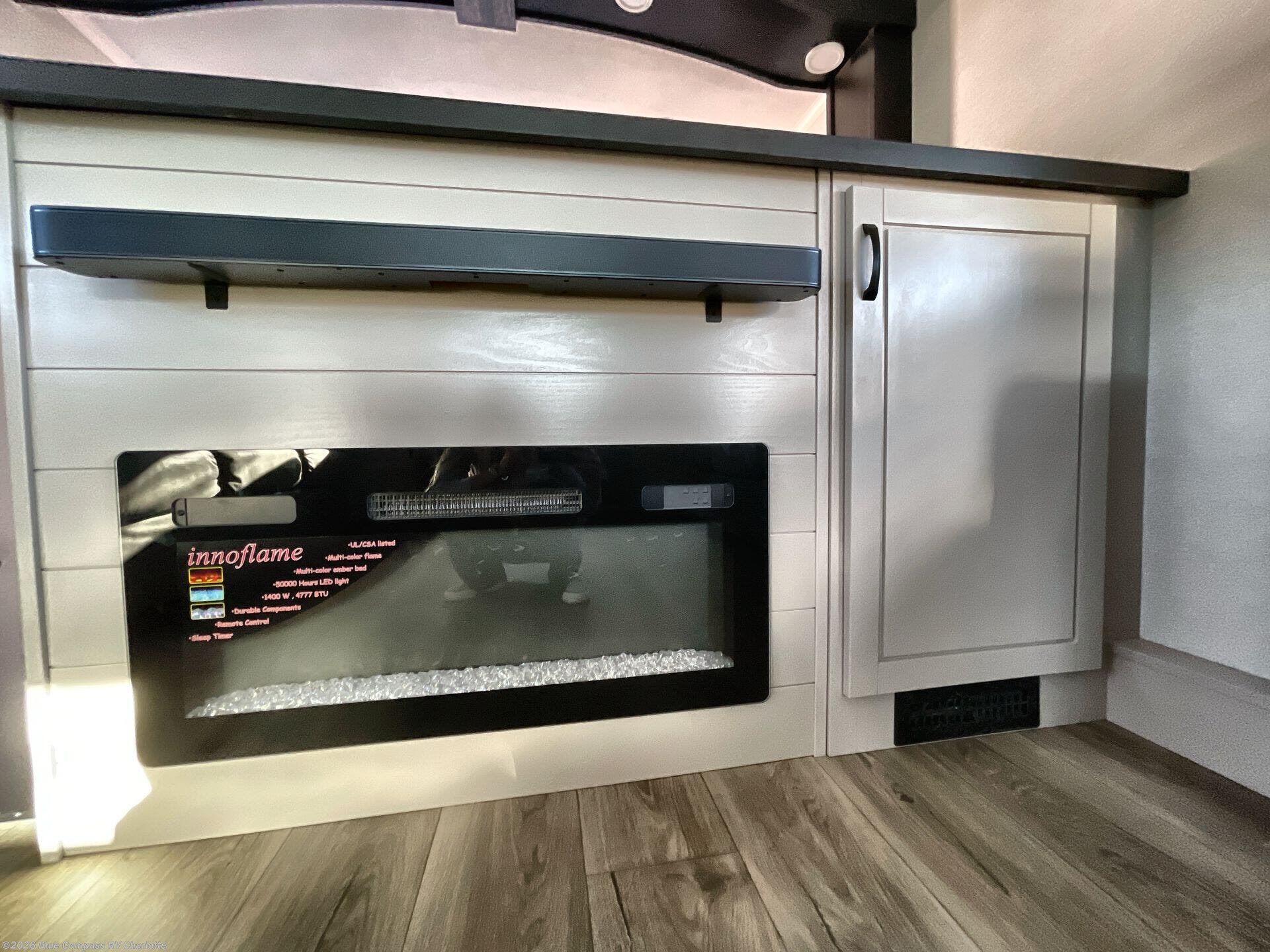 Entertainment can be found throughout this fifth wheel from the front living area with a 50" Smart LED HDTV with fully digital HDMI output and home entertainment system with subwoofer including a fireplace below that you can enjoy while relaxing on theater seats and two tri-fold sofas, a 32" TV in the middle kitchen and there is a bedroom 32" TV. You might even like to add the tailgate TV option along the exterior. Back inside the kitchen, the cook will love the center island, the pantry, the residential refrigerator, and the roll-top dinette. The half bath is a few steps away as an added convenience. The master bedroom includes a king bed slide, a bench, two wardrobes and a sliding door into the bathroom which offers two sinks, a space prepped for a washer/dryer option, and a walk-in shower. And don't forget about the exterior features such as the outside kitchen for more choices when making meals, the storage for your outdoor gear and chairs, and two awnings with integrated LED lighting.
