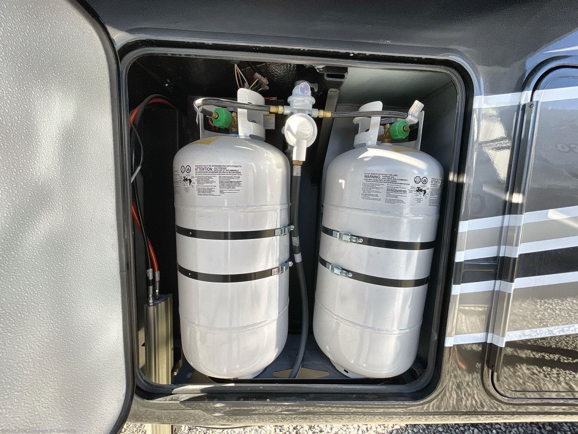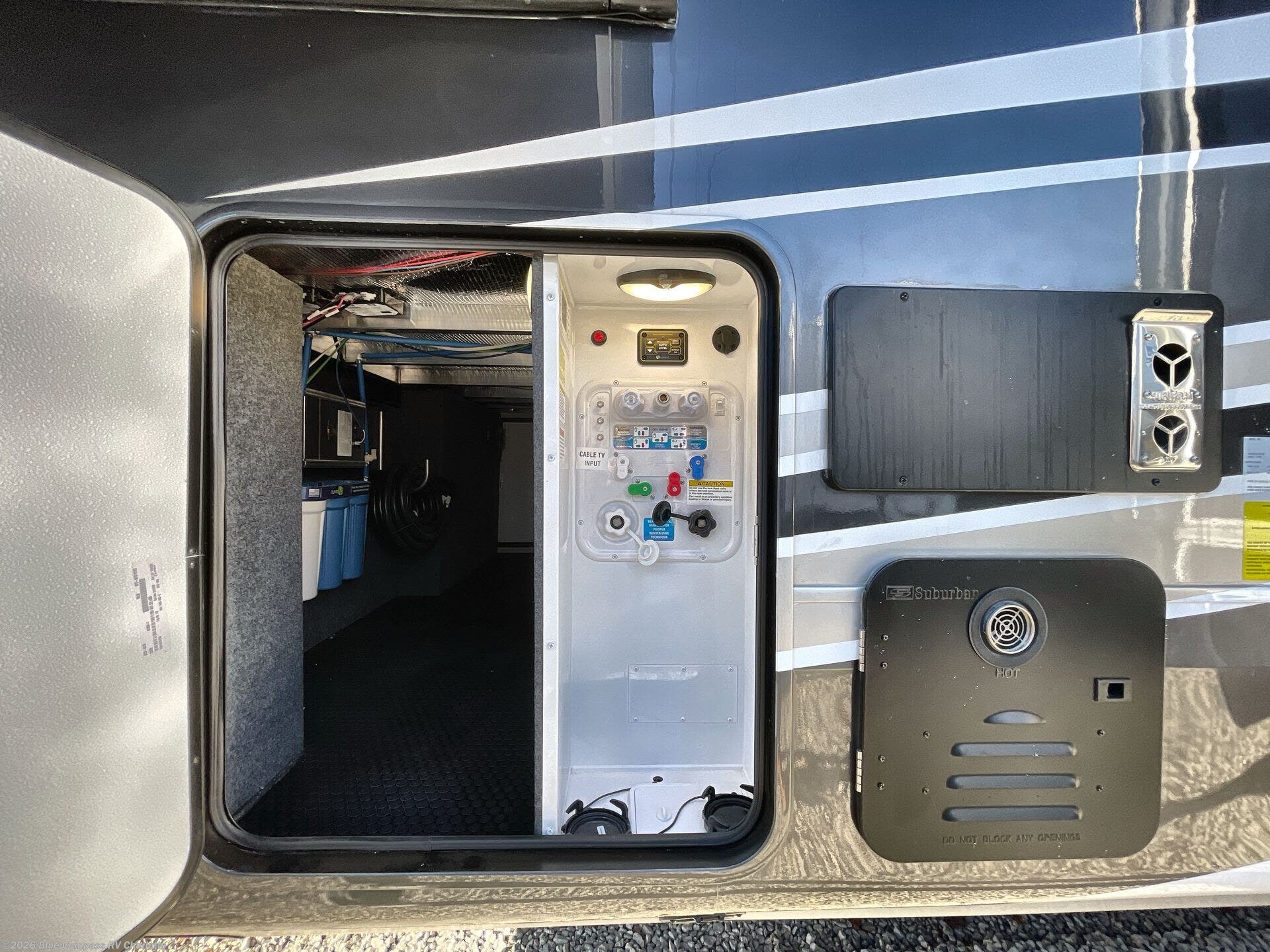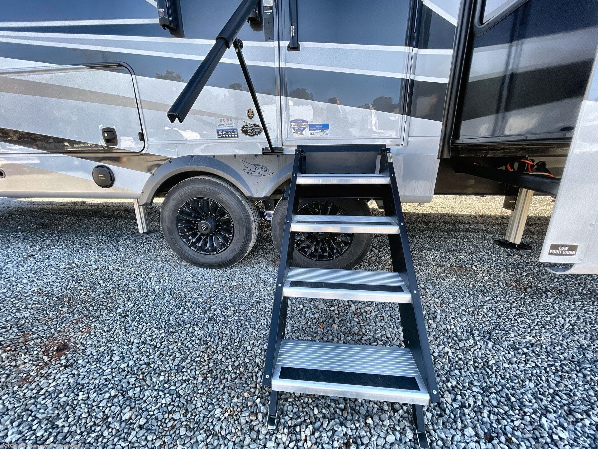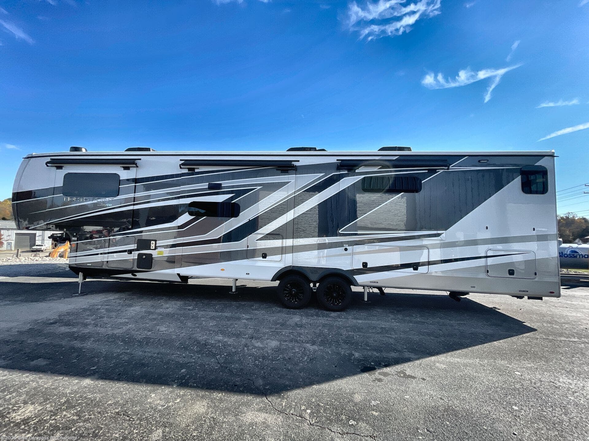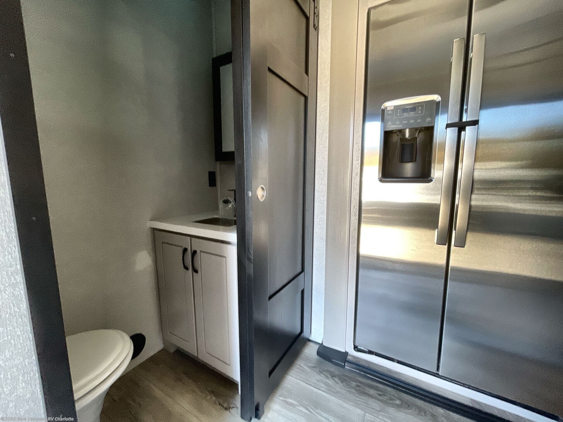 Entertainment can be found throughout this fifth wheel from the front living area with a 50" Smart LED HDTV with fully digital HDMI output and home entertainment system with subwoofer including a fireplace below that you can enjoy while relaxing on theater seats and two tri-fold sofas, a 32" TV in the middle kitchen and there is a bedroom 32" TV. You might even like to add the tailgate TV option along the exterior. Back inside the kitchen, the cook will love the center island, the pantry, the residential refrigerator, and the roll-top dinette. The half bath is a few steps away as an added convenience. The master bedroom includes a king bed slide, a bench, two wardrobes and a sliding door into the bathroom which offers two sinks, a space prepped for a washer/dryer option, and a walk-in shower. And don't forget about the exterior features such as the outside kitchen for more choices when making meals, the storage for your outdoor gear and chairs, and two awnings with integrated LED lighting.
