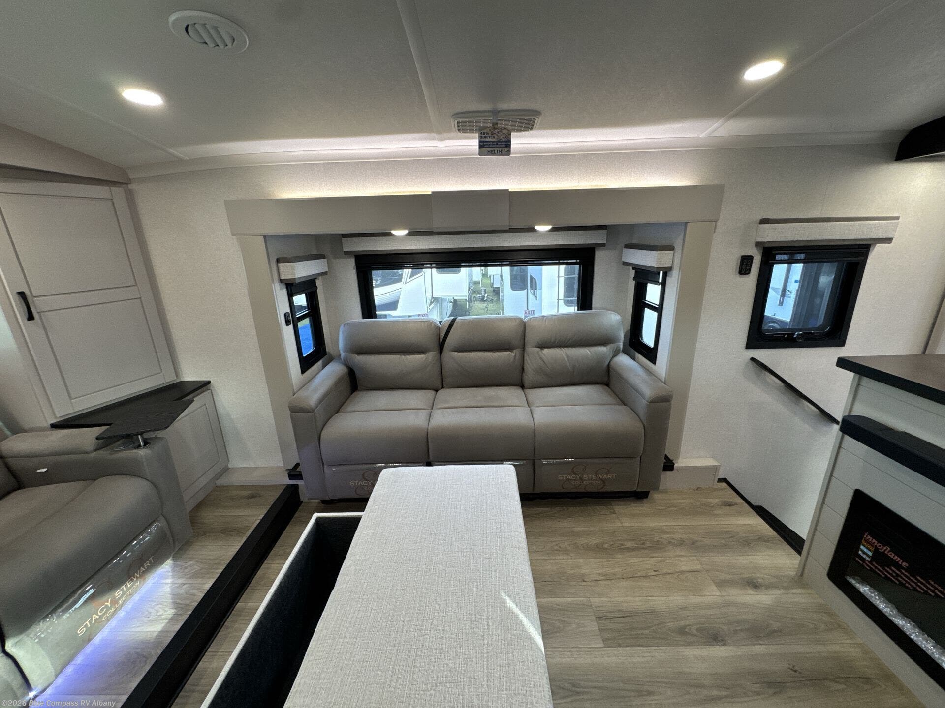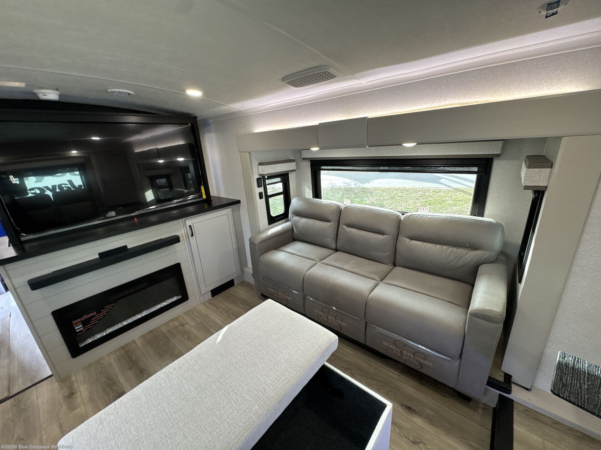 Entertainment can be found throughout this fifth wheel from the front living area with a 50" Smart LED HDTV with fully digital HDMI output and home entertainment system with subwoofer including a fireplace below that you can enjoy while relaxing on theater seats and two tri-fold sofas, a 32" TV in the middle kitchen and there is a bedroom 32" TV. You might even like to add the tailgate TV option along the exterior. Back inside the kitchen, the cook will love the center island, the pantry, the residential refrigerator, and the roll-top dinette. The half bath is a few steps away as an added convenience. The master bedroom includes a king bed slide, a bench, two wardrobes and a sliding door into the bathroom which offers two sinks, a space prepped for a washer/dryer option, and a walk-in shower. And don't forget about the exterior features such as the outside kitchen for more choices when making meals, the storage for your outdoor gear and chairs, and two awnings with integrated LED lighting.
