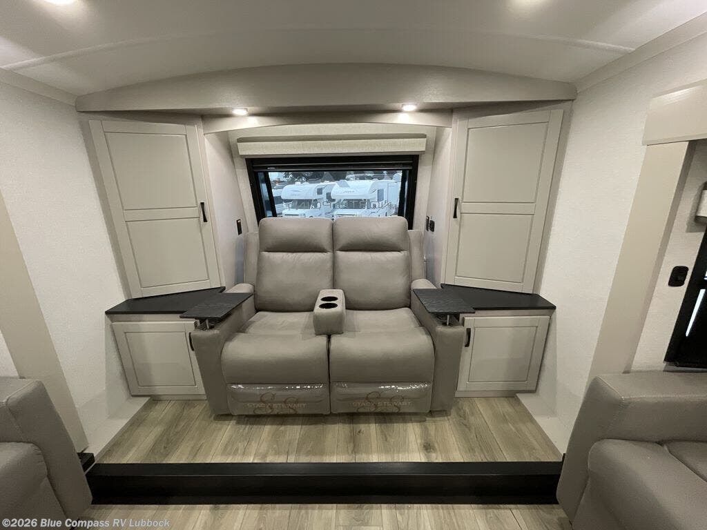 Entertainment can be found throughout this fifth wheel from the front living area with a 4K Smart LED HDTV with fully digital HDMI output and home entertainment system with subwoofer including a fireplace below that you can enjoy while relaxing on theater seats and two tri-fold sofas, a 40" TV in the middle kitchen and there is a bedroom 32" TV. Back inside the kitchen, the cook will love the center island, the pantry, the residential refrigerator, and the roll-top dinette. The half bath is a few steps away as an added convenience. The master bedroom includes a king bed slide, a bench, two wardrobes and a sliding door into the bathroom which offers two sinks, a space prepped for a washer/dryer option, and a walk-in shower. And don't forget about the exterior features such as the outside kitchen for more choices when making meals, the storage for your outdoor gear and chairs, and two awnings with integrated LED lighting.