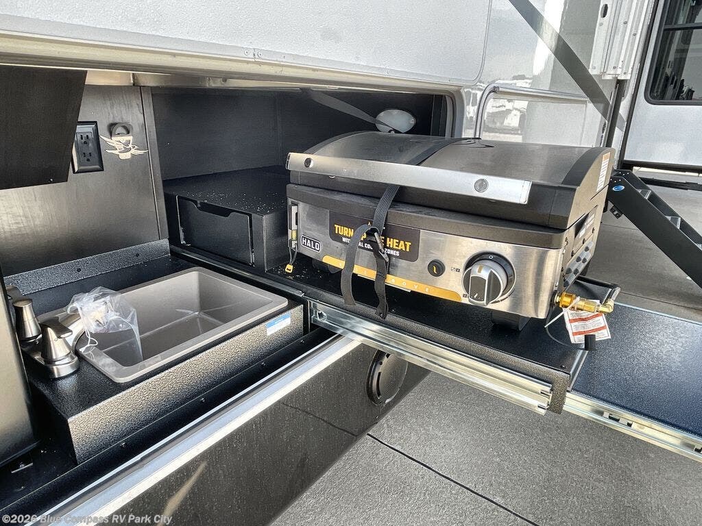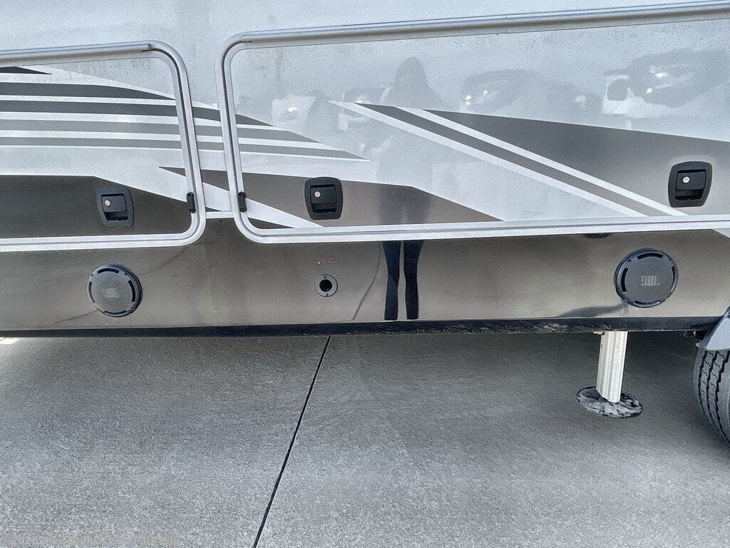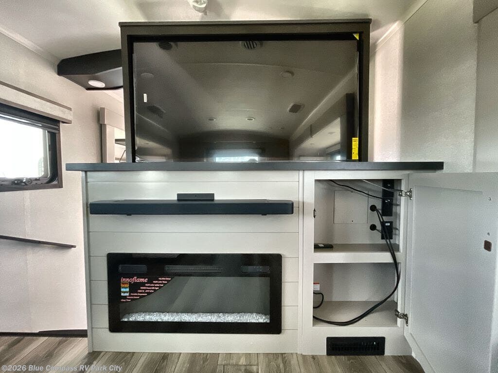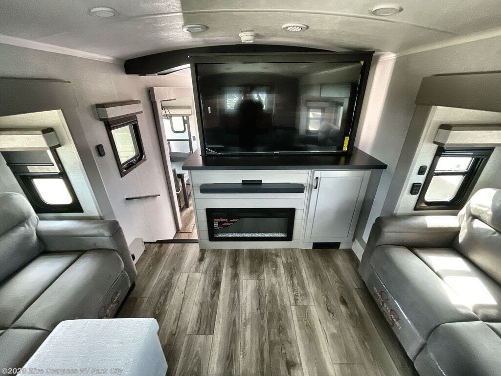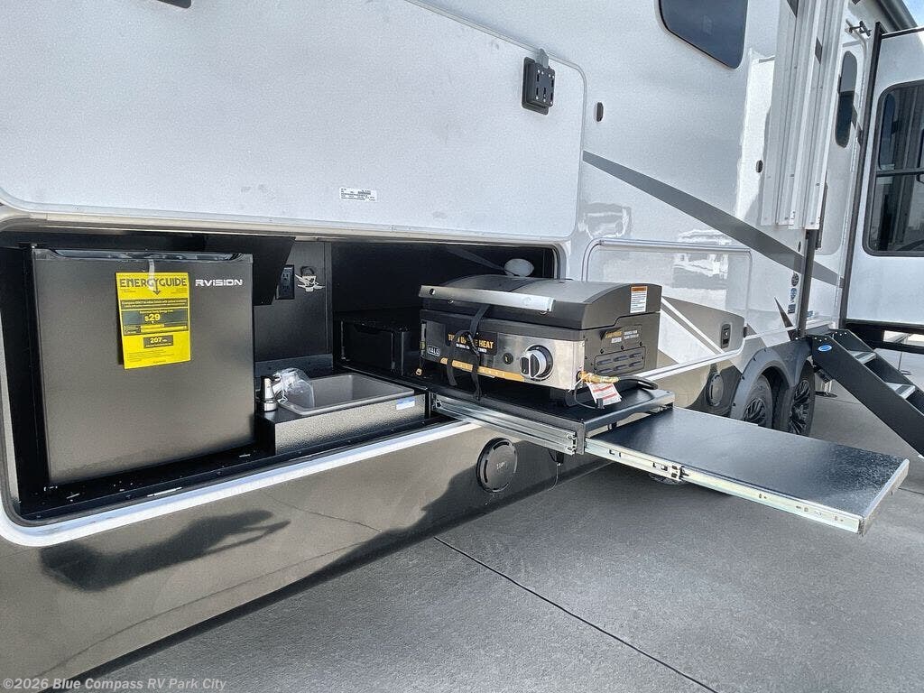 Entertainment can be found throughout this fifth wheel from the front living area with a 4K Smart LED HDTV with fully digital HDMI output and home entertainment system with subwoofer including a fireplace below that you can enjoy while relaxing on theater seats and two tri-fold sofas, a 40" TV in the middle kitchen and there is a bedroom 32" TV. Back inside the kitchen, the cook will love the center island, the pantry, the residential refrigerator, and the roll-top dinette. The half bath is a few steps away as an added convenience. The master bedroom includes a king bed slide, a bench, two wardrobes and a sliding door into the bathroom which offers two sinks, a space prepped for a washer/dryer option, and a walk-in shower. And don't forget about the exterior features such as the outside kitchen for more choices when making meals, the storage for your outdoor gear and chairs, and two awnings with integrated LED lighting.