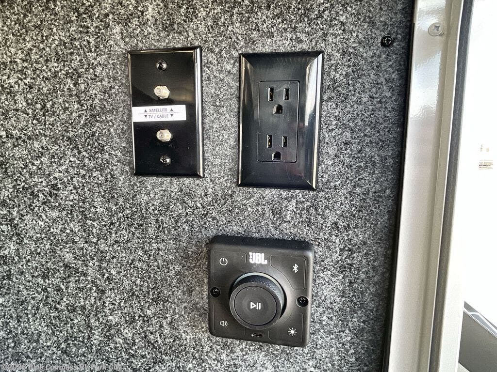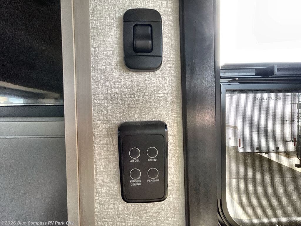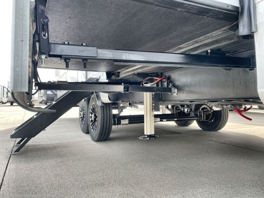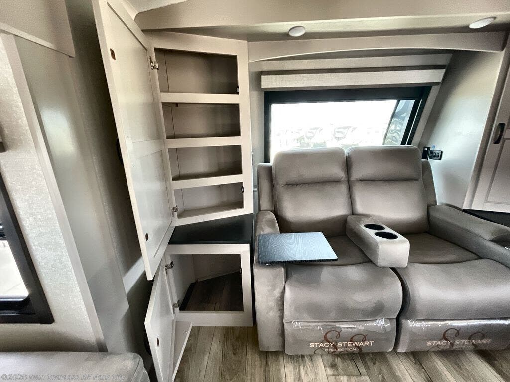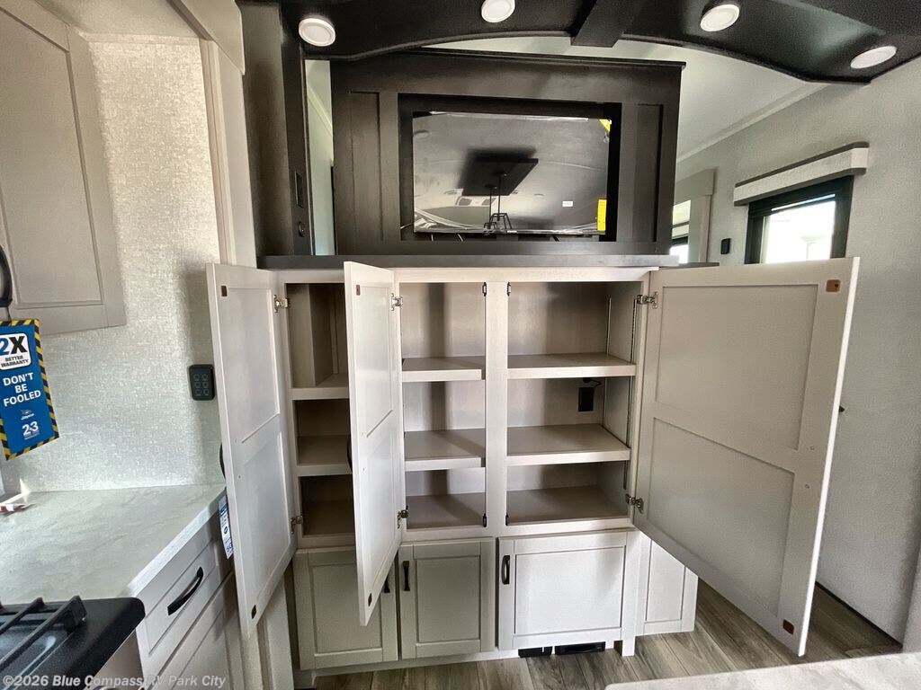 Entertainment can be found throughout this fifth wheel from the front living area with a 4K Smart LED HDTV with fully digital HDMI output and home entertainment system with subwoofer including a fireplace below that you can enjoy while relaxing on theater seats and two tri-fold sofas, a 40" TV in the middle kitchen and there is a bedroom 32" TV. Back inside the kitchen, the cook will love the center island, the pantry, the residential refrigerator, and the roll-top dinette. The half bath is a few steps away as an added convenience. The master bedroom includes a king bed slide, a bench, two wardrobes and a sliding door into the bathroom which offers two sinks, a space prepped for a washer/dryer option, and a walk-in shower. And don't forget about the exterior features such as the outside kitchen for more choices when making meals, the storage for your outdoor gear and chairs, and two awnings with integrated LED lighting.