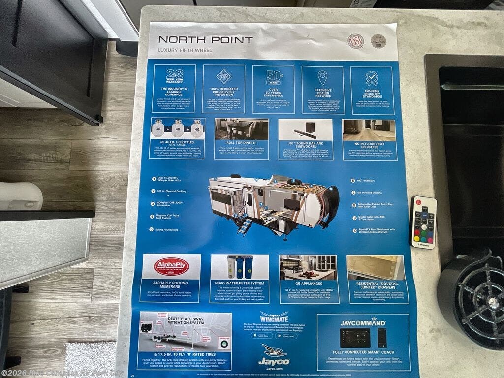 With any North Point fifth wheel by Jayco you begin with a strong foundation with a custom frame, designed and sized specifically to best support each unit. Constructed with Stronghold VBL™ aluminum framed, vacuum bond laminated walls and the Magnum Truss™ XL6™ roof system with an Alpha roof membrane system, which is the strongest tested roof in the industry. The 5-Star Handling package is included with H-rated tires with TPMS, a MORryde rubber pin box, Dexter axles with Nev-R-Adjust brakes, MORryde CRE-3000 rubberized suspension and wet bolt fasteners and bronze bushings. The interior has handcrafted hardwood glazed doors and drawers, vinyl flooring throughout, an integrated under-mount sink in the main bathroom, plus so much more you just have to see one to believe it all!
