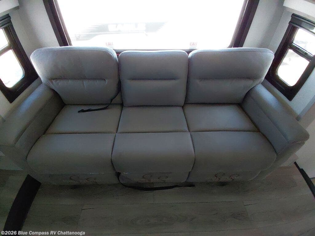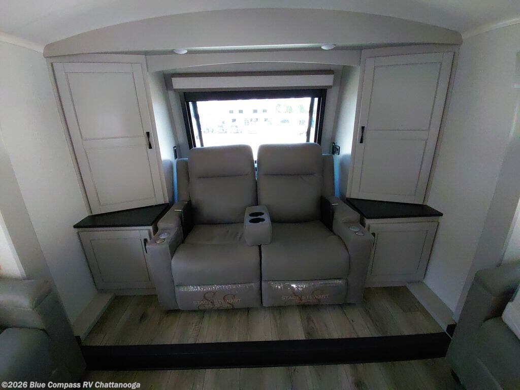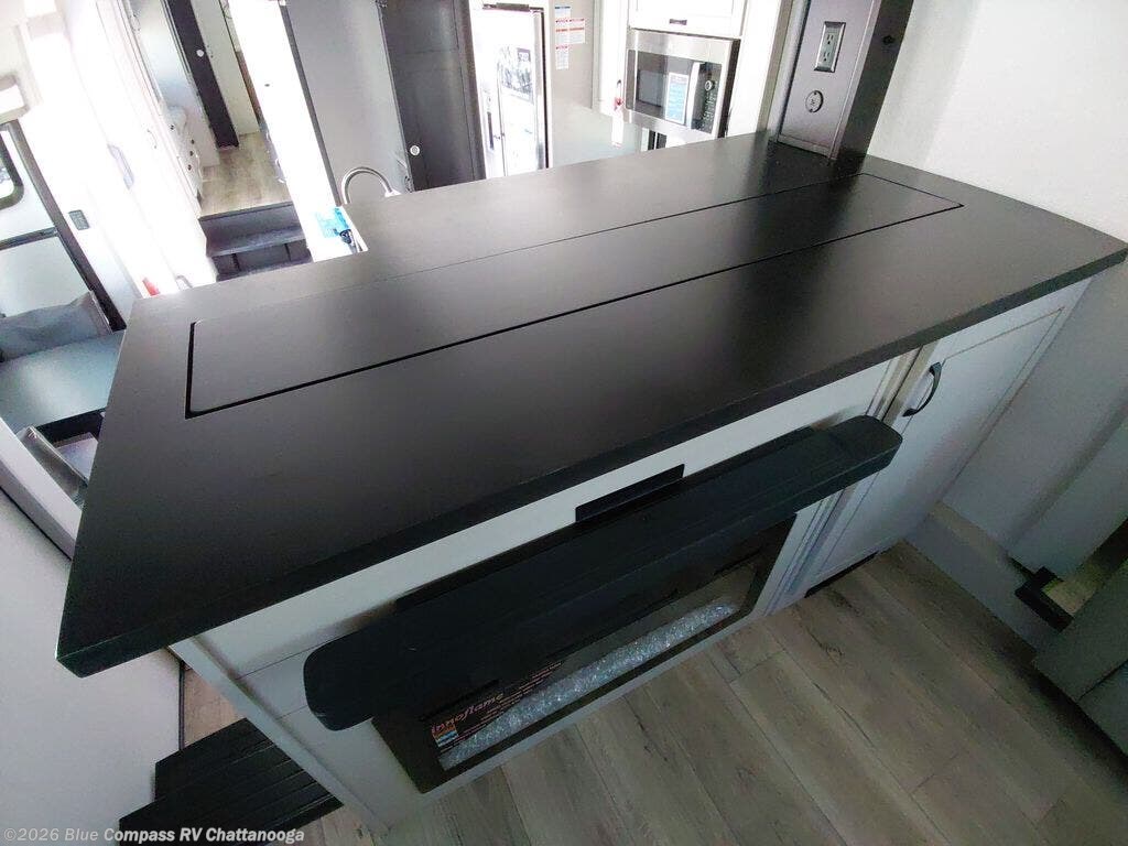 Entertainment can be found throughout this fifth wheel from the front living area with a 4K Smart LED HDTV with fully digital HDMI output and home entertainment system with subwoofer including a fireplace below that you can enjoy while relaxing on theater seats and two tri-fold sofas, a 40" TV in the middle kitchen and there is a bedroom 32" TV. Back inside the kitchen, the cook will love the center island, the pantry, the residential refrigerator, and the roll-top dinette. The half bath is a few steps away as an added convenience. The master bedroom includes a king bed slide, a bench, two wardrobes and a sliding door into the bathroom which offers two sinks, a space prepped for a washer/dryer option, and a walk-in shower. And don't forget about the exterior features such as the outside kitchen for more choices when making meals, the storage for your outdoor gear and chairs, and two awnings with integrated LED lighting.