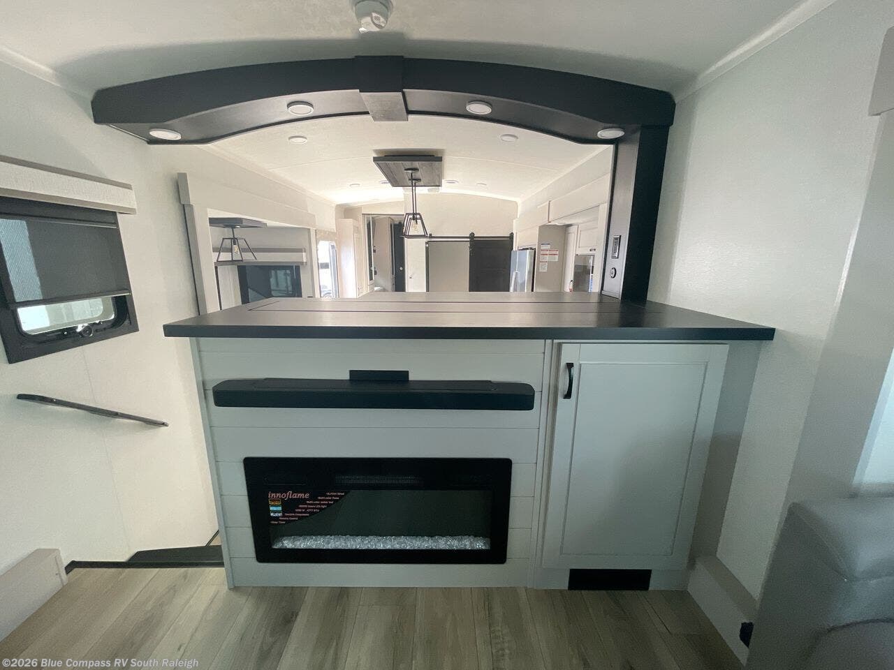 Entertainment can be found throughout this fifth wheel from the front living area with a 4K Smart LED HDTV with fully digital HDMI output and home entertainment system with subwoofer including a fireplace below that you can enjoy while relaxing on theater seats and two tri-fold sofas, a 40" TV in the middle kitchen and there is a bedroom 32" TV. Back inside the kitchen, the cook will love the center island, the pantry, the residential refrigerator, and the roll-top dinette. The half bath is a few steps away as an added convenience. The master bedroom includes a king bed slide, a bench, two wardrobes and a sliding door into the bathroom which offers two sinks, a space prepped for a washer/dryer option, and a walk-in shower. And don't forget about the exterior features such as the outside kitchen for more choices when making meals, the storage for your outdoor gear and chairs, and two awnings with integrated LED lighting.