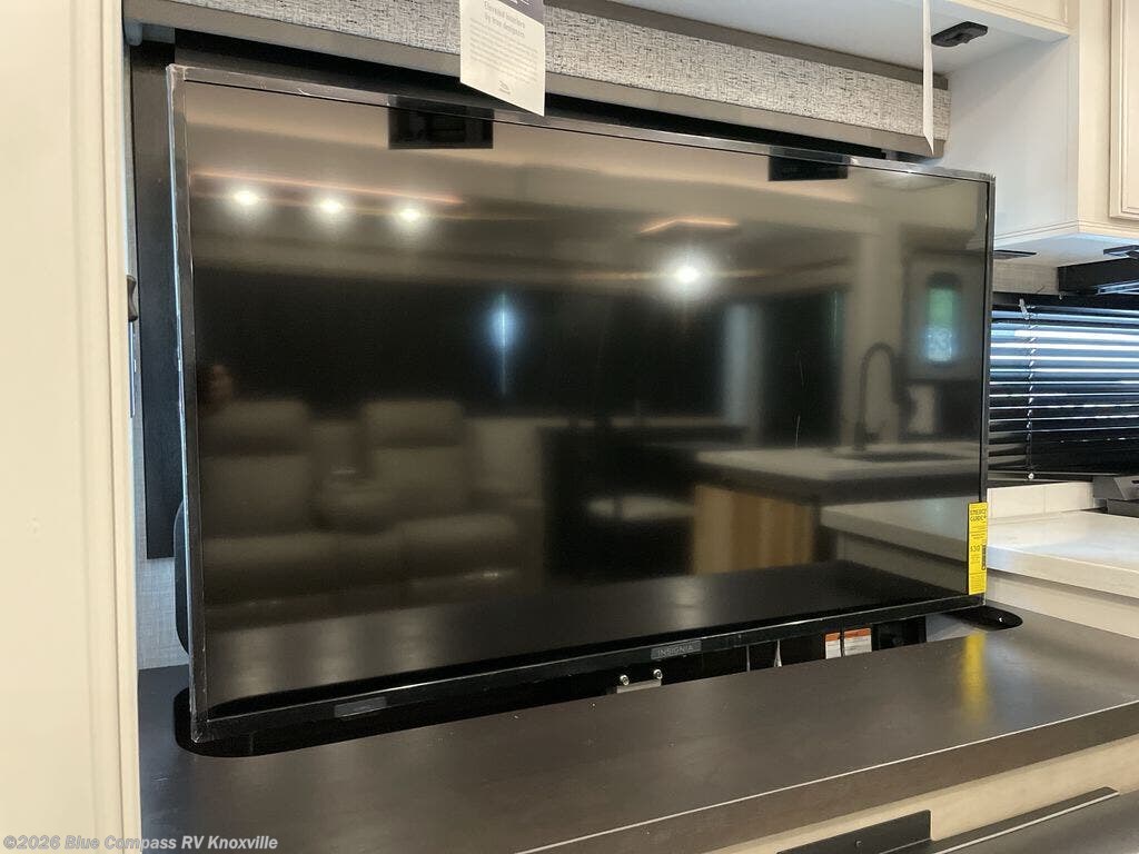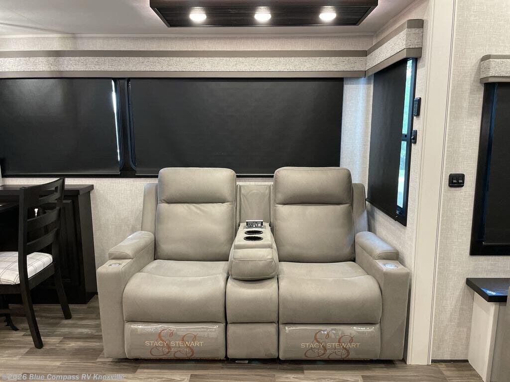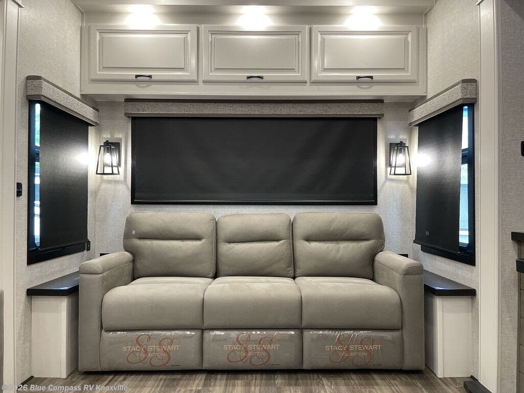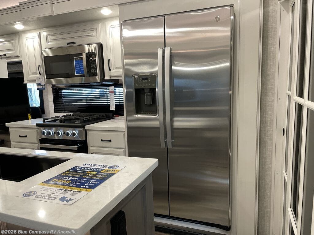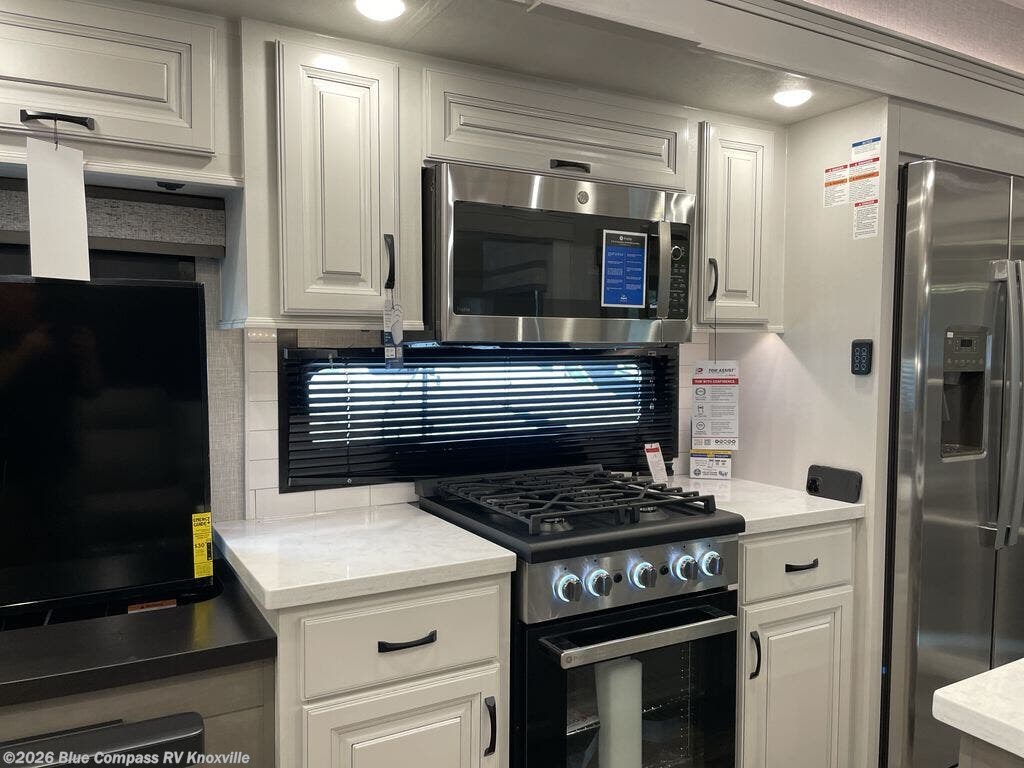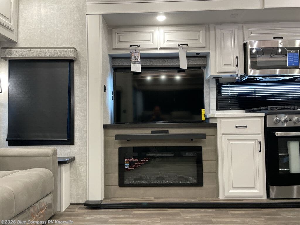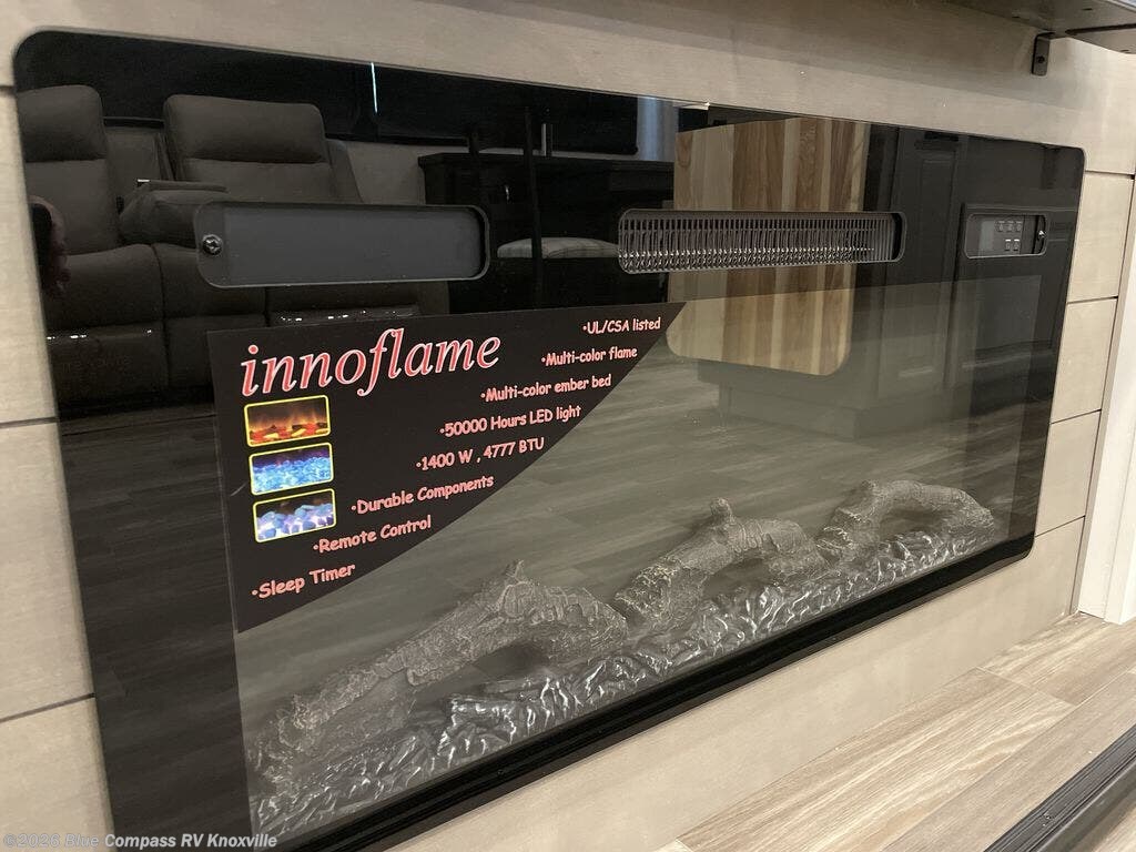 Finding the perfect RV park or campground is all you have to do, then you can load up and hit the road whether you are a full-timer or weekend warrior. The two electric awnings and the three slides are easy to set up and close, and you will have lots of interior and exterior storage to bring everything you might need. The kitchen offers a residential refrigerator and 24" stove, a 30" residential microwave, a kitchen island, a pantry and a pull-out countertop. You can relax on the tri-fold sofa and the theater seats while watching your shows on the 4K Smart LED HDTV with fully digital HDMI output and home entertainment system with subwoofer plus there is a fireplace below. Dine at the roll-top dinette table, or you can work from here as well. The front bedroom offers a king bed slide and a flip-top dresser with 32" TV, plus access to a spacious private front bath including a walk-in closet, washer/dryer prep, and more.