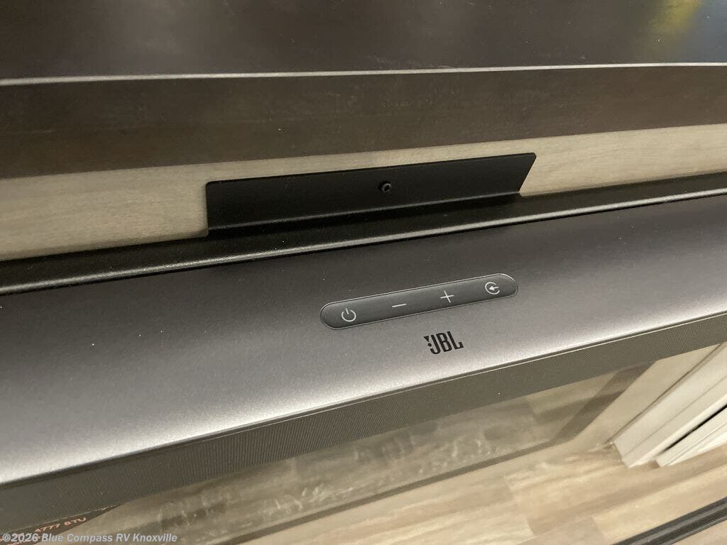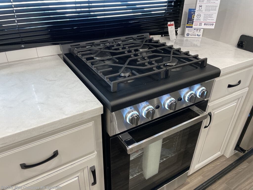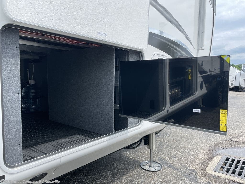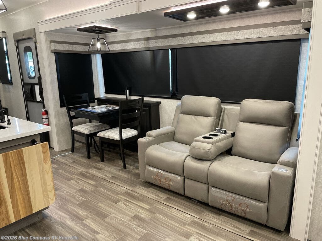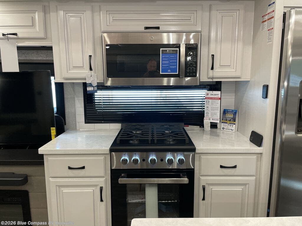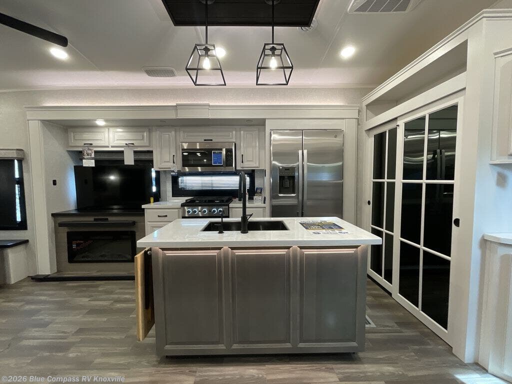Finding the perfect RV park or campground is all you have to do, then you can load up and hit the road whether you are a full-timer or weekend warrior. The two electric awnings and the three slides are easy to set up and close, and you will have lots of interior and exterior storage to bring everything you might need. The kitchen offers a residential refrigerator and 24" stove, a 30" residential microwave, a kitchen island, a pantry and a pull-out countertop. You can relax on the tri-fold sofa and the theater seats while watching your shows on the 4K Smart LED HDTV with fully digital HDMI output and home entertainment system with subwoofer plus there is a fireplace below. Dine at the roll-top dinette table, or you can work from here as well. The front bedroom offers a king bed slide and a flip-top dresser with 32" TV, plus access to a spacious private front bath including a walk-in closet, washer/dryer prep, and more.