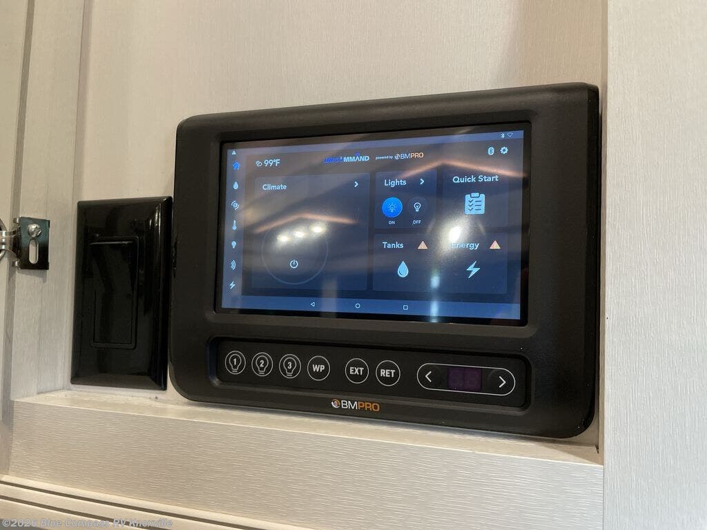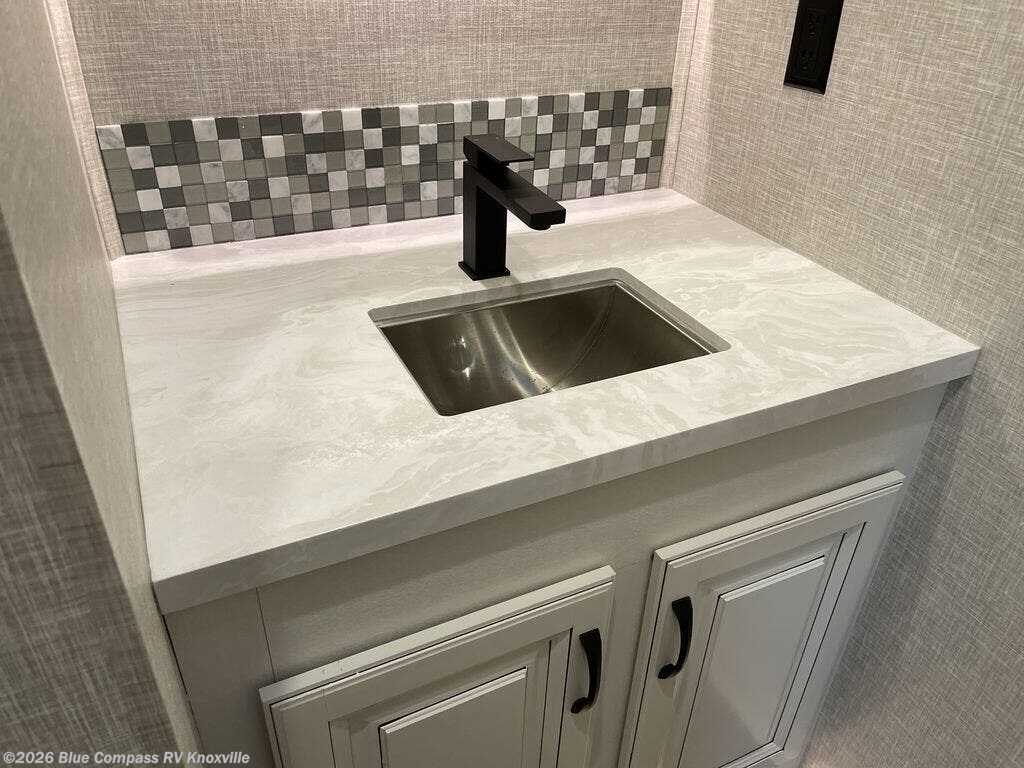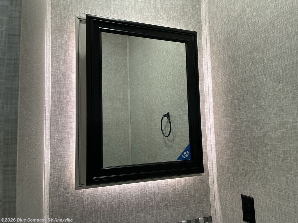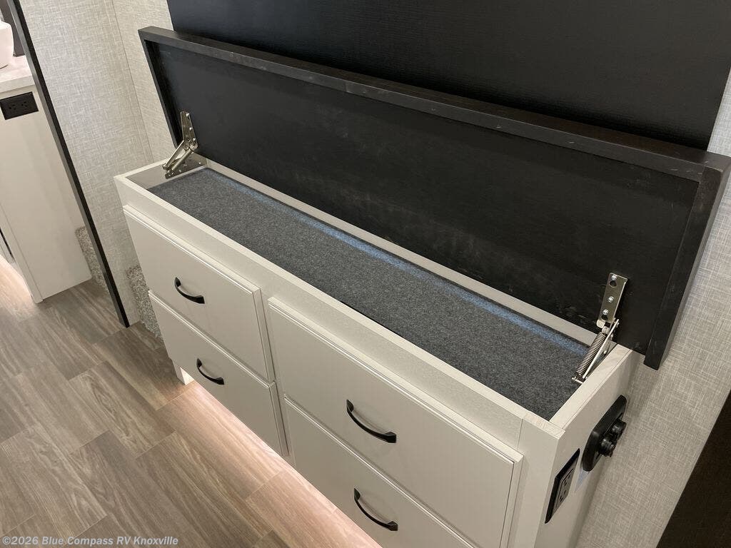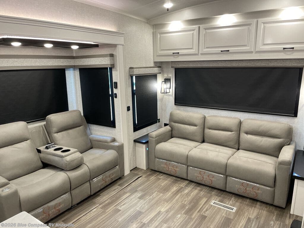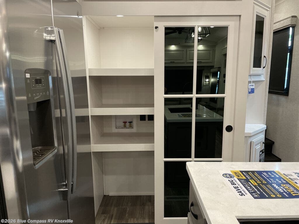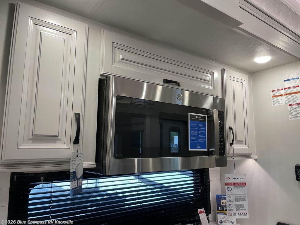 Finding the perfect RV park or campground is all you have to do, then you can load up and hit the road whether you are a full-timer or weekend warrior. The two electric awnings and the three slides are easy to set up and close, and you will have lots of interior and exterior storage to bring everything you might need. The kitchen offers a residential refrigerator and 24" stove, a 30" residential microwave, a kitchen island, a pantry and a pull-out countertop. You can relax on the tri-fold sofa and the theater seats while watching your shows on the 4K Smart LED HDTV with fully digital HDMI output and home entertainment system with subwoofer plus there is a fireplace below. Dine at the roll-top dinette table, or you can work from here as well. The front bedroom offers a king bed slide and a flip-top dresser with 32" TV, plus access to a spacious private front bath including a walk-in closet, washer/dryer prep, and more.