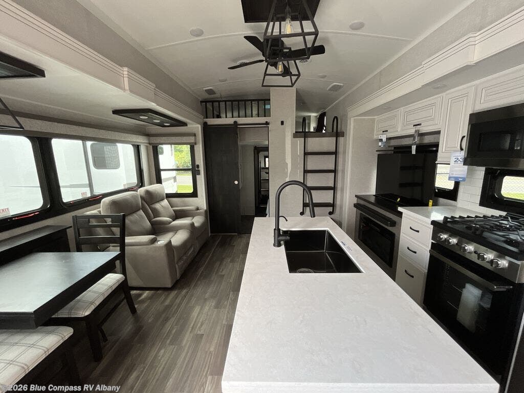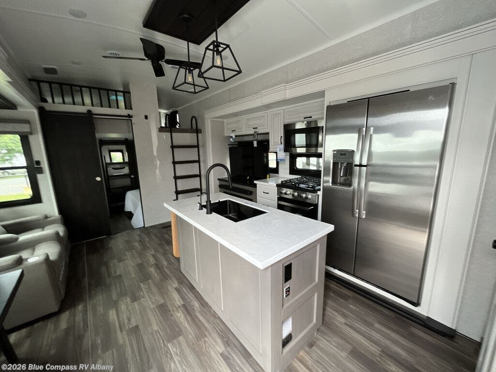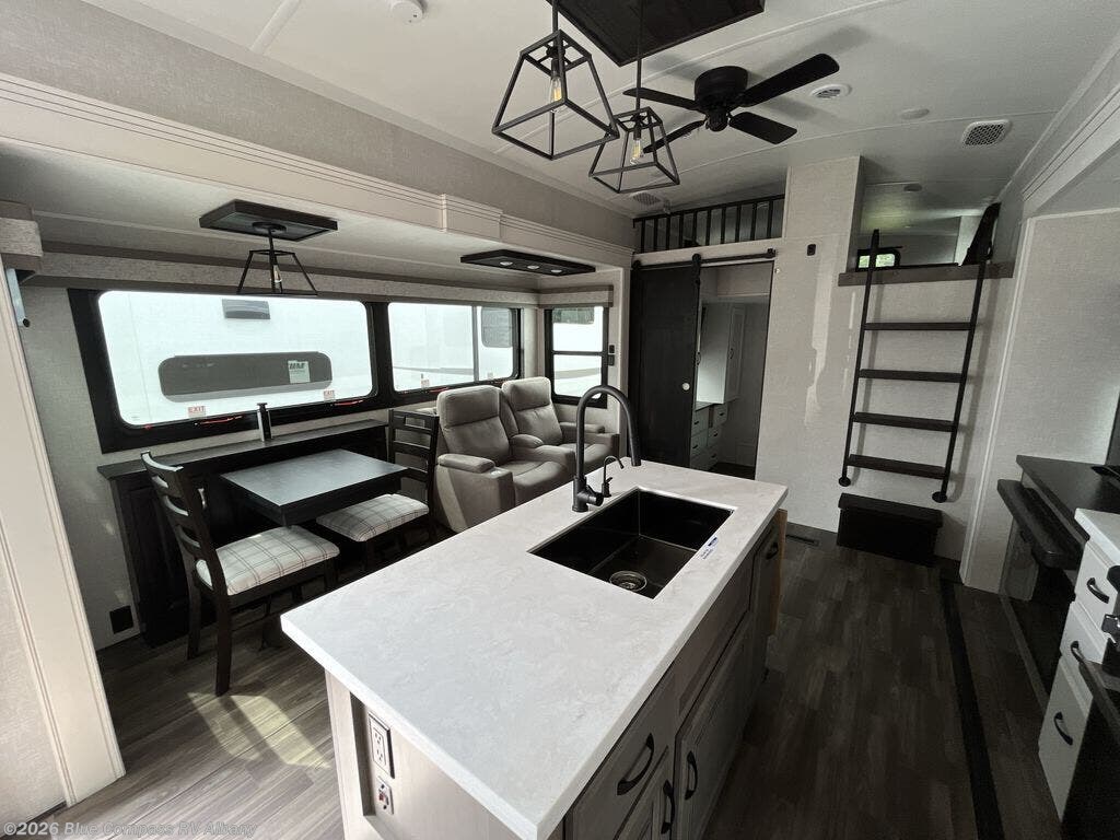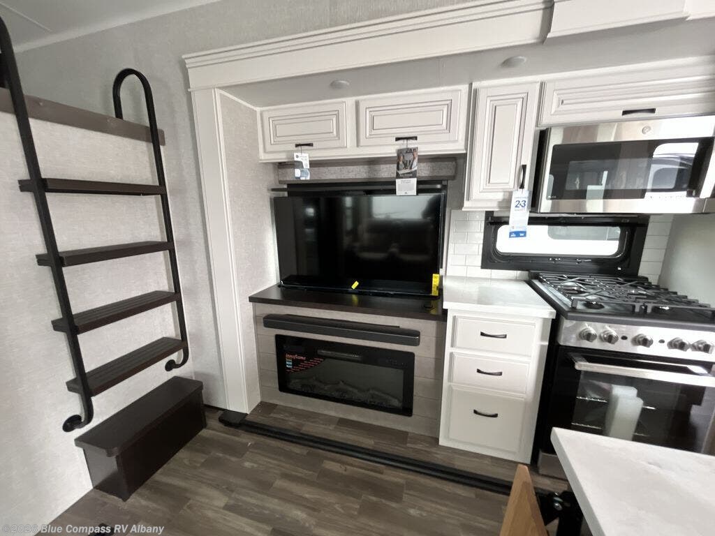 With two bedrooms plus a loft, there aren't many fifth wheels that can sleep as many people in as much comfort as this Jayco North Point! Up front is a private bedroom suite with a king bed and next to the bedroom is a full bathroom, while towards the rear you'll find a second bedroom with a queen bed. This bedroom also has an adjacent bathroom, conveniently all the way to the rear so it has its own entry door to the outside. There's also a loft with three bed mats which will be perfect for kids. In the center of it all you'll find a great living space, with a fully equipped kitchen and plenty of room for everyone to hang out. Relax in the theater seats across from the entertainment center, which features a 4K Smart LED HDTV and a fireplace for cozy evenings.