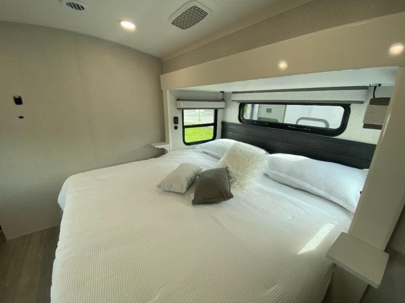 Trips to the lake are made comfortable in this triple slide out fifth wheel. Once you arrive at the campground, set up the two power awnings with LED lights, and there is an exterior TV for the big game. Head inside to relax on the theater seats directly across from the TV and fireplace, or play a game at the roll-top dinette. The chef of your group will love this kitchen with its residential refrigerator, kitchen island, and pantry, plus additional storage for canned goods or paper products. The full bath will allow you to stay clean throughout your trip, and you'll find a residential style backsplash in the bath, plus a walk-in shower. Nothing says luxury like your own king bed slide out in the front bedroom, a large front closet with hamper and drawers for wrinkle-free clothes, and a flip-up dresser featuring a 32" TV!