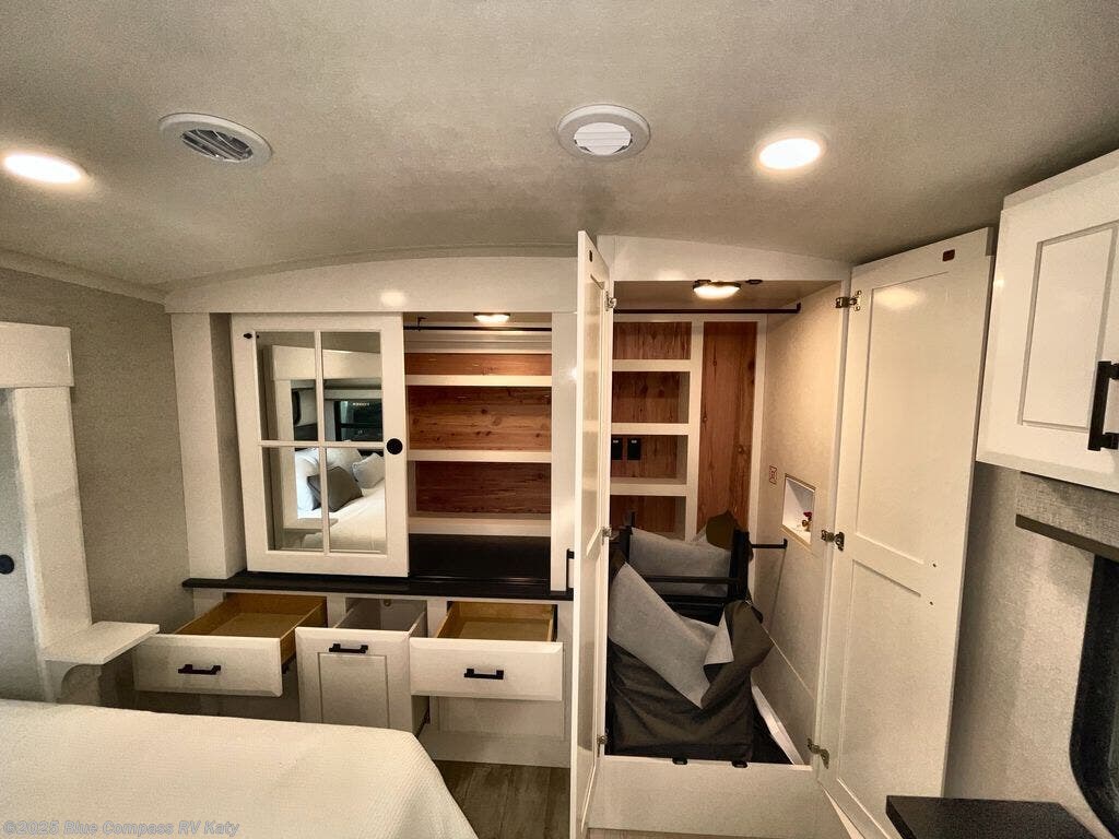 Trips to the lake are made comfortable in this triple slide out fifth wheel. Once you arrive at the campground, set up the two power awnings with LED lights, and there is an exterior TV for the big game. Head inside to relax on the theater seats directly across from the TV and fireplace, or play a game at the roll-top dinette. The chef of your group will love this kitchen with its residential refrigerator, kitchen island, and pantry, plus additional storage for canned goods or paper products. The full bath will allow you to stay clean throughout your trip, and you'll find a residential style backsplash in the bath, plus a walk-in shower. Nothing says luxury like your own king bed slide out in the front bedroom, a large front closet with hamper and drawers for wrinkle-free clothes, and a flip-up dresser featuring a 32" TV!