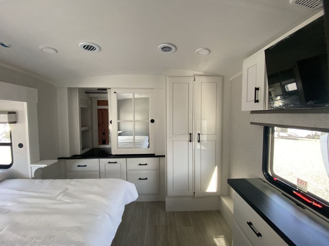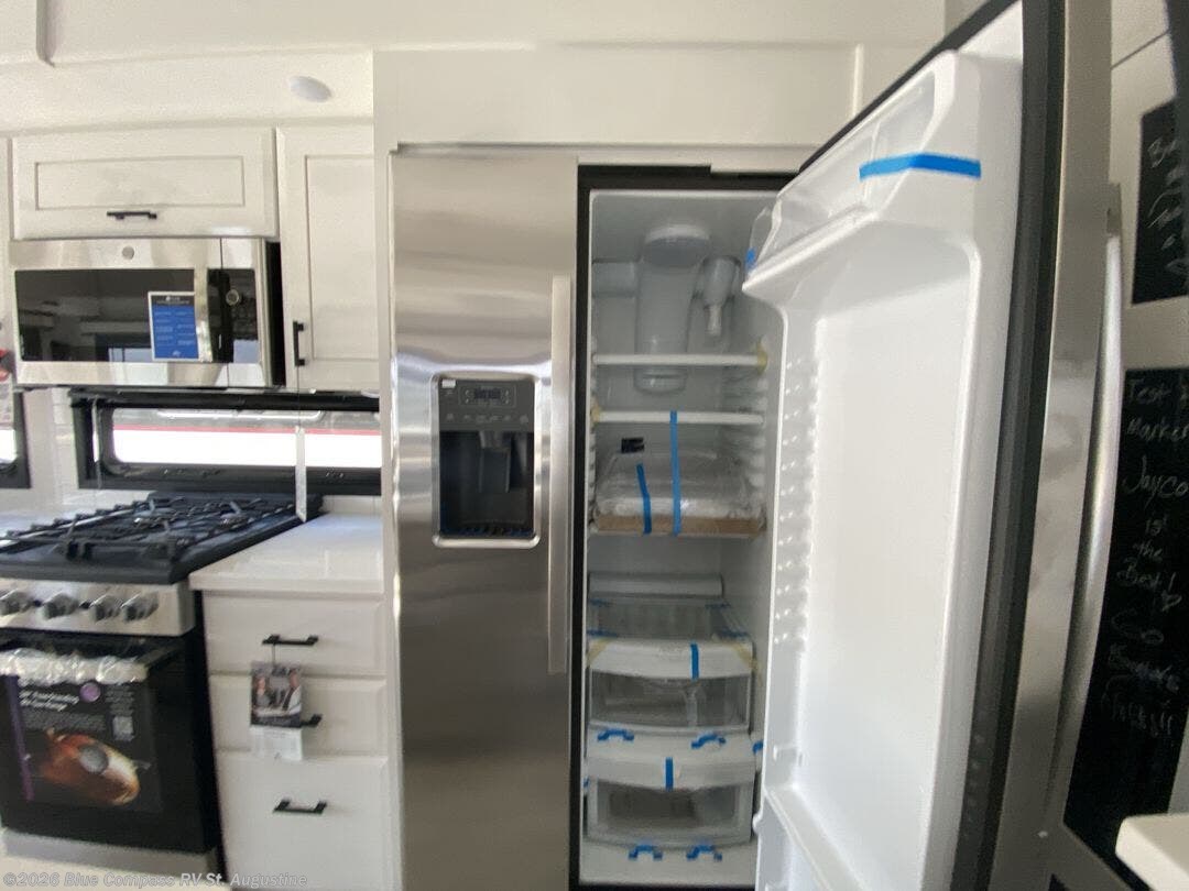Trips to the lake are made comfortable in this triple slide out fifth wheel. Once you arrive at the campground, set up the two power awnings with LED lights, and there is an exterior TV for the big game. Head inside to relax on the theater seats directly across from the TV and fireplace or play a game at the roll-top dinette. The chef of your group will love this kitchen with its residential refrigerator, kitchen island, and pantry, plus additional storage for canned goods or paper products. The full bath will allow you to stay clean throughout your trip, you'll find a walk-in shower with teak seat, linen shelves above the bath and a medicine cabinet. Nothing says luxury like your own king bed slide out in the front bedroom, a large front closet with hamper and drawers for wrinkle-free clothes, and a flip-up dresser featuring a 32" TV!