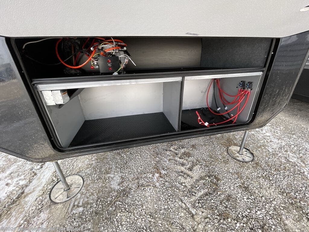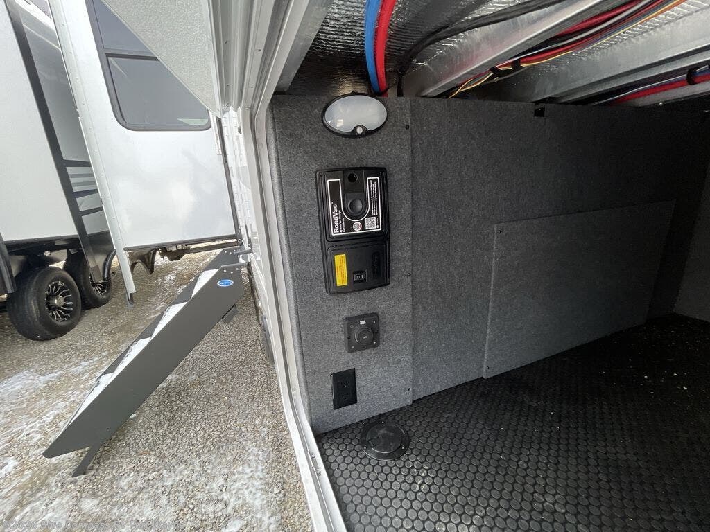 Trips to the lake are made comfortable in this triple slide out fifth wheel. Once you arrive at the campground, set up the two power awnings with LED lights, and there is an exterior TV for the big game. Head inside to relax on the theater seats directly across from the TV and fireplace or play a game at the roll-top dinette. The chef of your group will love this kitchen with its residential refrigerator, kitchen island, and pantry, plus additional storage for canned goods or paper products. The full bath will allow you to stay clean throughout your trip, you'll find a walk-in shower with teak seat, linen shelves above the bath and a medicine cabinet. Nothing says luxury like your own king bed slide out in the front bedroom, a large front closet with hamper and drawers for wrinkle-free clothes, and a flip-up dresser featuring a 32" TV!