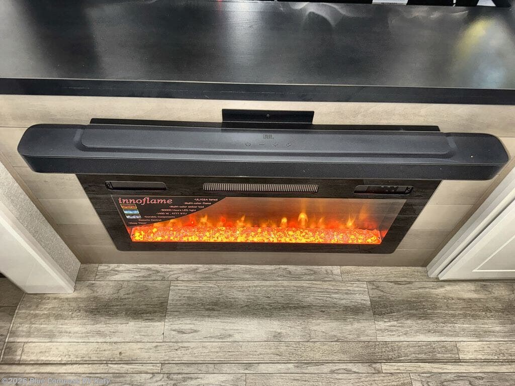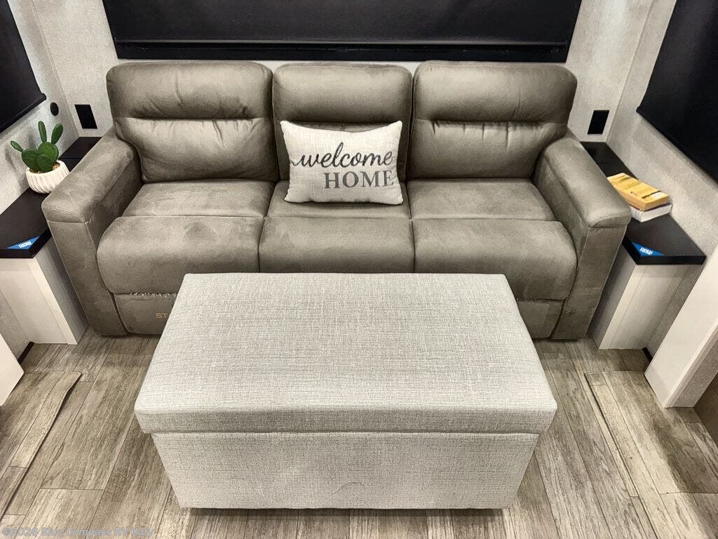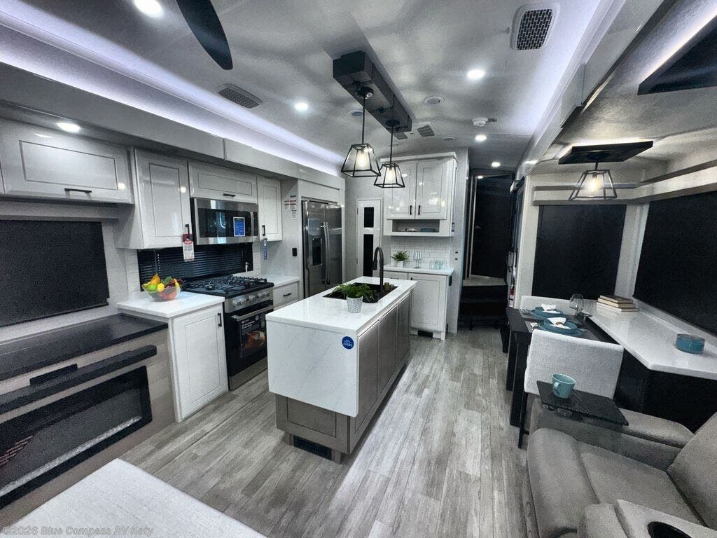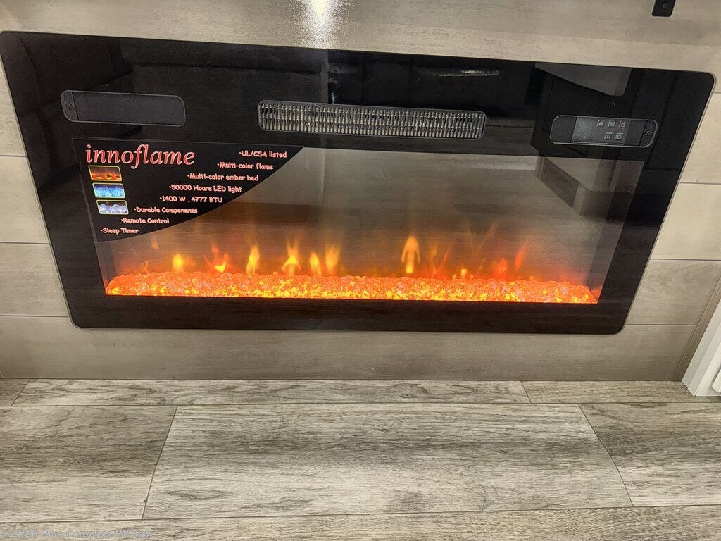 Trips to the lake are made comfortable in this triple slide out fifth wheel. Once you arrive at the campground, set up the two power awnings with LED lights, and there is an exterior TV for the big game. Head inside to relax on the theater seats directly across from the TV and fireplace or play a game at the roll-top dinette. The chef of your group will love this kitchen with its residential refrigerator, kitchen island, and pantry, plus additional storage for canned goods or paper products. The full bath will allow you to stay clean throughout your trip, you'll find a walk-in shower with teak seat, linen shelves above the bath and a medicine cabinet. Nothing says luxury like your own king bed slide out in the front bedroom, a large front closet with hamper and drawers for wrinkle-free clothes, and a flip-up dresser featuring a 32" TV!
