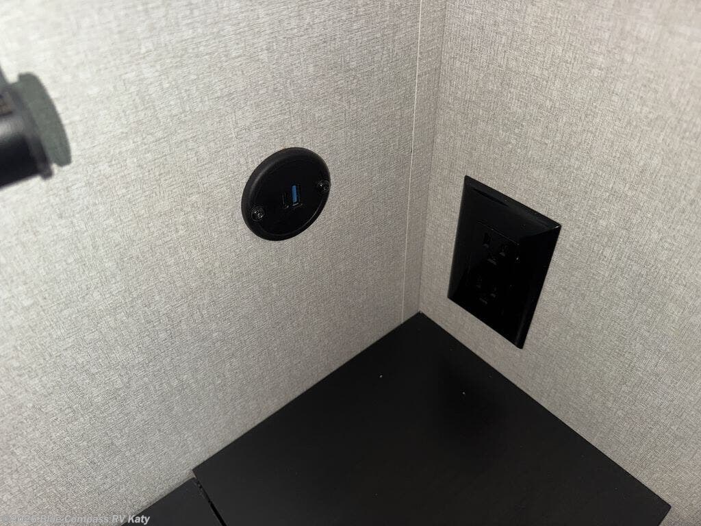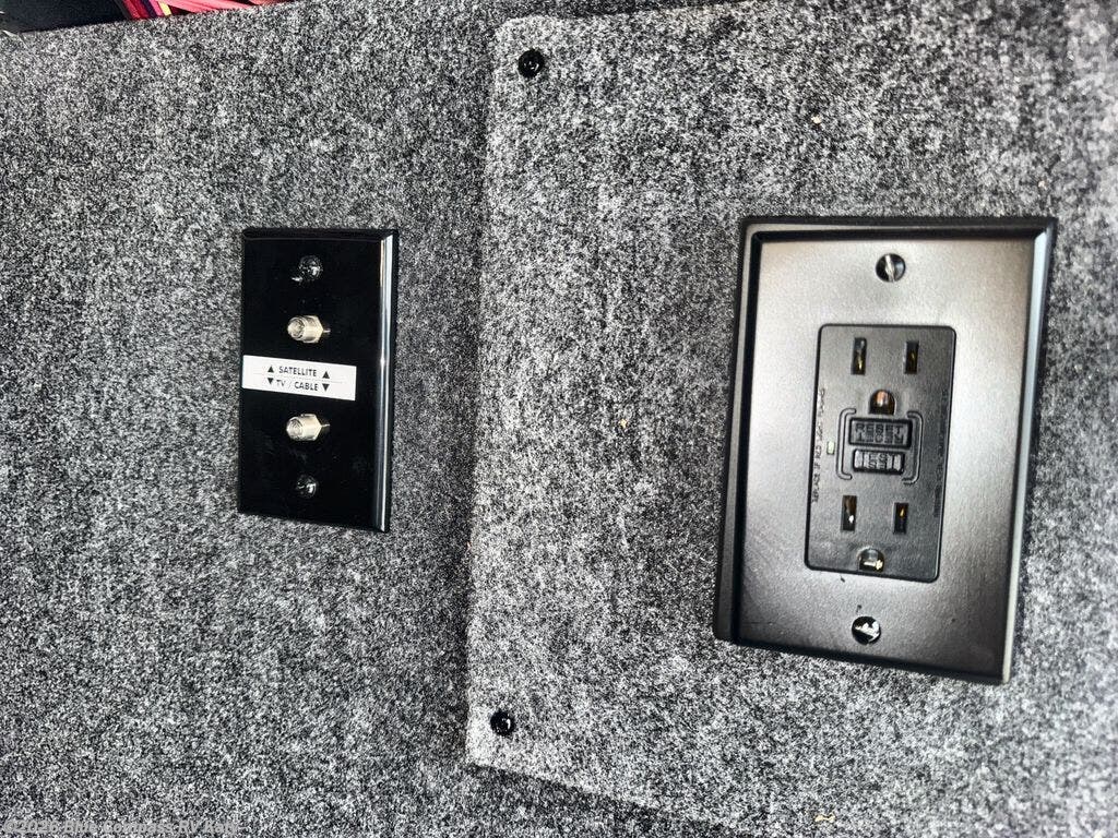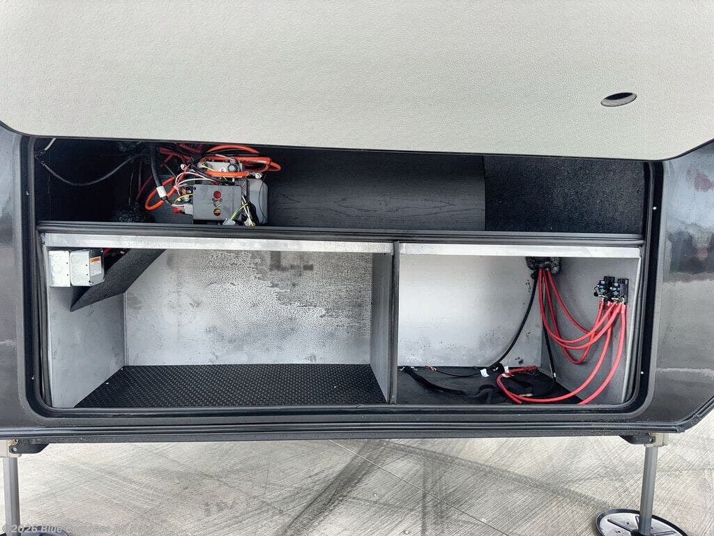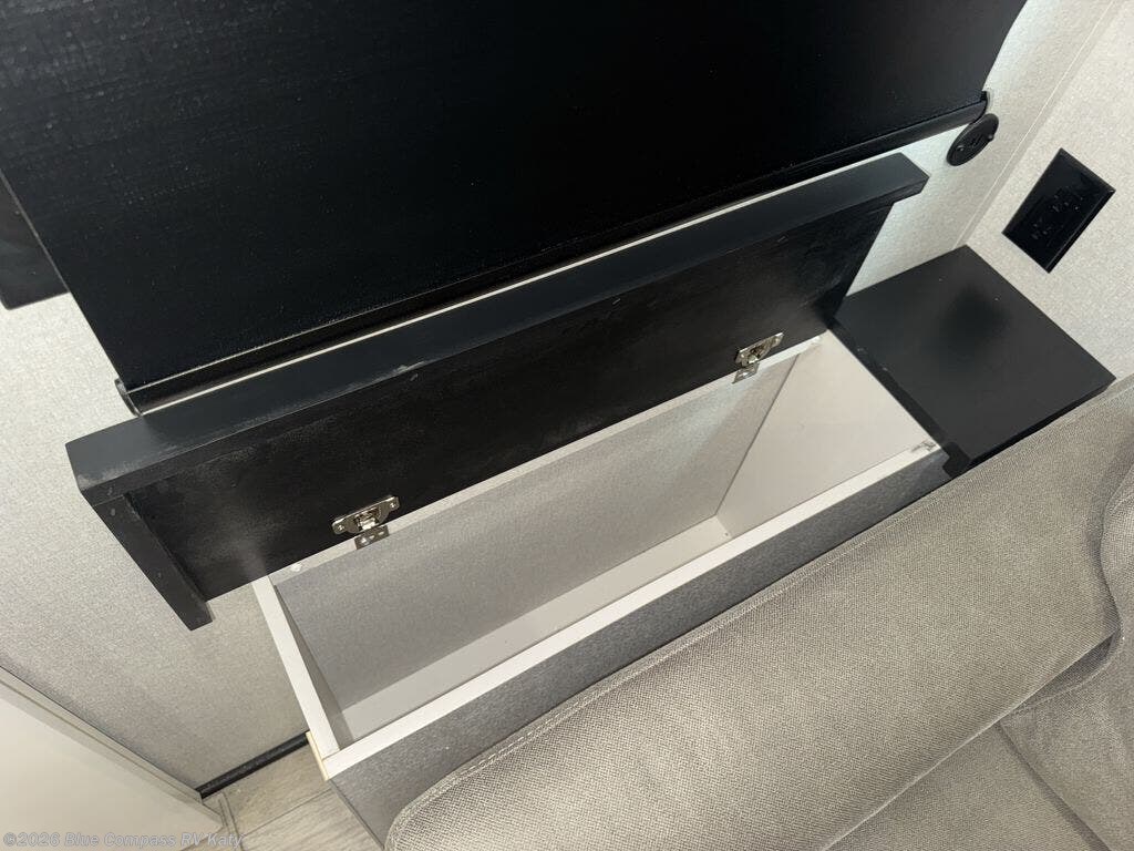 Trips to the lake are made comfortable in this triple slide out fifth wheel. Once you arrive at the campground, set up the two power awnings with LED lights, and there is an exterior TV for the big game. Head inside to relax on the theater seats directly across from the TV and fireplace or play a game at the roll-top dinette. The chef of your group will love this kitchen with its residential refrigerator, kitchen island, and pantry, plus additional storage for canned goods or paper products. The full bath will allow you to stay clean throughout your trip, you'll find a walk-in shower with teak seat, linen shelves above the bath and a medicine cabinet. Nothing says luxury like your own king bed slide out in the front bedroom, a large front closet with hamper and drawers for wrinkle-free clothes, and a flip-up dresser featuring a 32" TV!