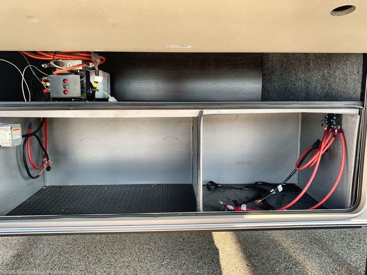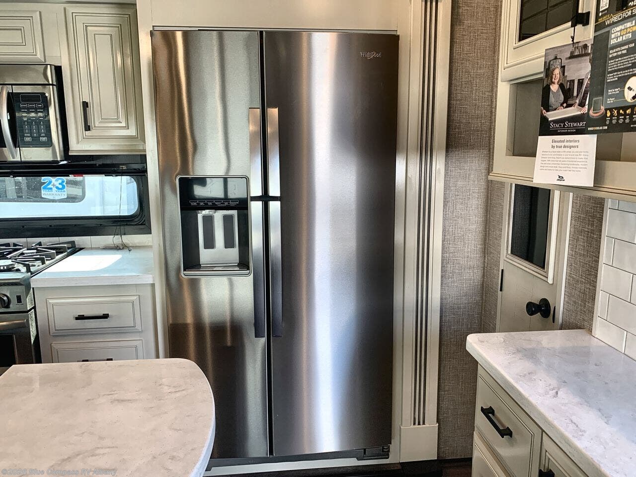 Trips to the lake are made comfortable in this triple slide out fifth wheel. Once you arrive at the campground, set up the two power awnings with LED lights, and there is an exterior TV for the big game. Head inside to relax on the theater seats directly across from the TV and fireplace or play a game at the roll-top dinette. The chef of your group will love this kitchen with its residential refrigerator, kitchen island, and pantry, plus additional storage for canned goods or paper products. The full bath will allow you to stay clean throughout your trip, you'll find a walk-in shower with teak seat, linen shelves above the bath and a medicine cabinet. Nothing says luxury like your own king bed slide out in the front bedroom, a large front closet with hamper and drawers for wrinkle-free clothes, and a flip-up dresser featuring a 32" TV!