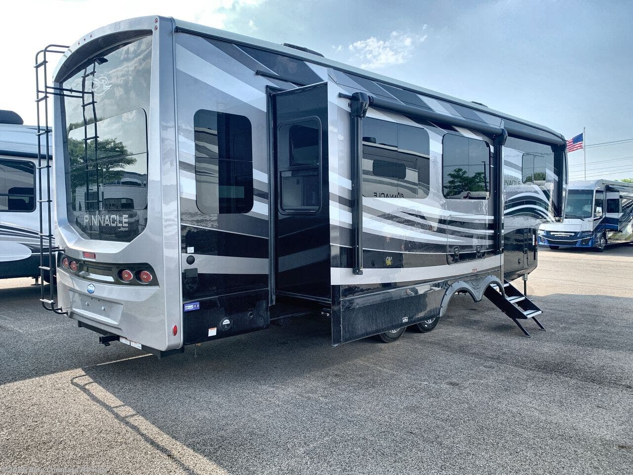 Each Pinnacle fifth wheel features Stronghold VBL lamination for the lightest, yet strongest construction in the RV industry. Add that to the Magnum Truss XL6 roof system and Climate Shield zero-degree tested weather protection and you'll be enjoying your fifth wheel even in harsh weather. Some of the exterior conveniences you will appreciate are the Keyed-Alike lock system, the fully enclosed, universal docking center, and the 6-point hydraulic auto-leveling system for quick and easy set up. The 5 Star Handling Package will make towing a fifth wheel a walk in the park, and the two Whisper Quiet A/C units will keep you comfortable during the hot summer months. Inside, you'll enjoy the residential "Do it all" sink, the solid hardwood cabinet doors, stiles, and fascia, the vinyl flooring throughout, plus many more comforts. There is even a central vacuum system, a wireless remote-control system, 12V charging station, plus many more conveniences to make each trip enjoyable.